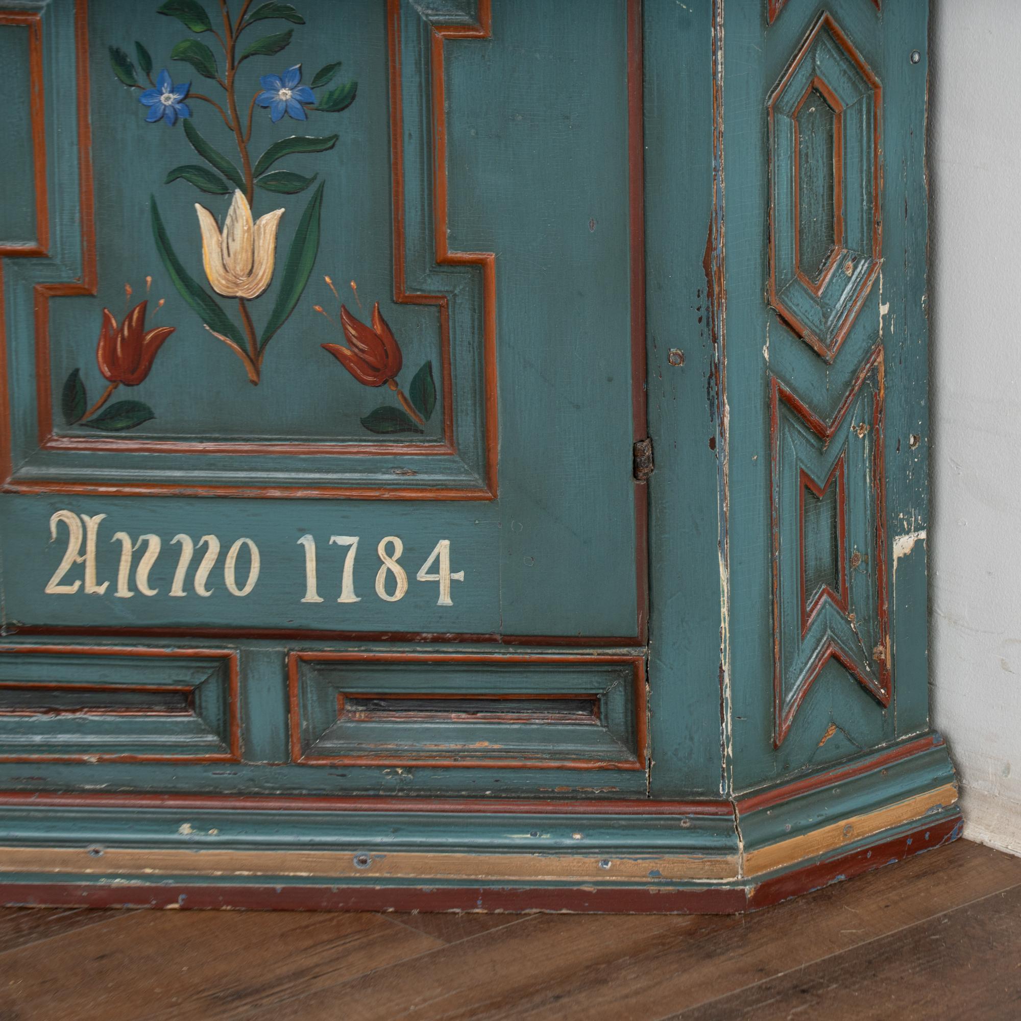 Low corner cabinet from Sweden with original painted finish scraped to reveal layers of green, brick red and white as well as the natural pine below resulting in attractive, warm patina.