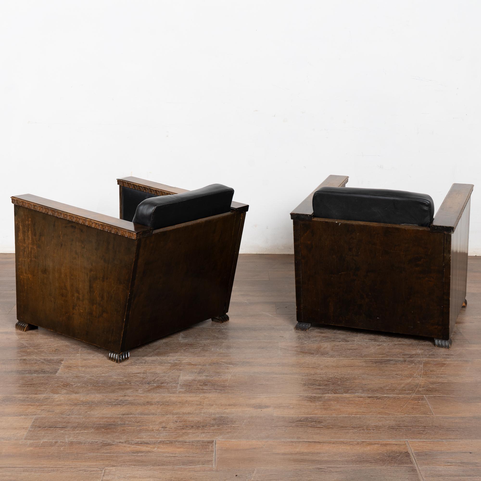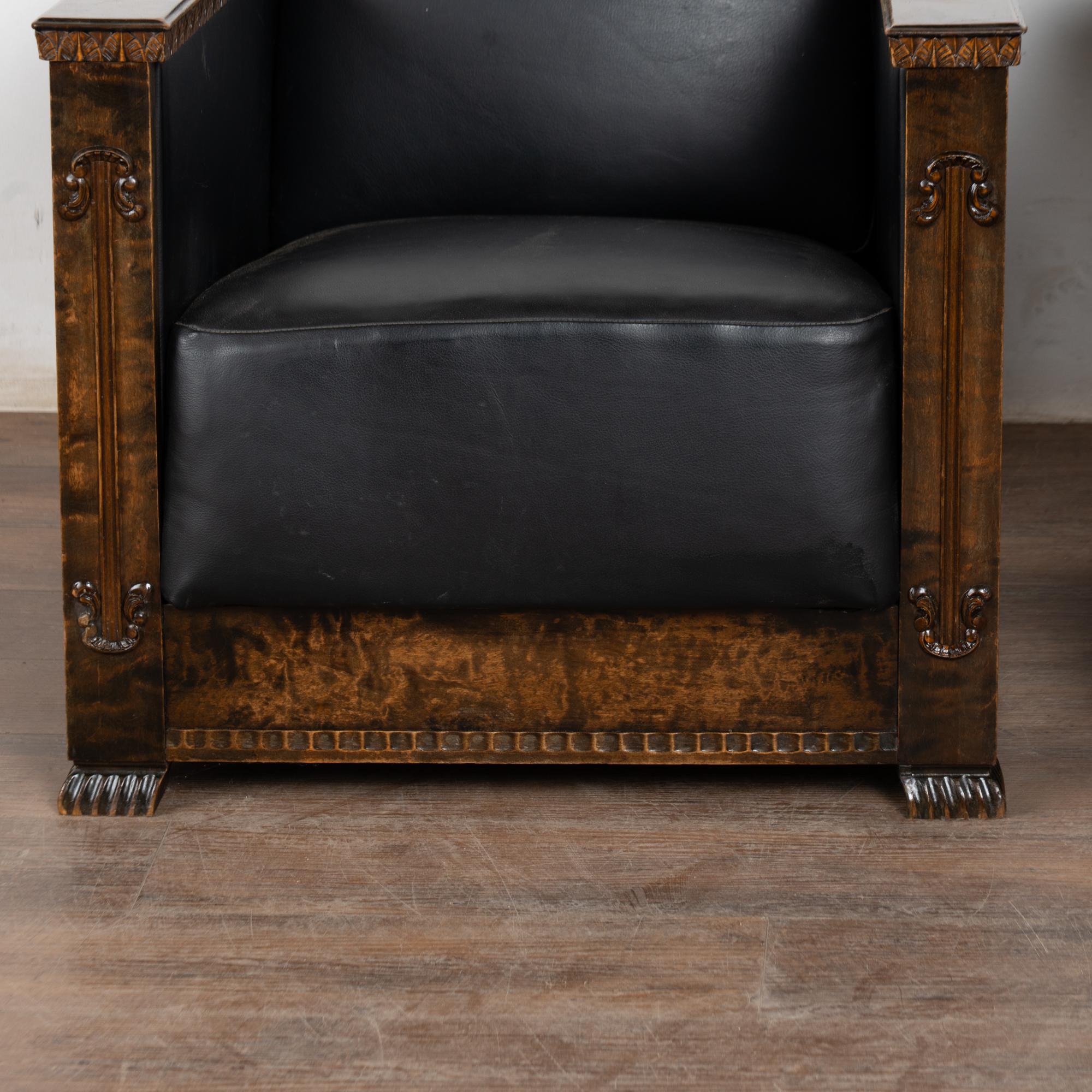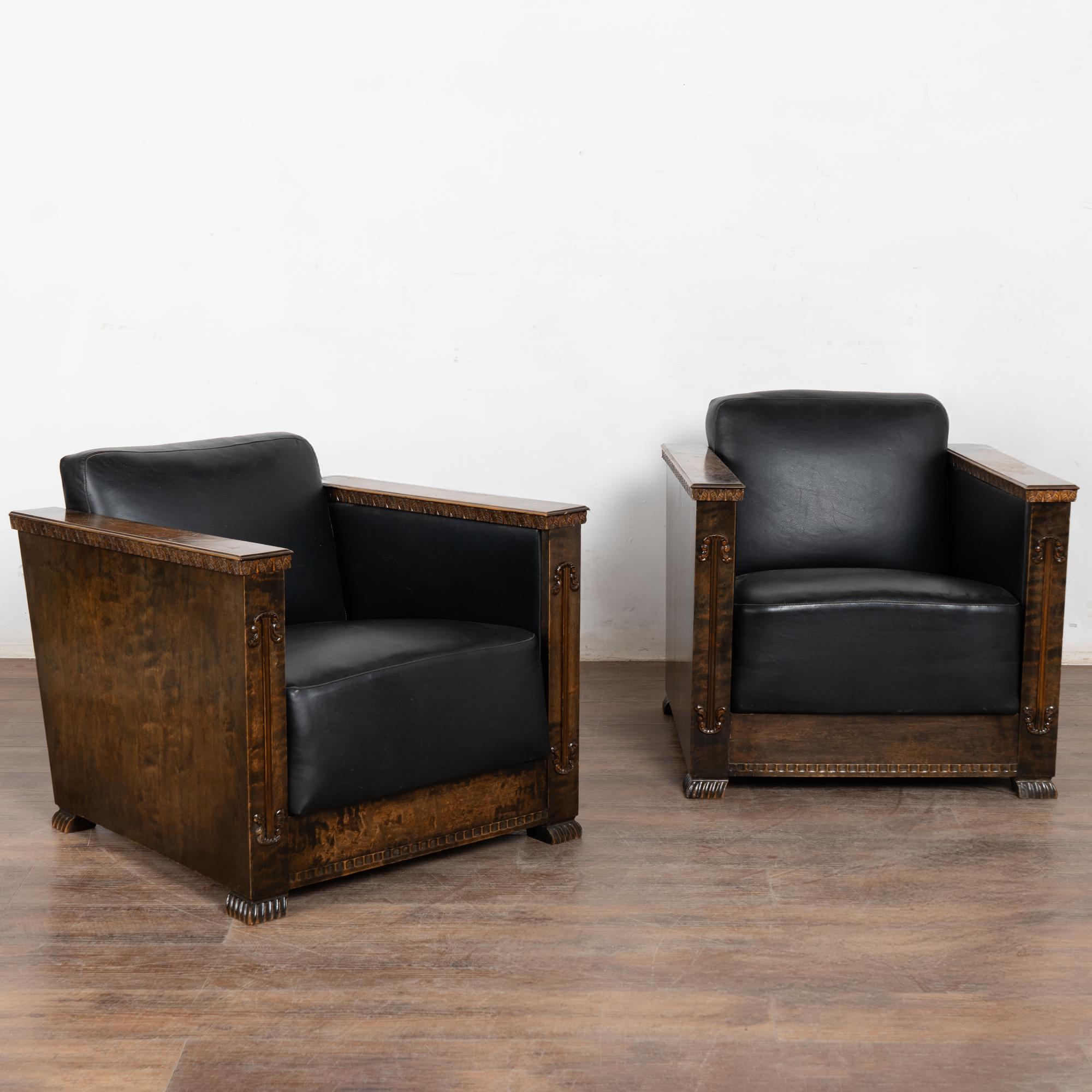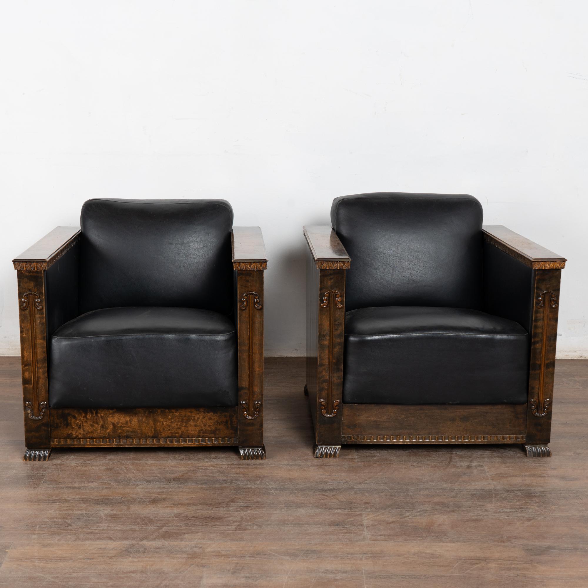 This handsome pair of club chairs shows off the attractive birch grain, distinctive carved details and feet. Original leather upholstery.