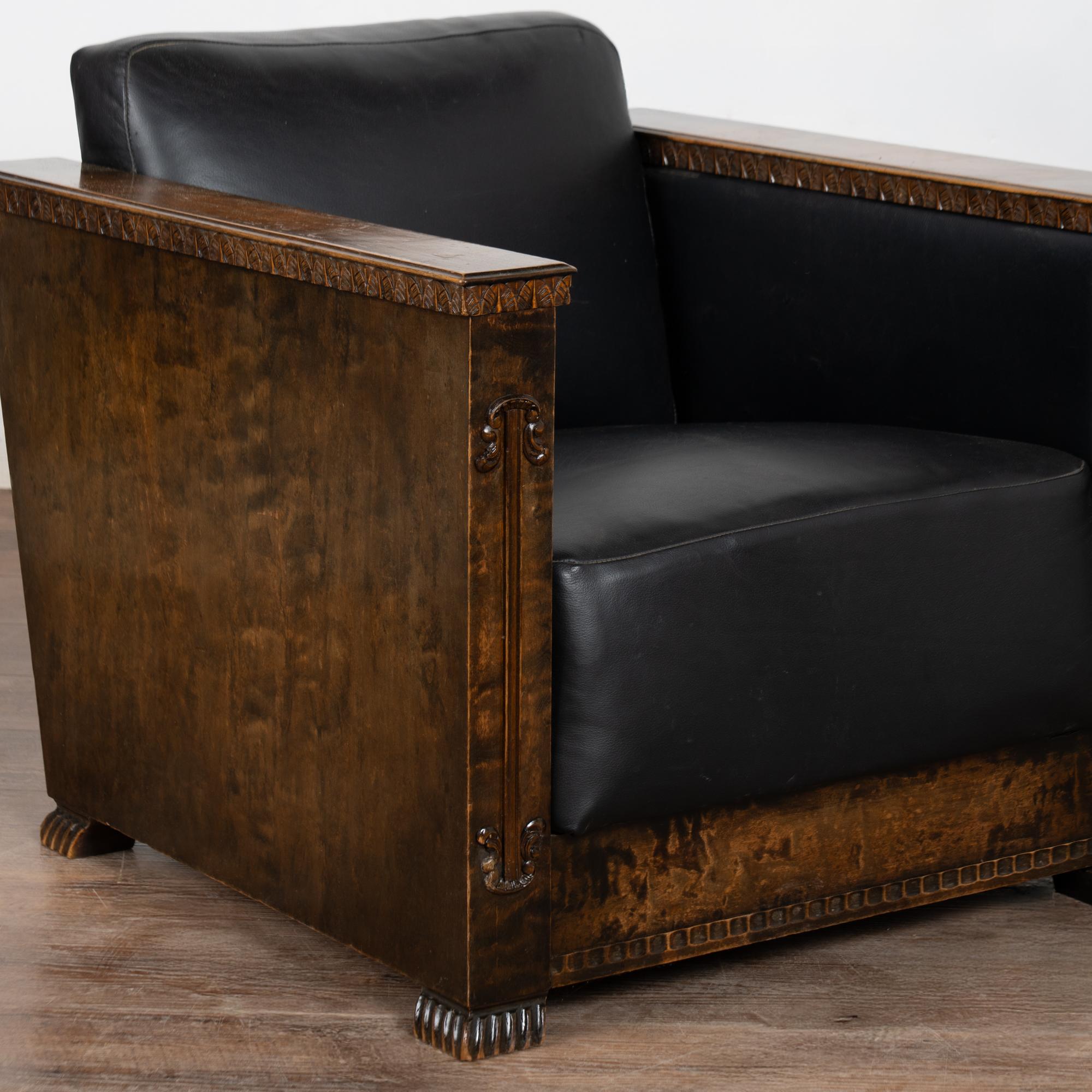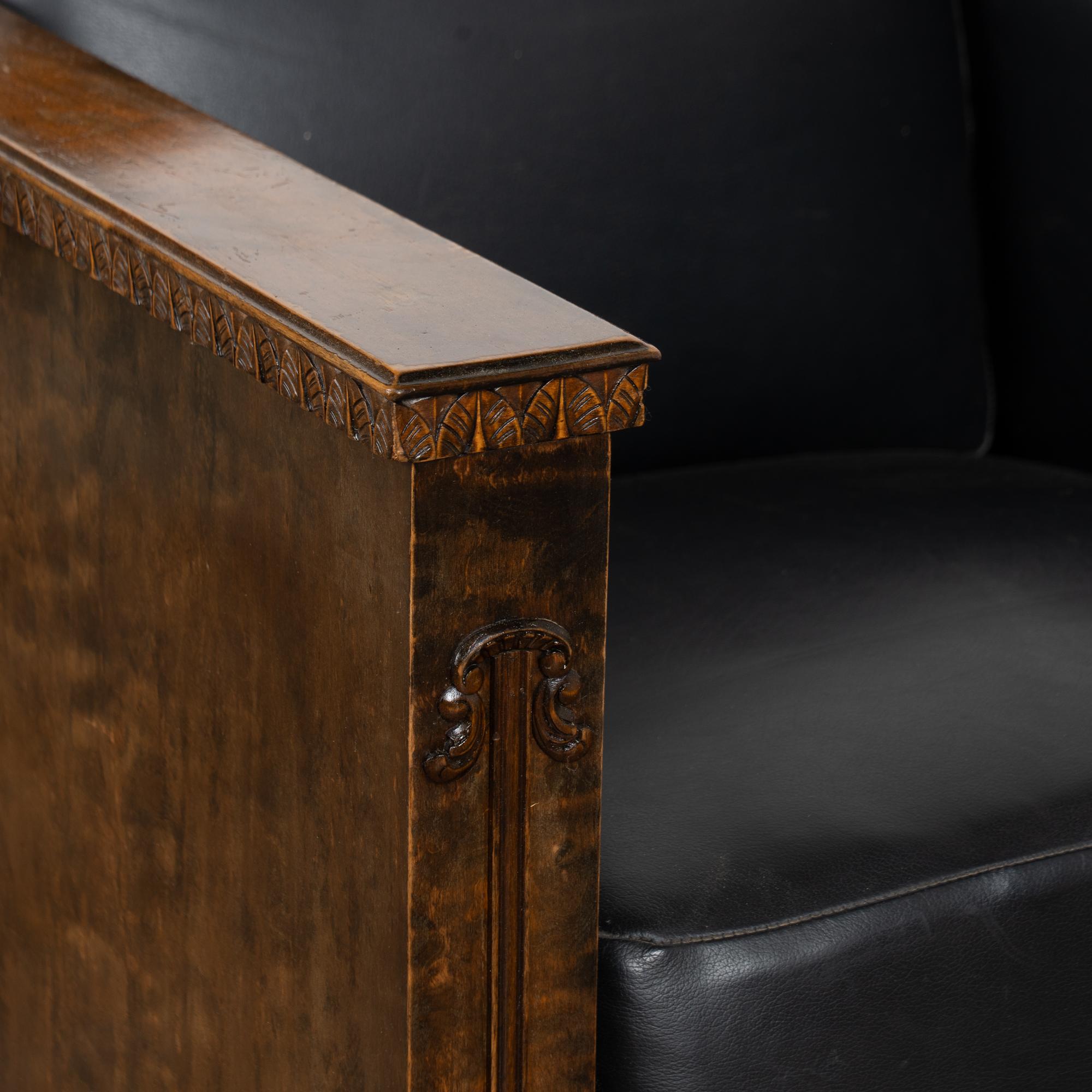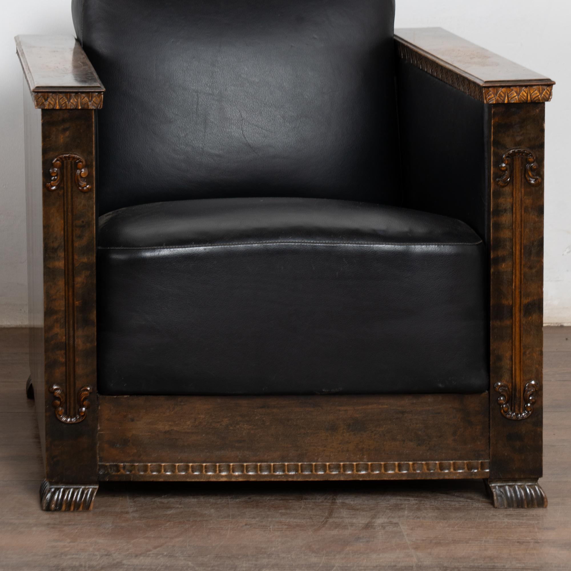 This handsome pair of club chairs shows off the attractive birch grain, distinctive carved details and feet. Original leather upholstery.
