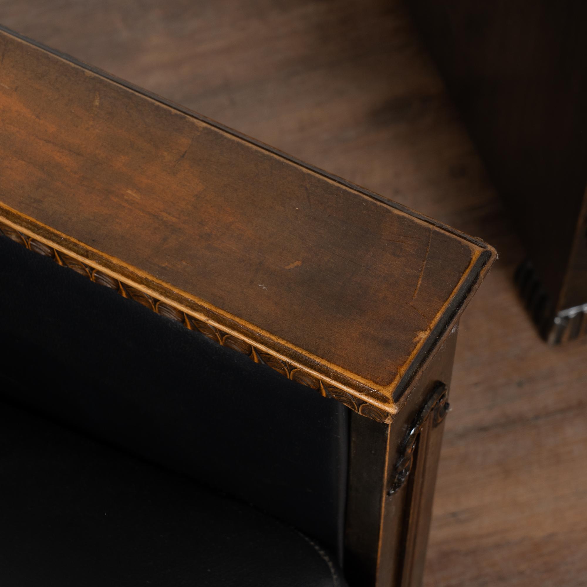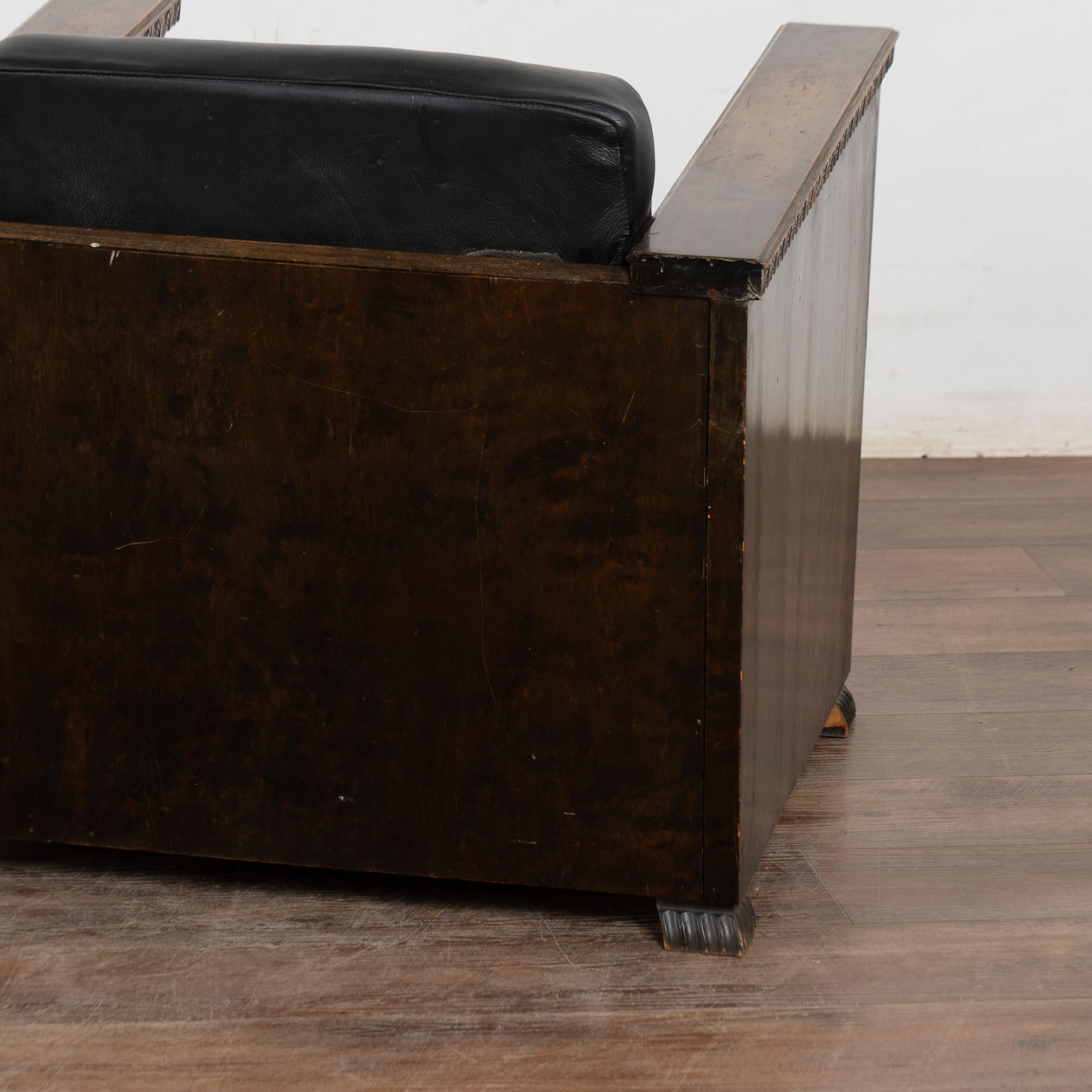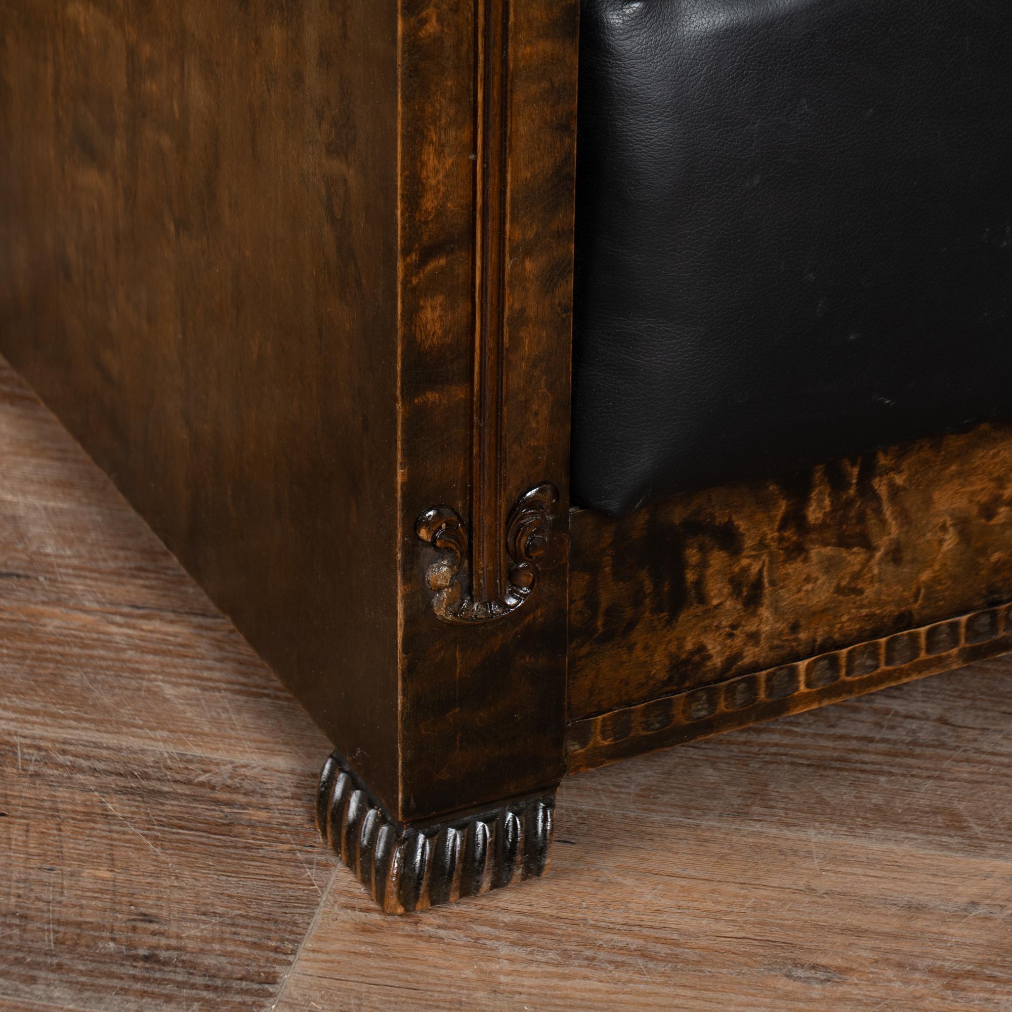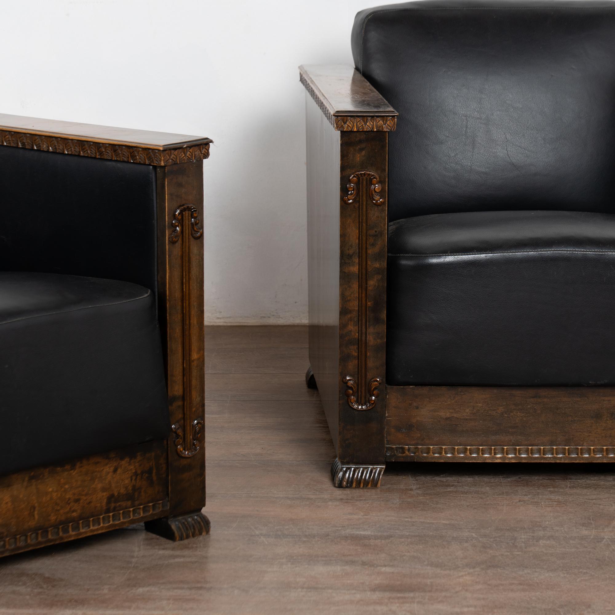 This handsome pair of club chairs shows off the attractive birch grain, distinctive carved details and feet. Original leather upholstery.