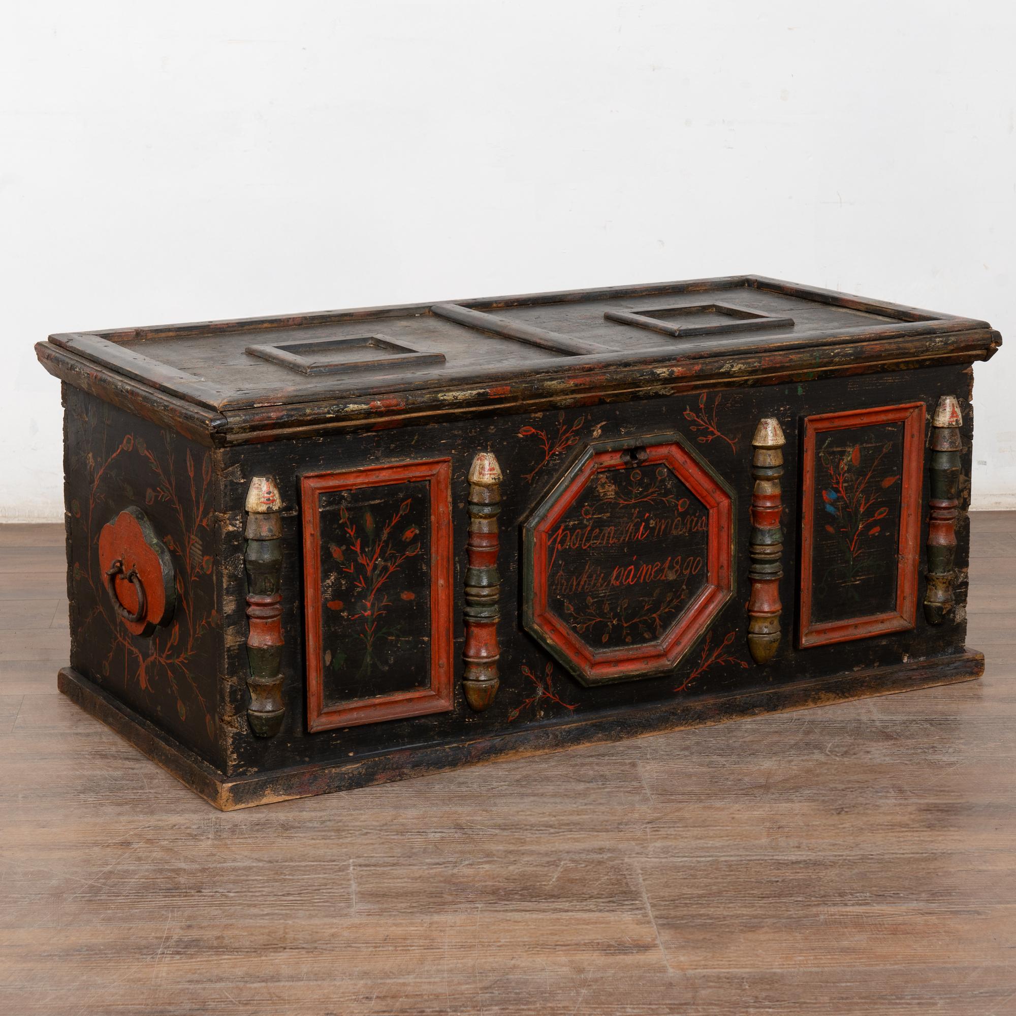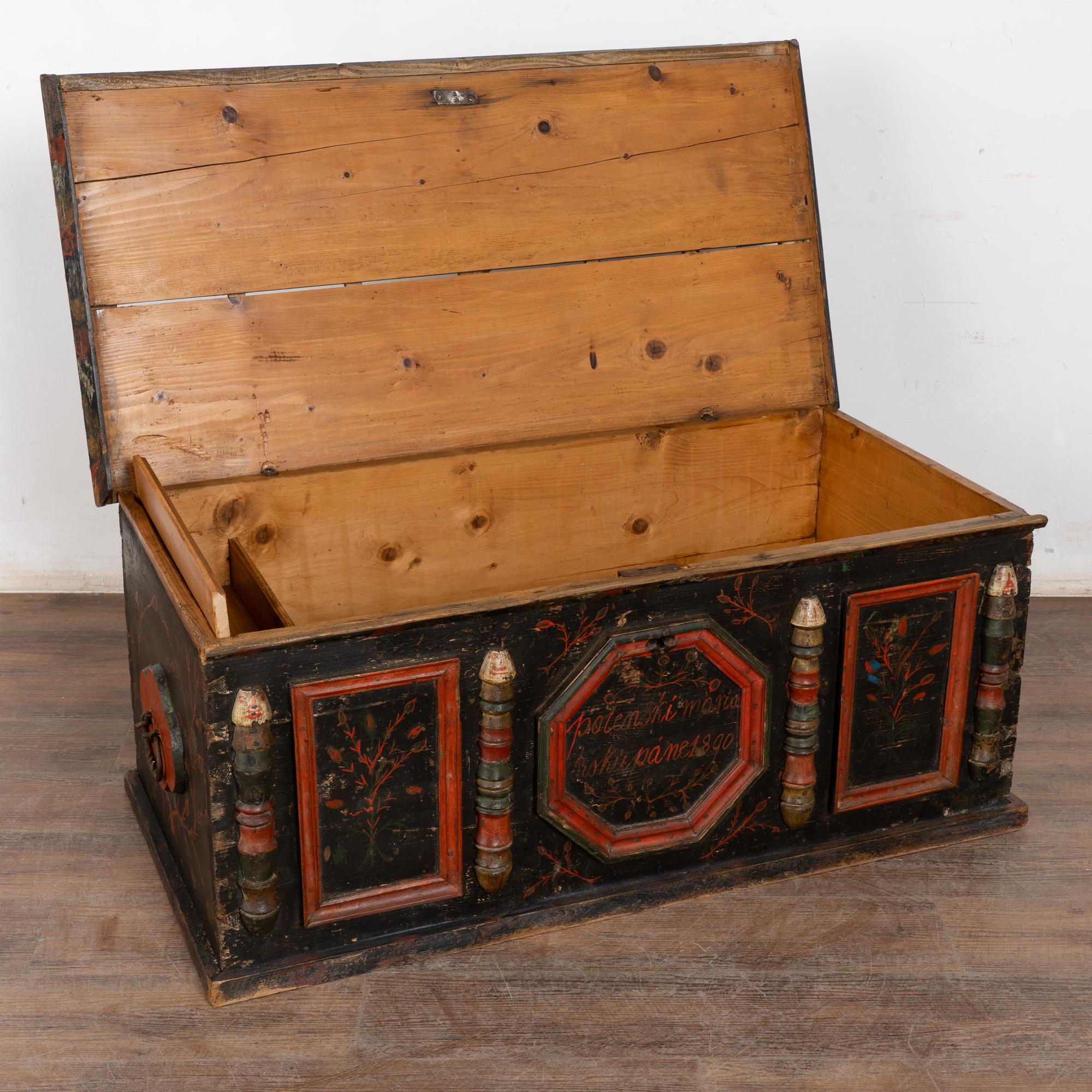 The painted finish is all original on this rustic flat top trunk. The background color is a dark blue, almost appearing black in certain lighting.