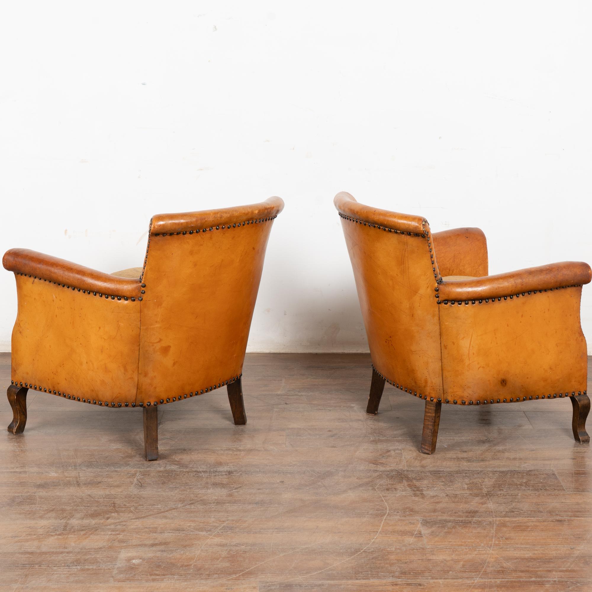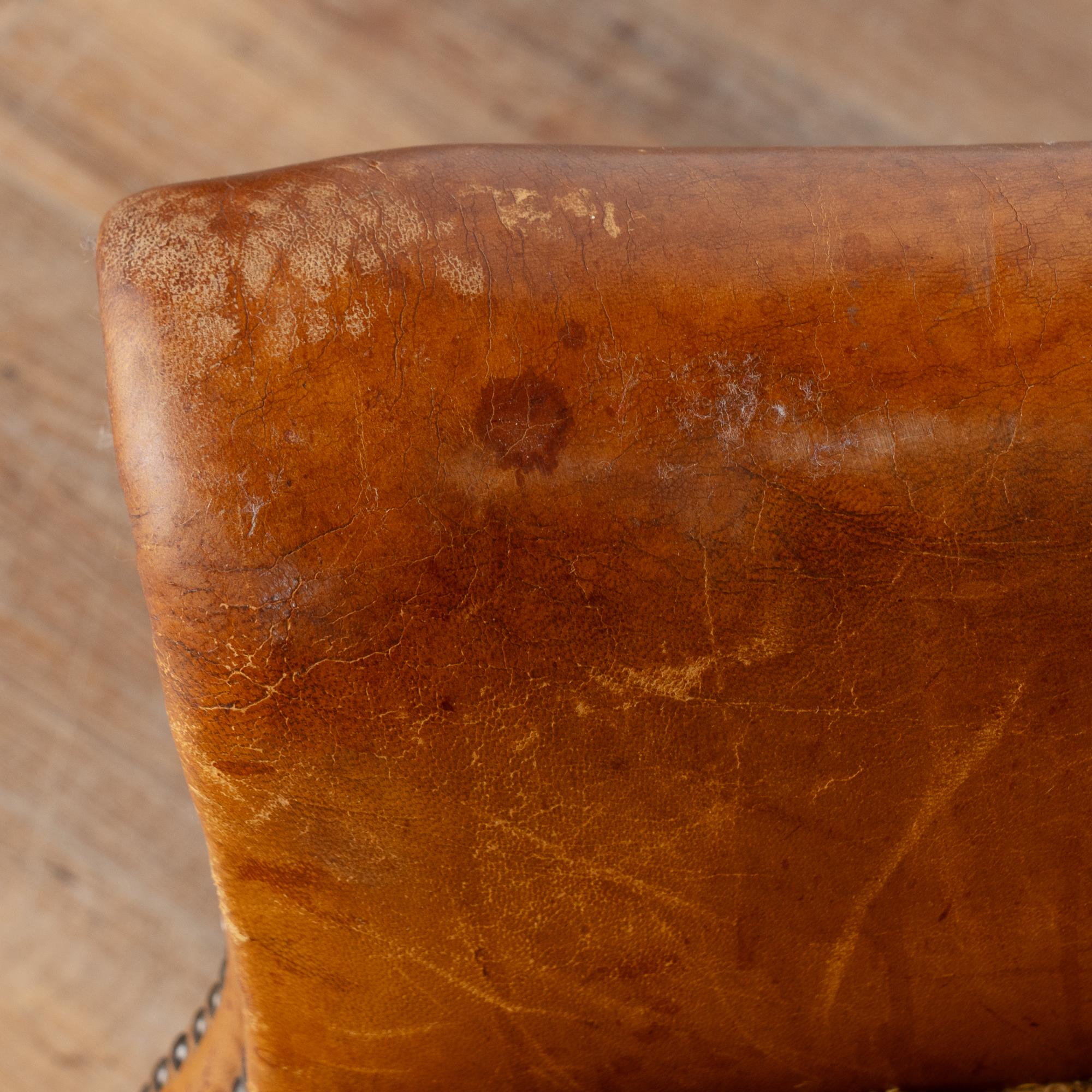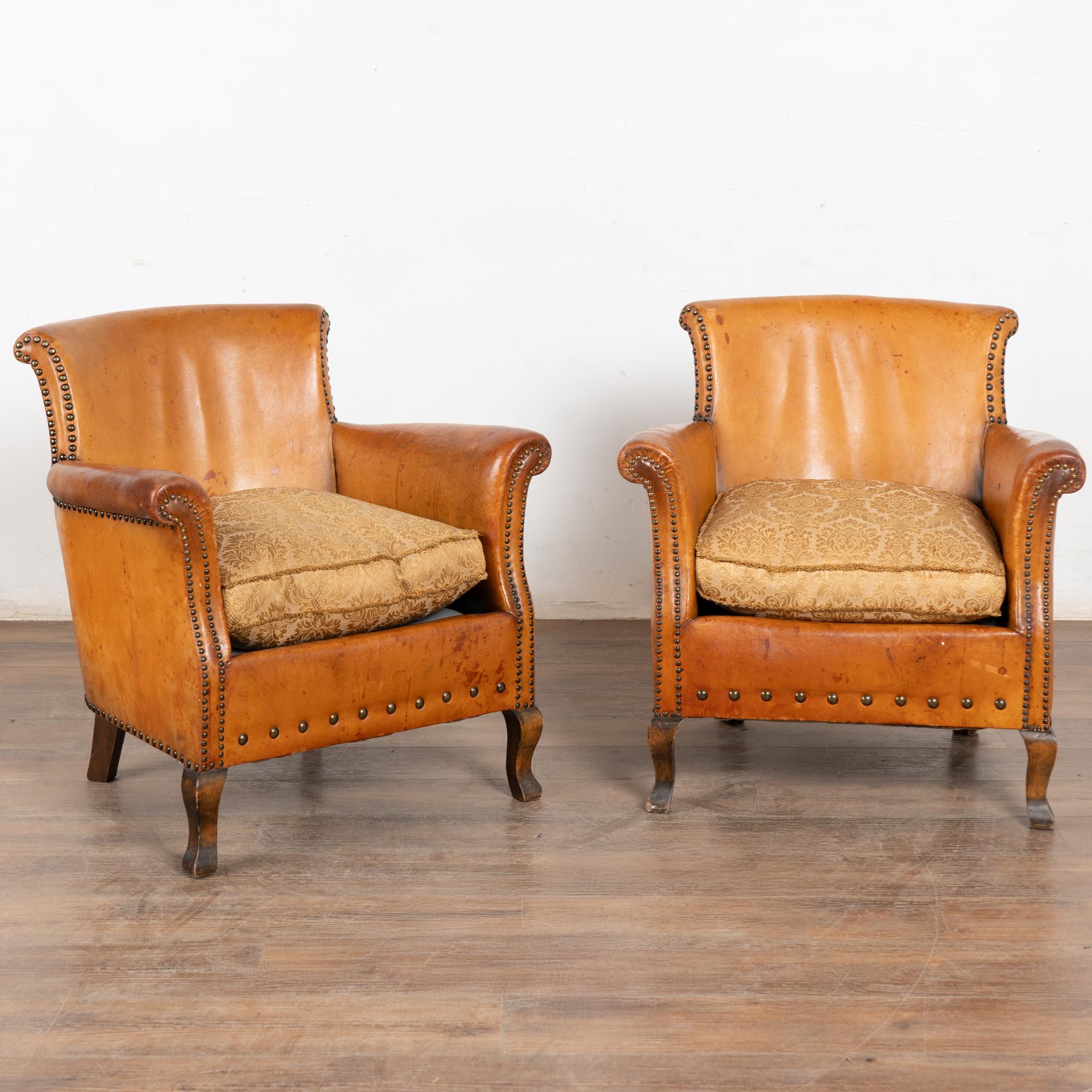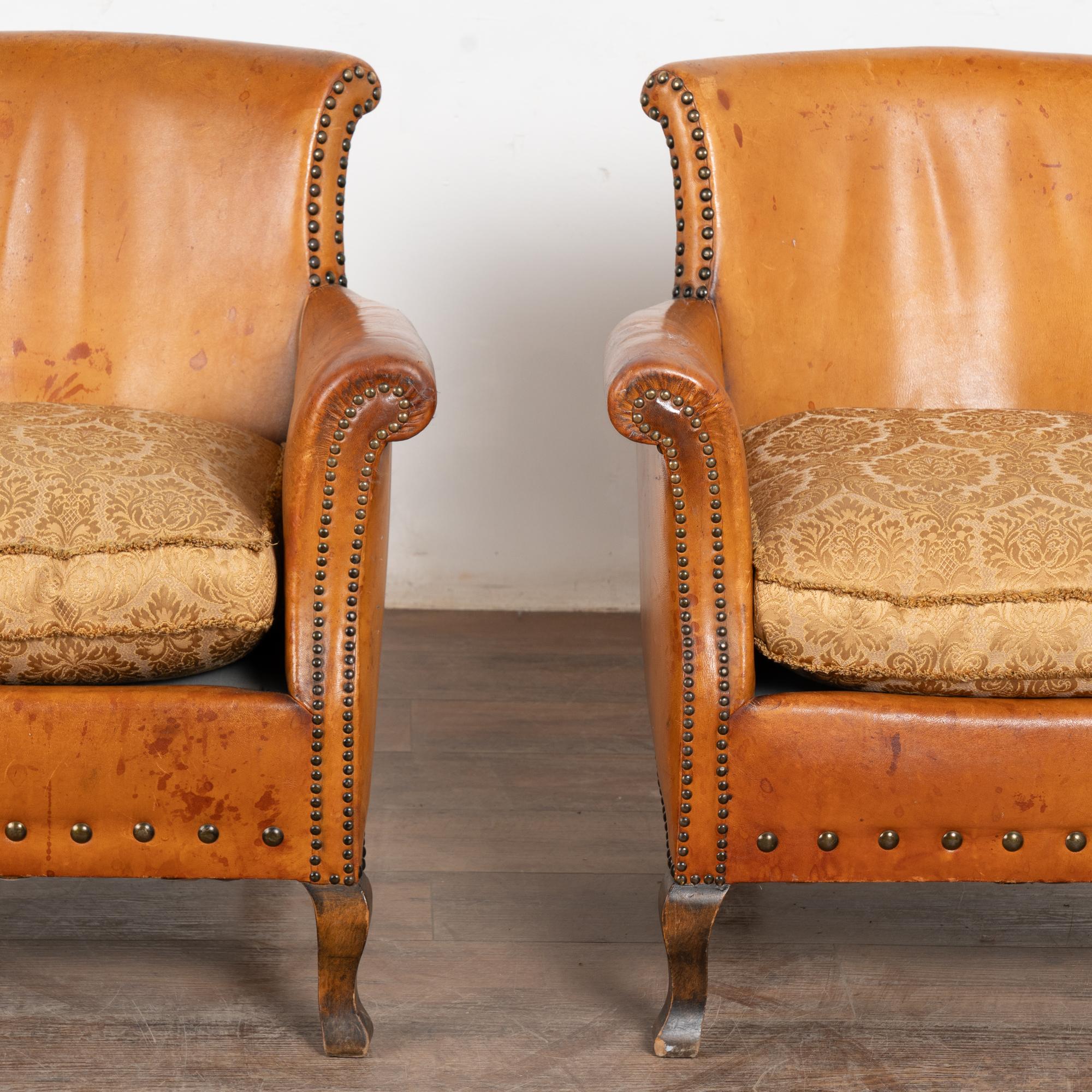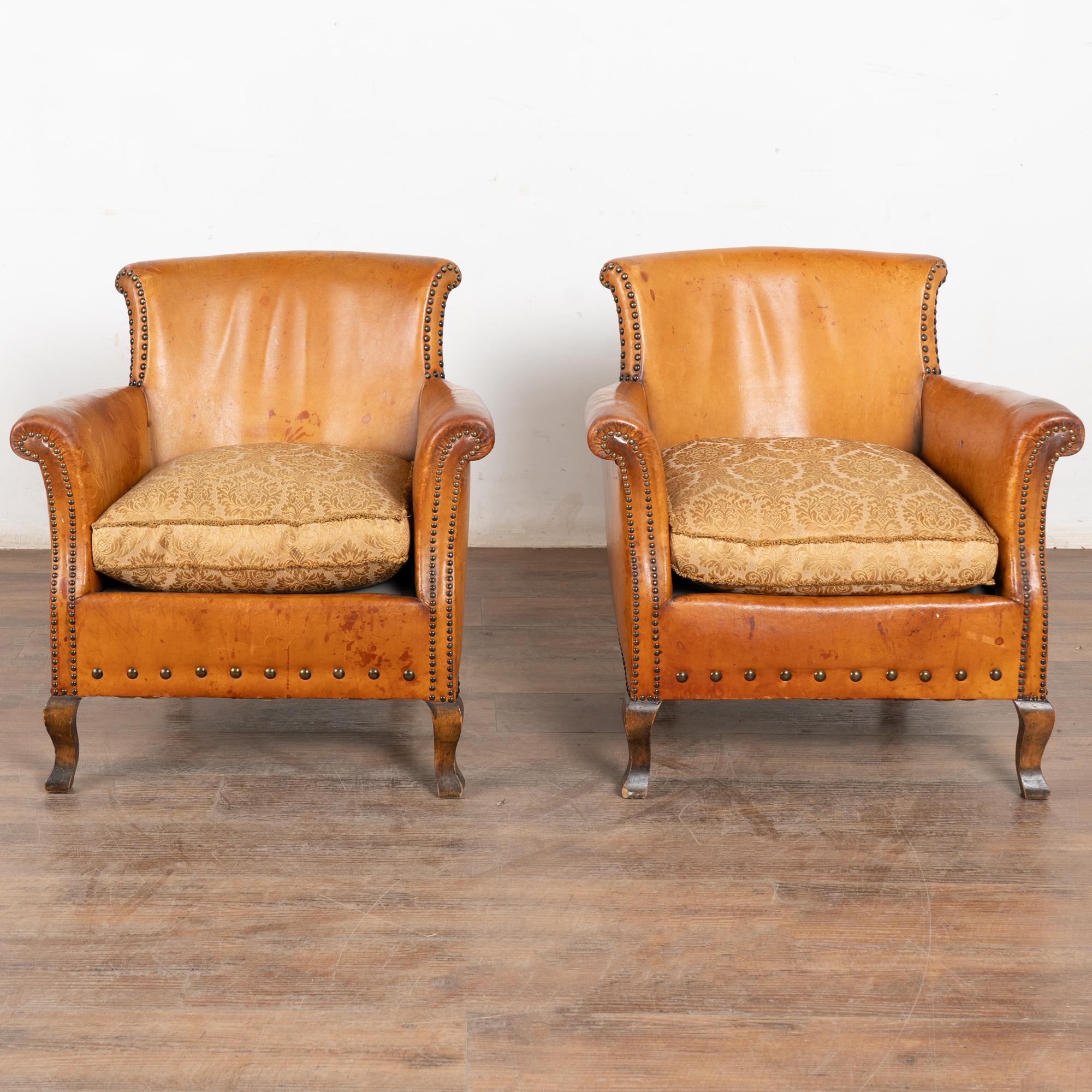 Expected age related stains, scratches, scuff marks, tear to seat bottom (to be replaced by upholsterer), impressions etc.; this pair of club chairs will benefit from a leather conditioner.