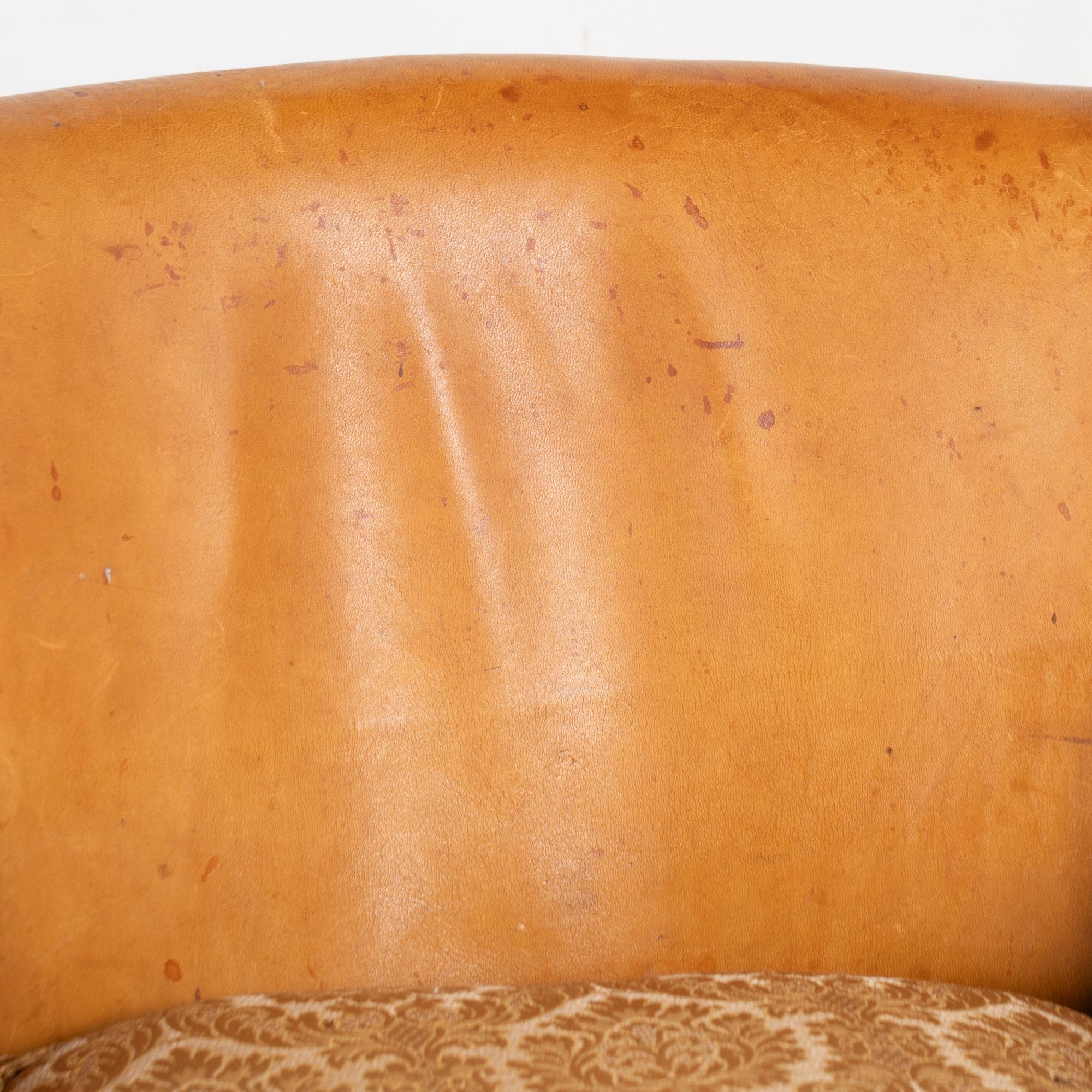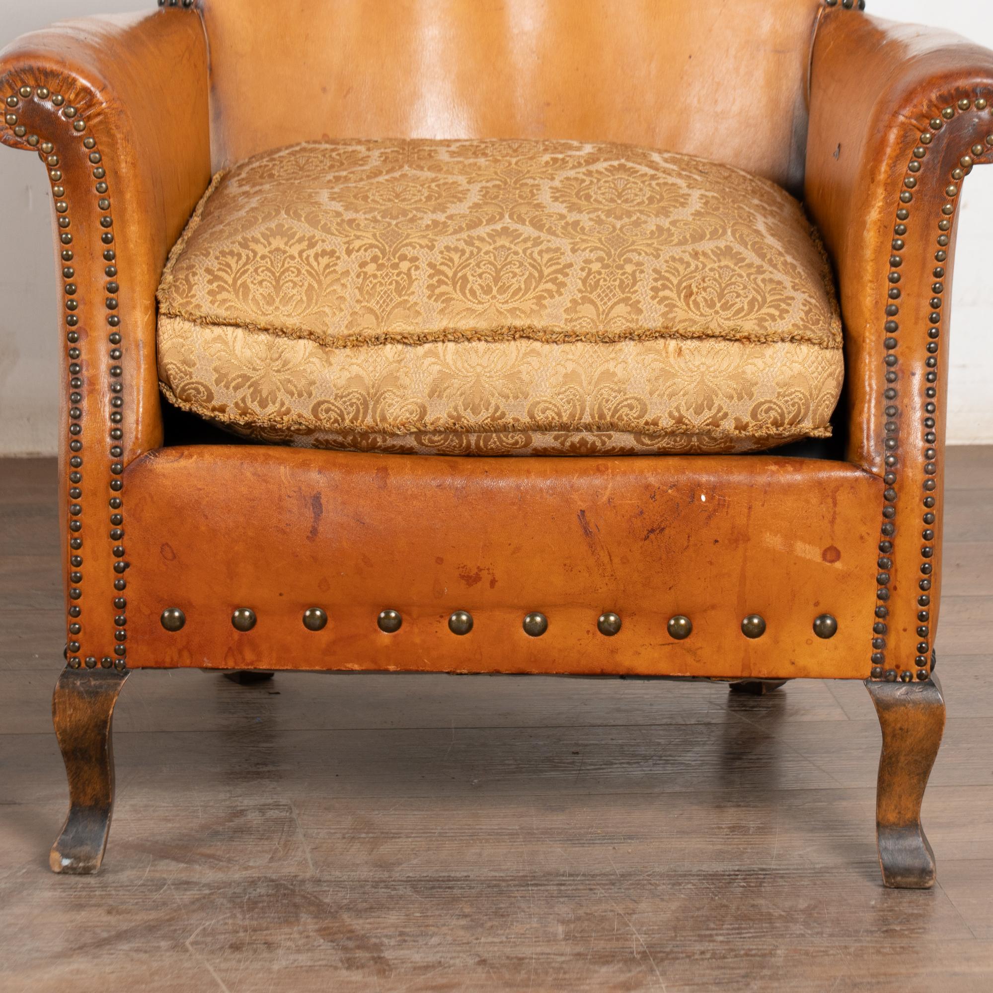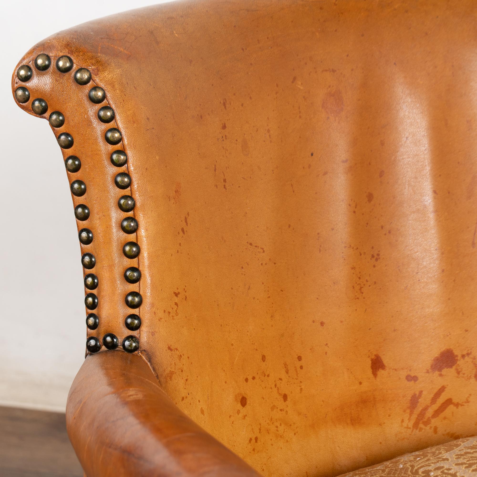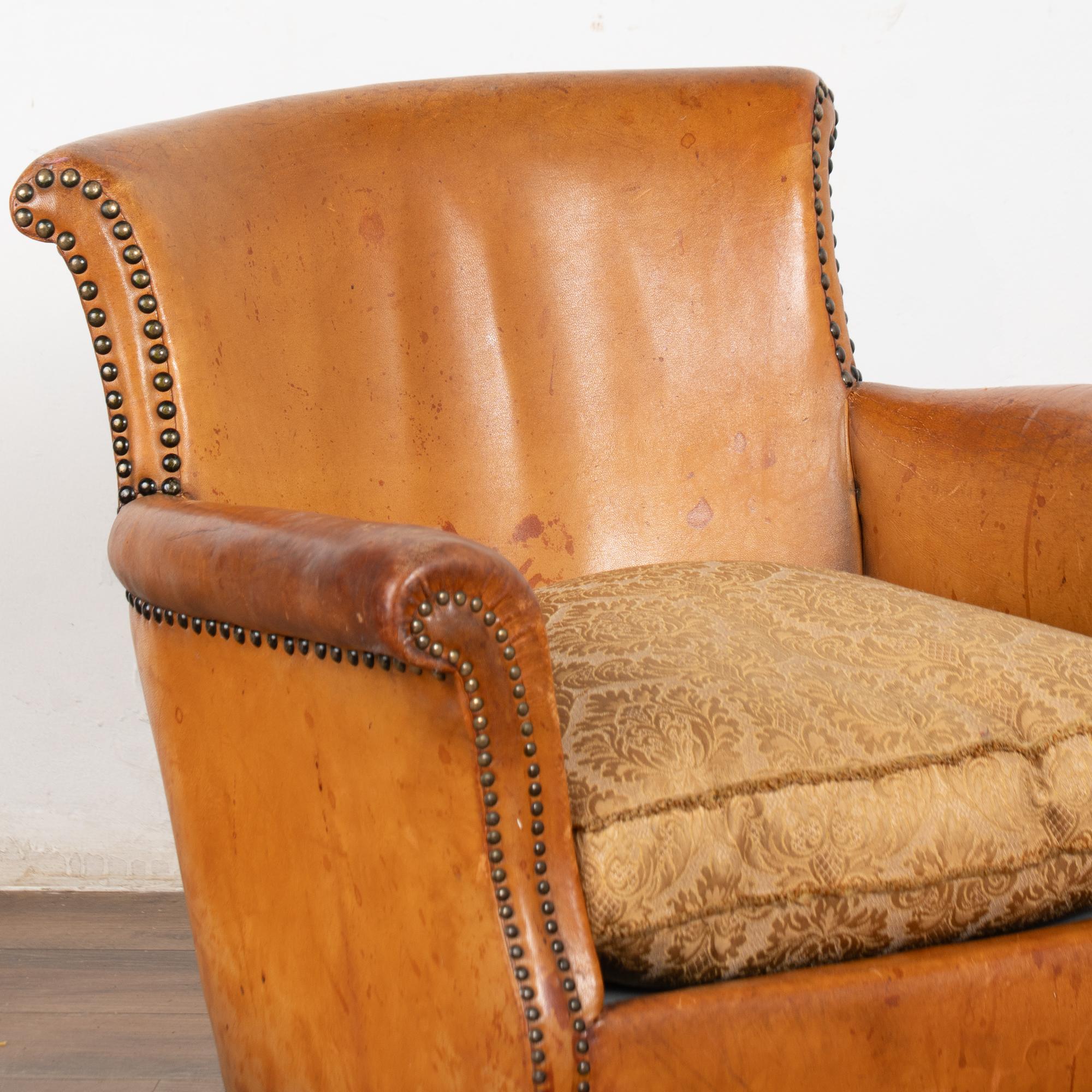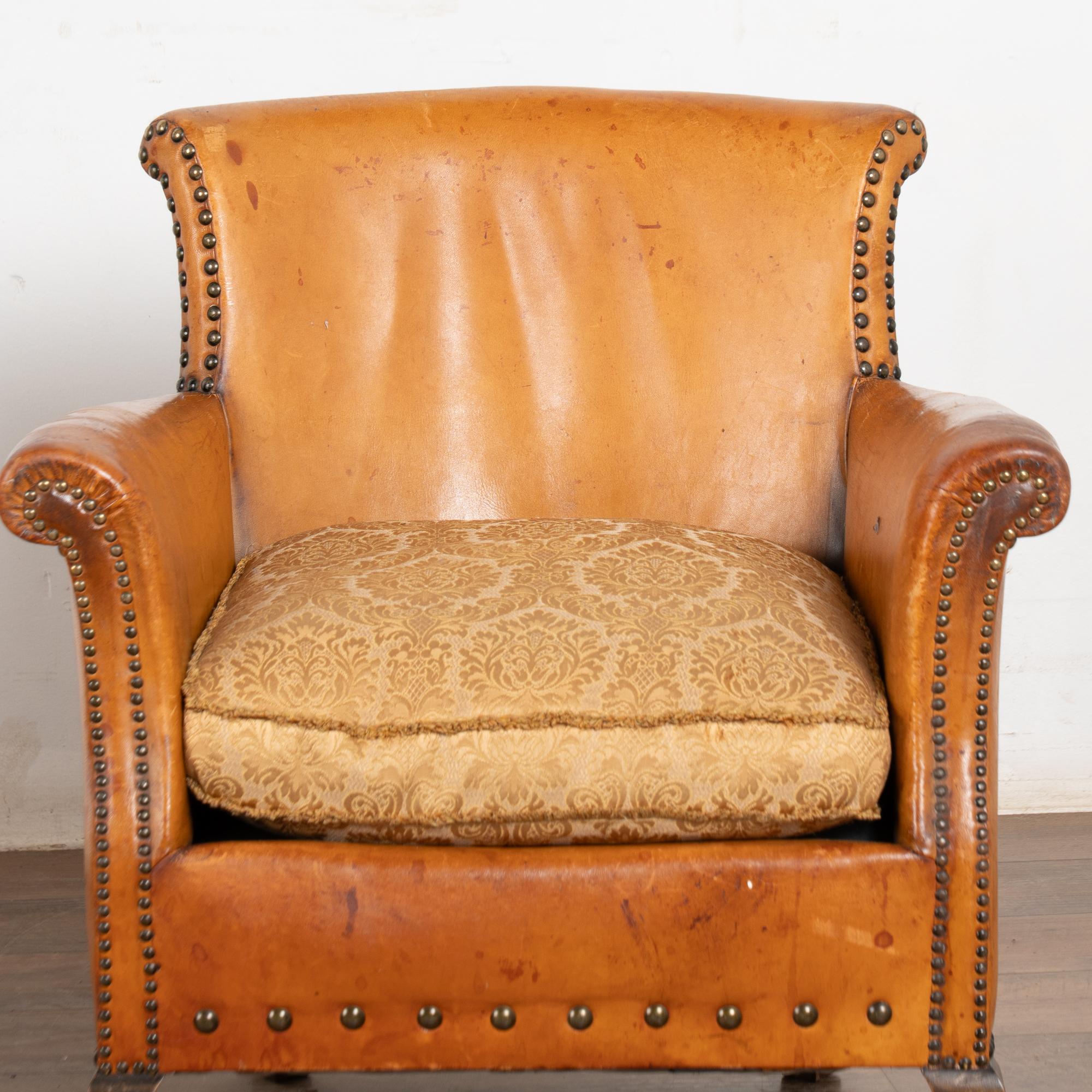 Expected age related stains, scratches, scuff marks, tear to seat bottom (to be replaced by upholsterer), impressions etc.; this pair of club chairs will benefit from a leather conditioner.