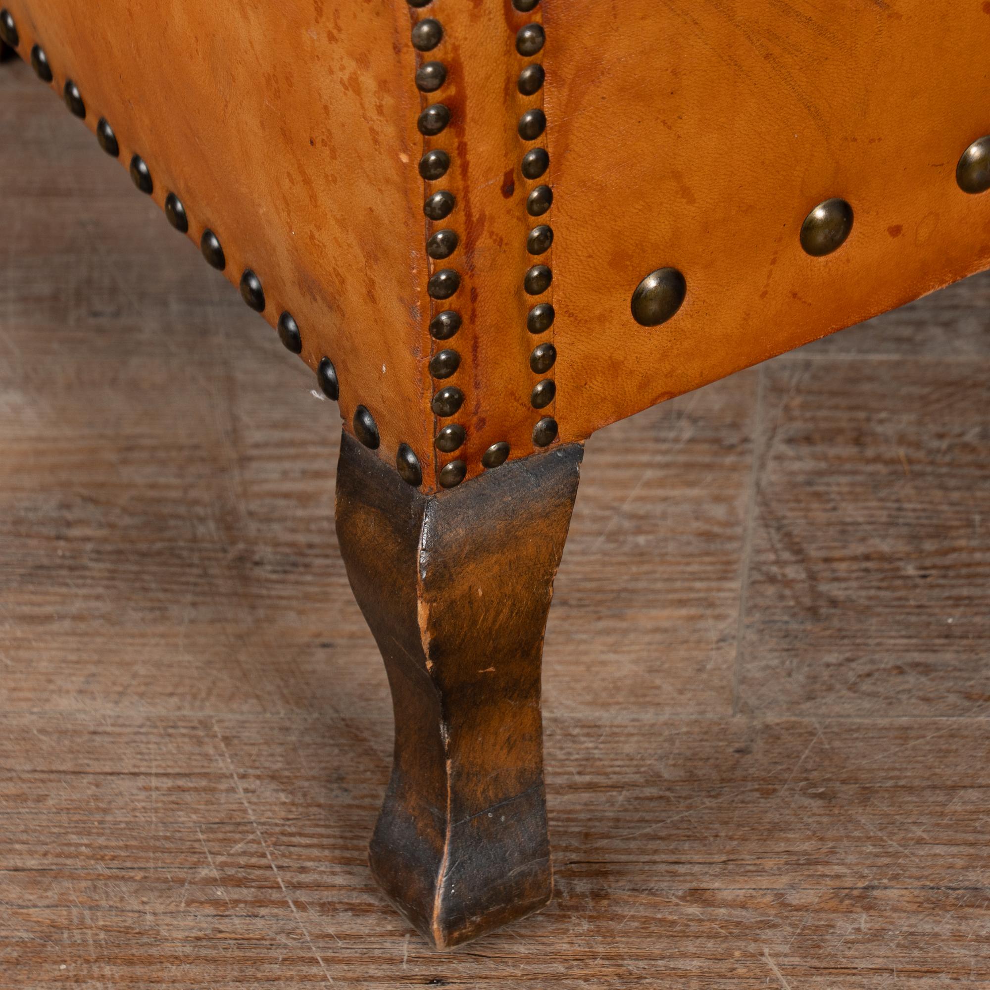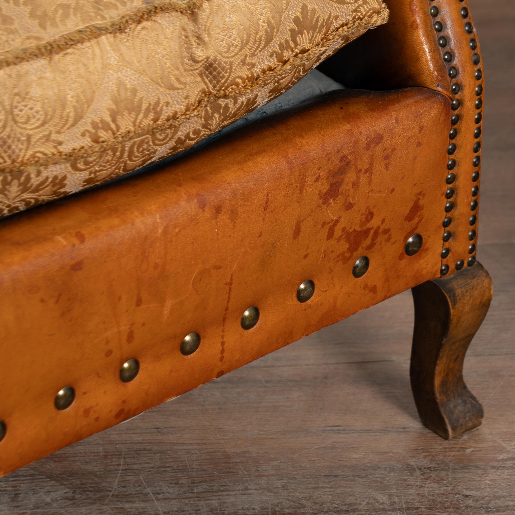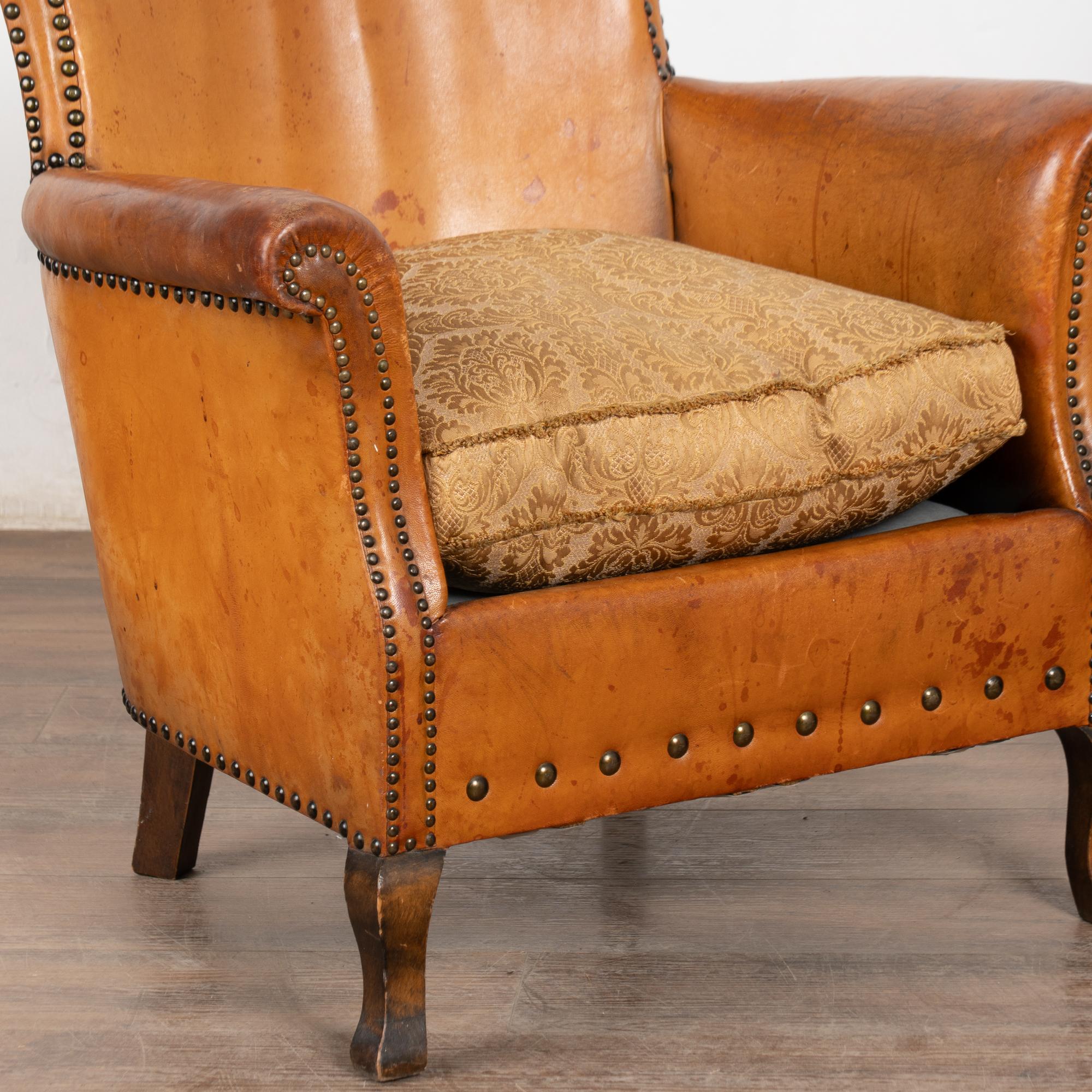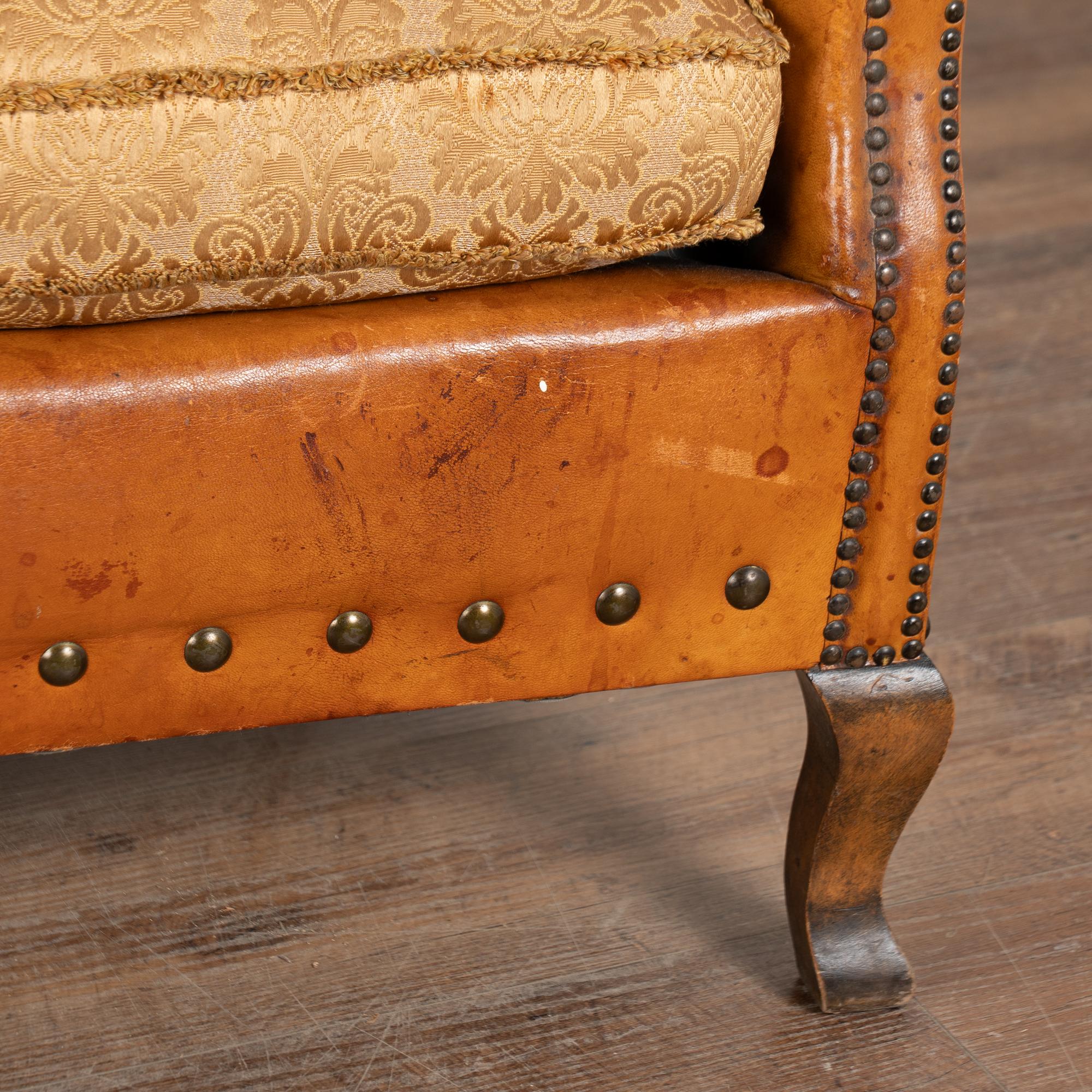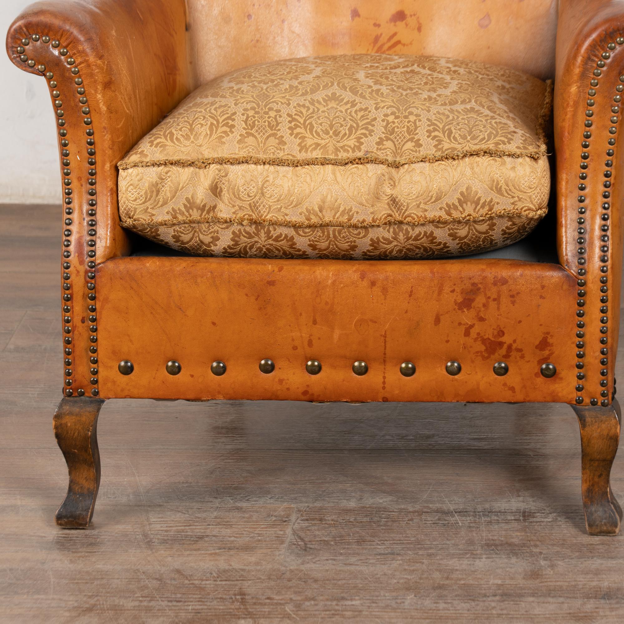 Expected age related stains, scratches, scuff marks, tear to seat bottom (to be replaced by upholsterer), impressions etc.; this pair of club chairs will benefit from a leather conditioner.