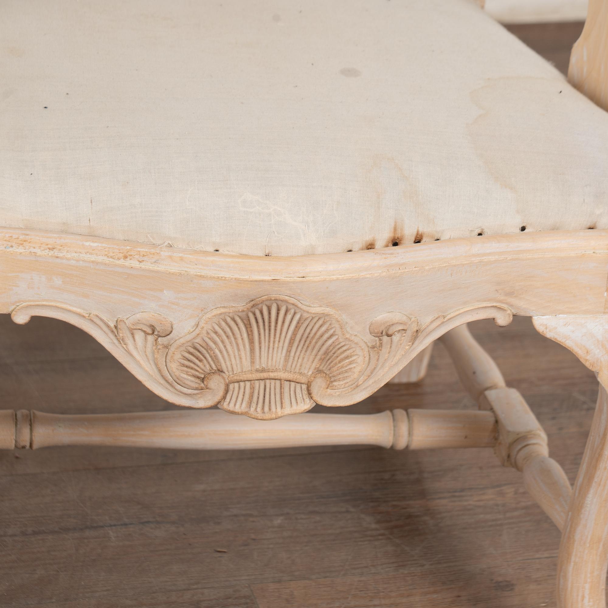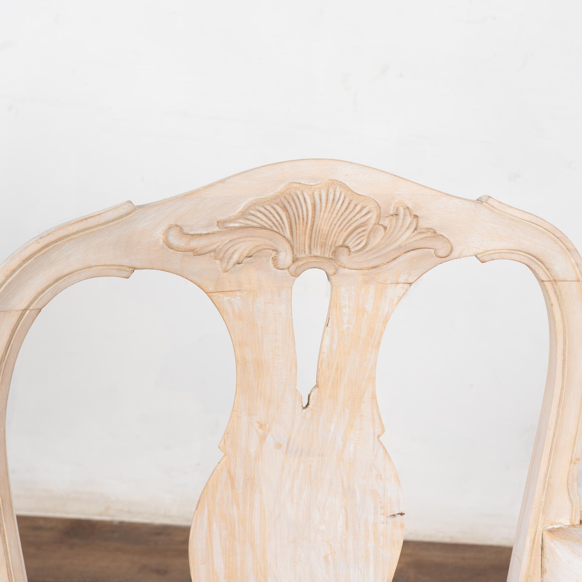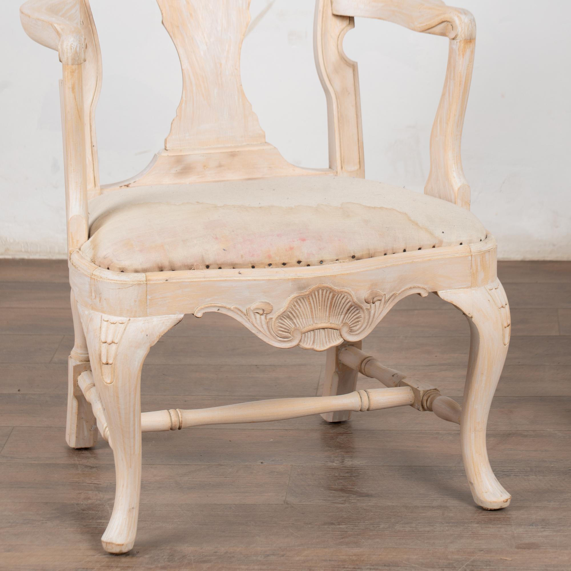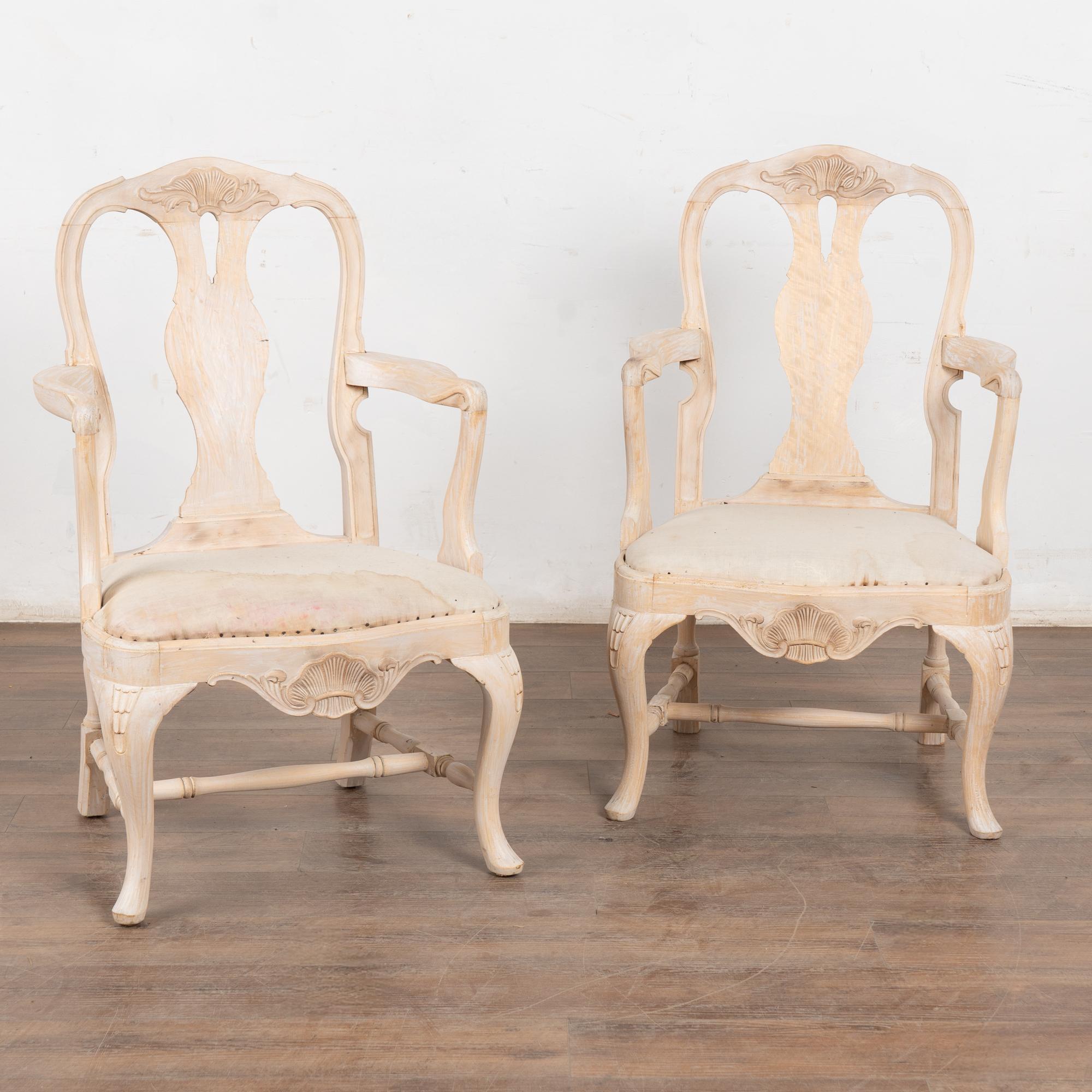 These armchairs have been given a newer, professionally painted gray layered finish which is lightly scraped creating a soft contrast with the hardwood beneath and accentuating the hand carved details along the crown, skirt, and cabriolet legs.