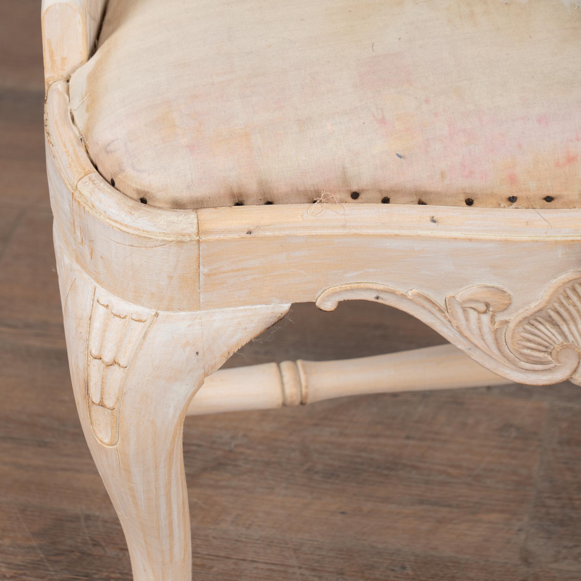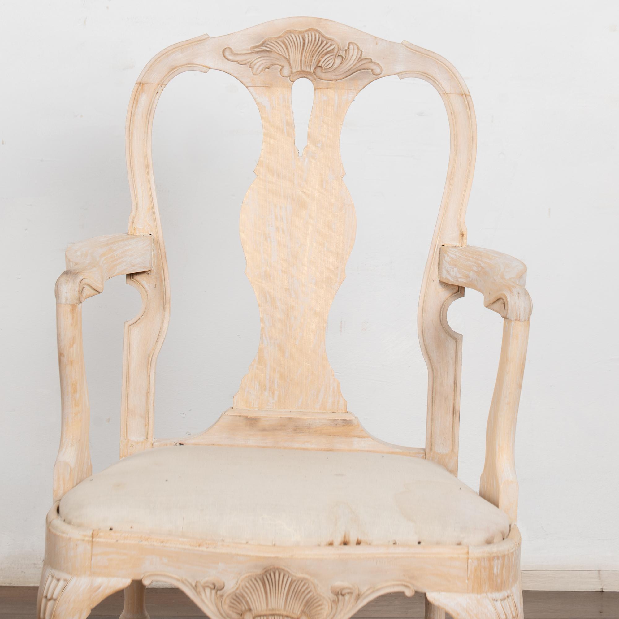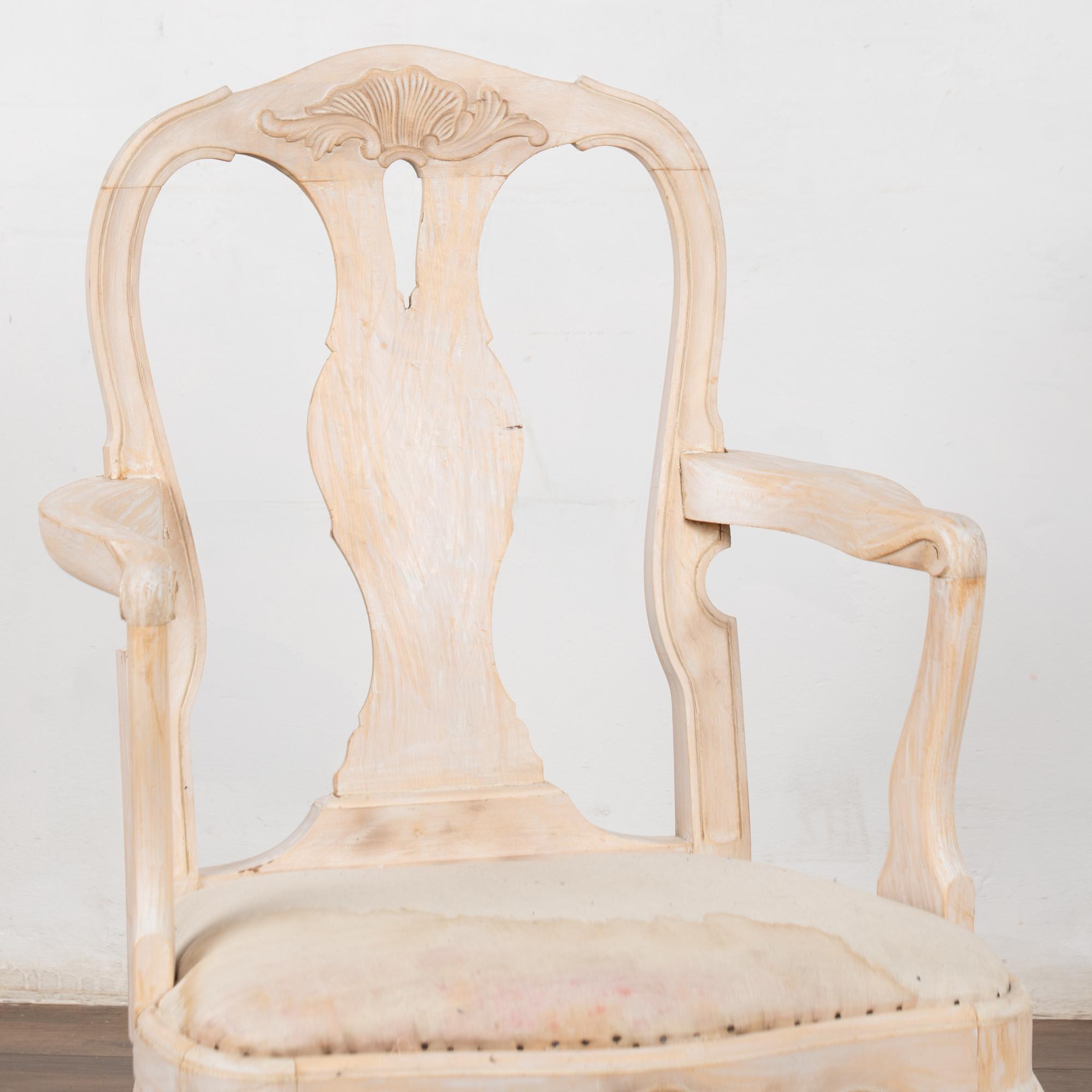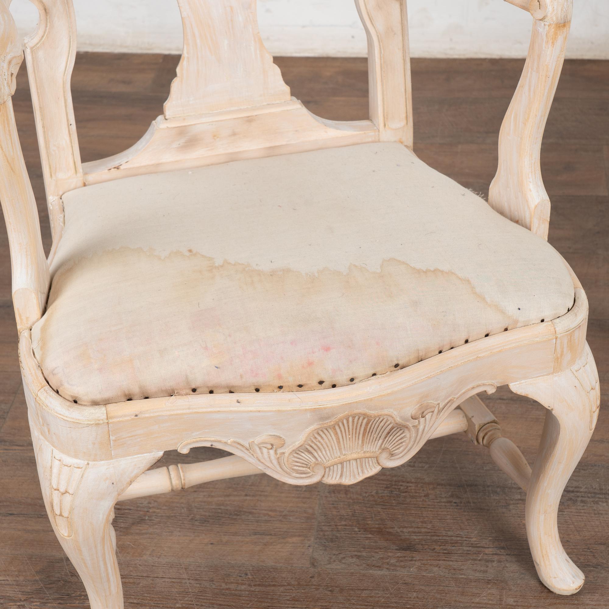 These armchairs have been given a newer, professionally painted gray layered finish which is lightly scraped creating a soft contrast with the hardwood beneath and accentuating the hand carved details along the crown, skirt, and cabriolet legs.