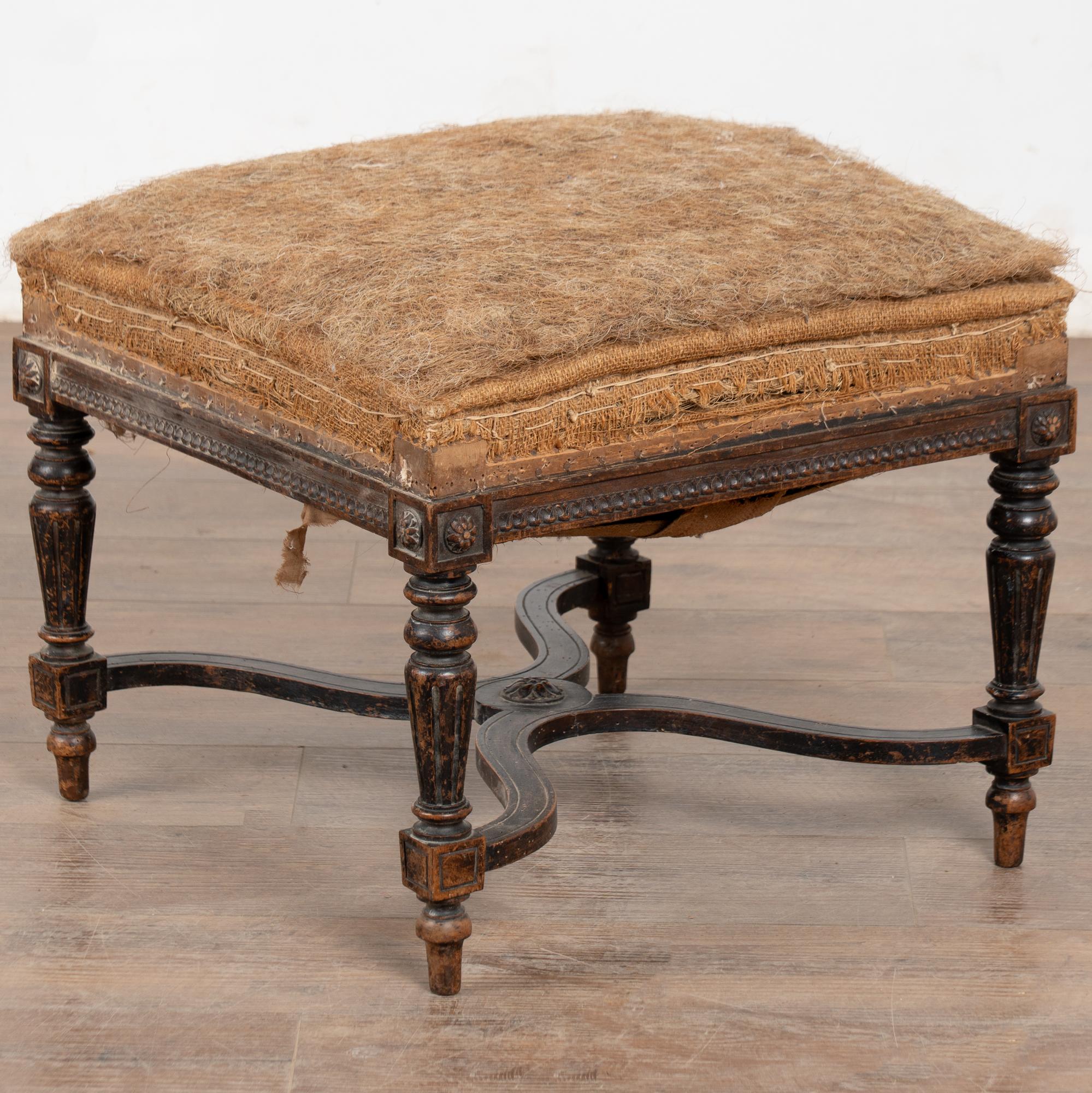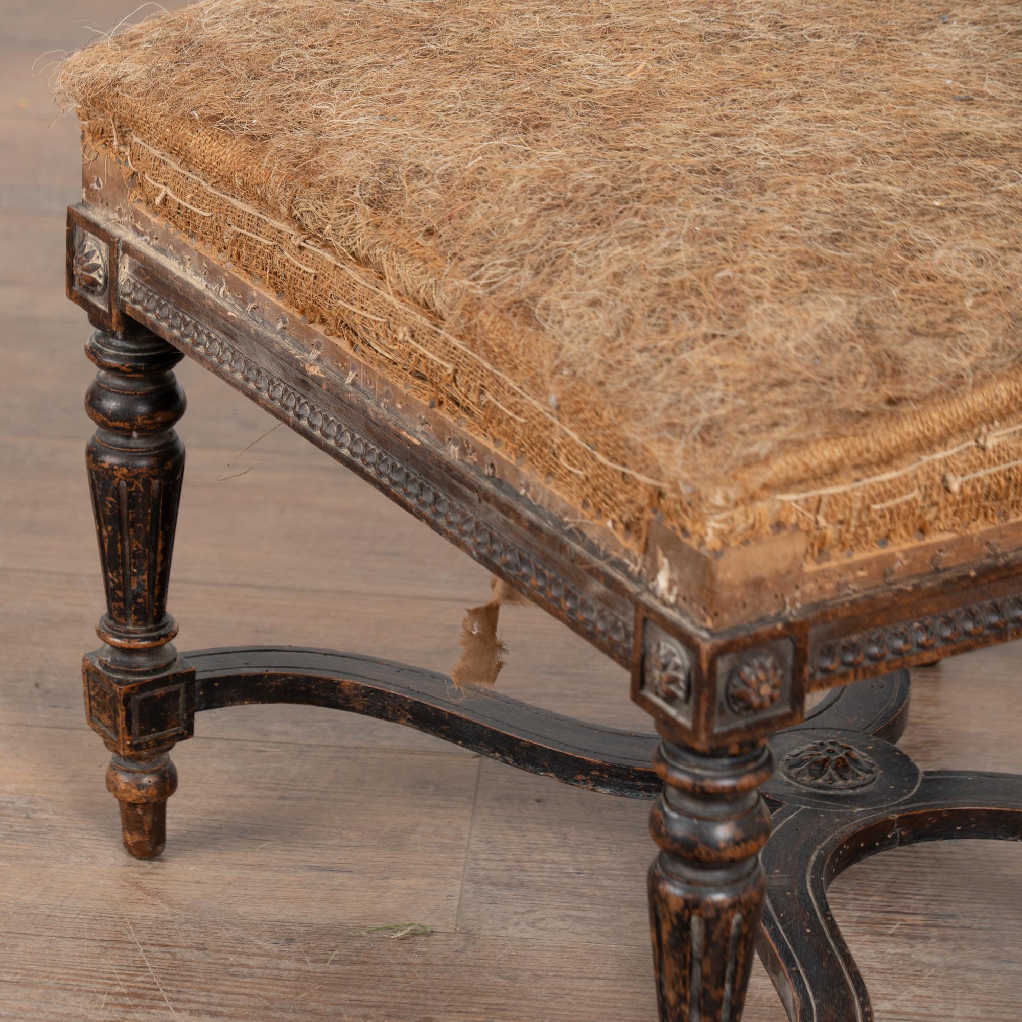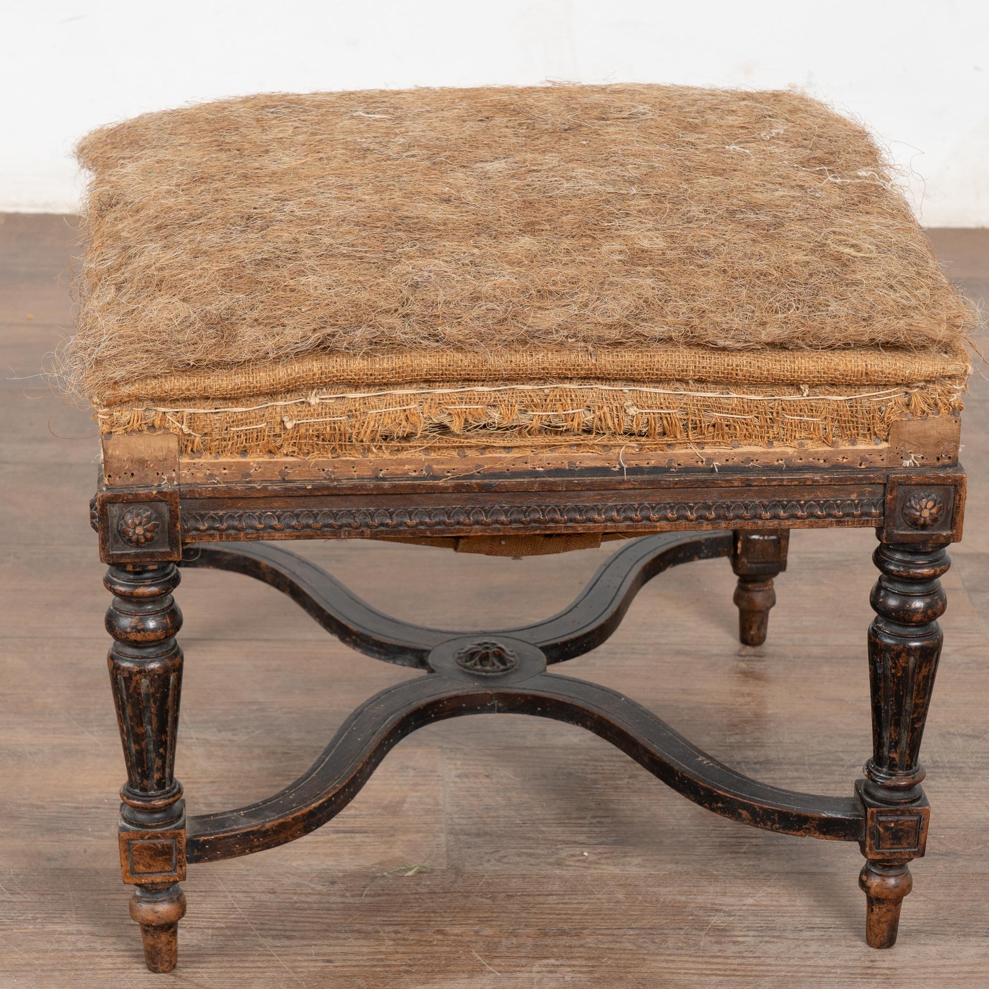 Wood frame is restored, strong/stable. Signs of wear including scratches, cracks, dings, or age related separation are reflective of age and use and do not detract from the beauty nor function of this Swedish tabouret. Note small piece missing from flower medallion, scuff to leg, etc.