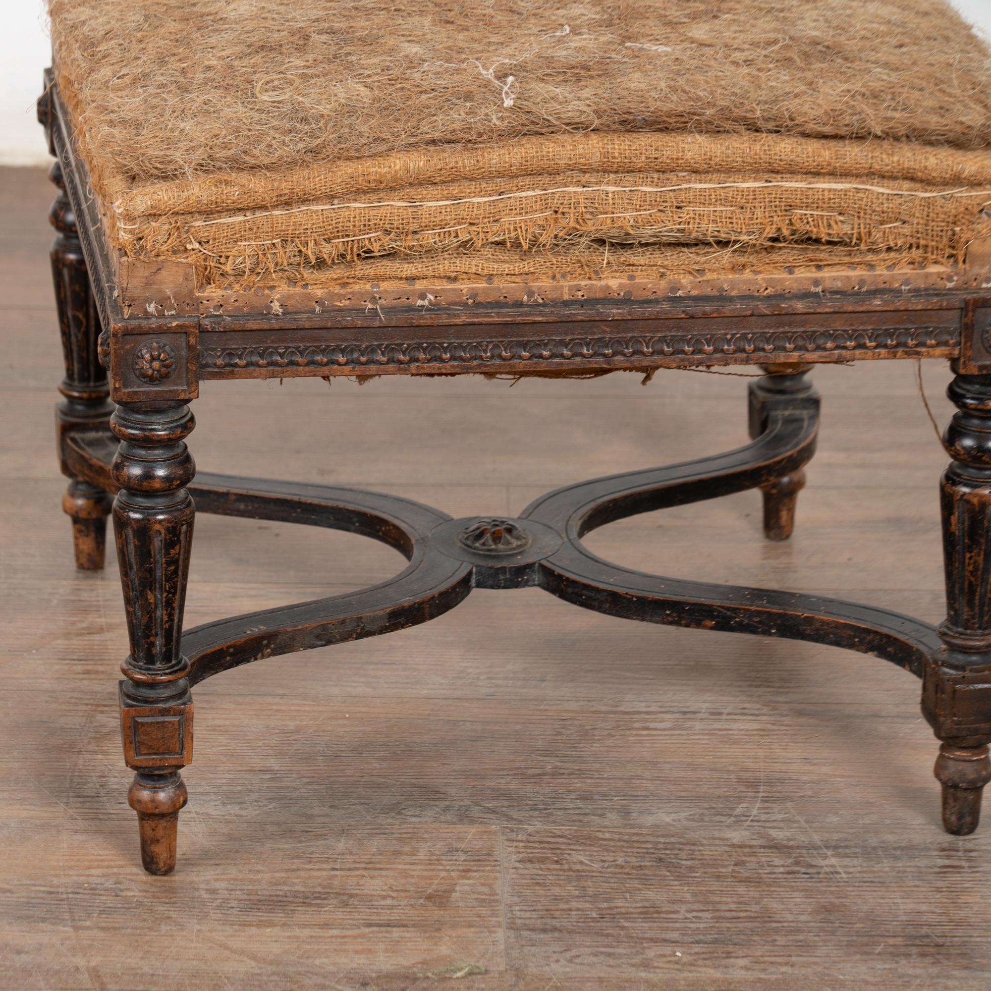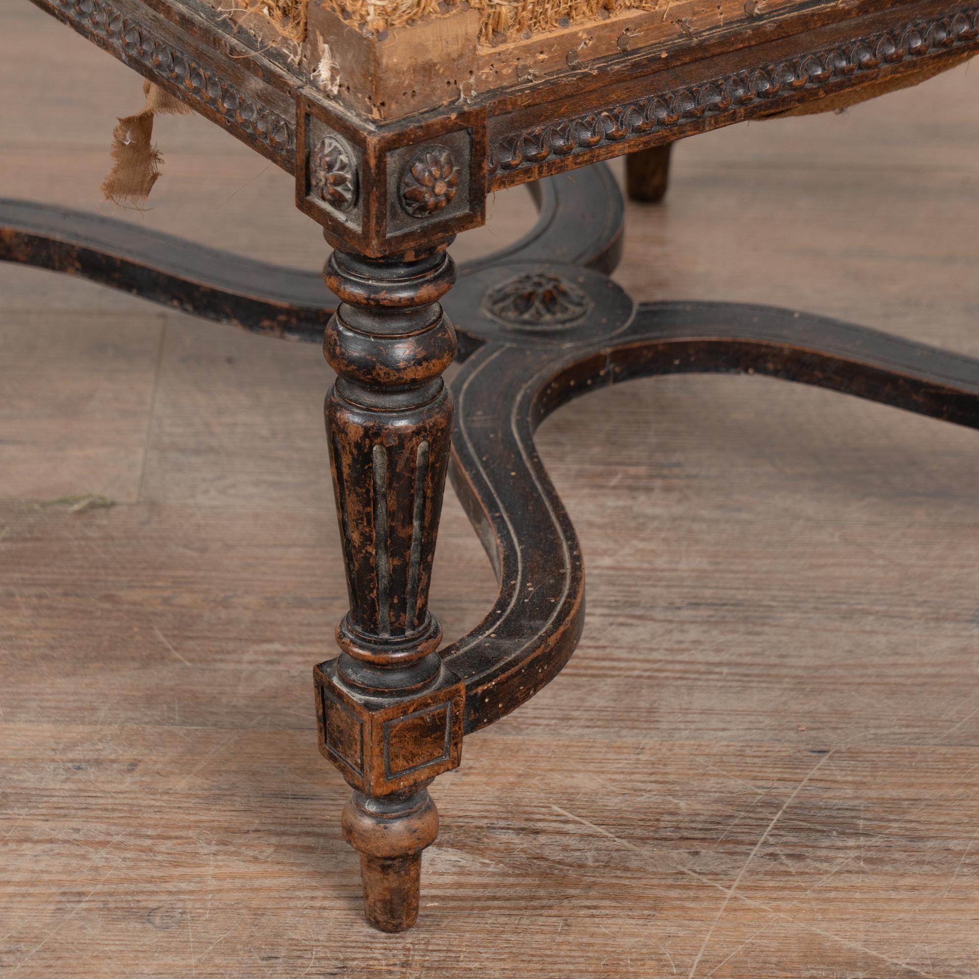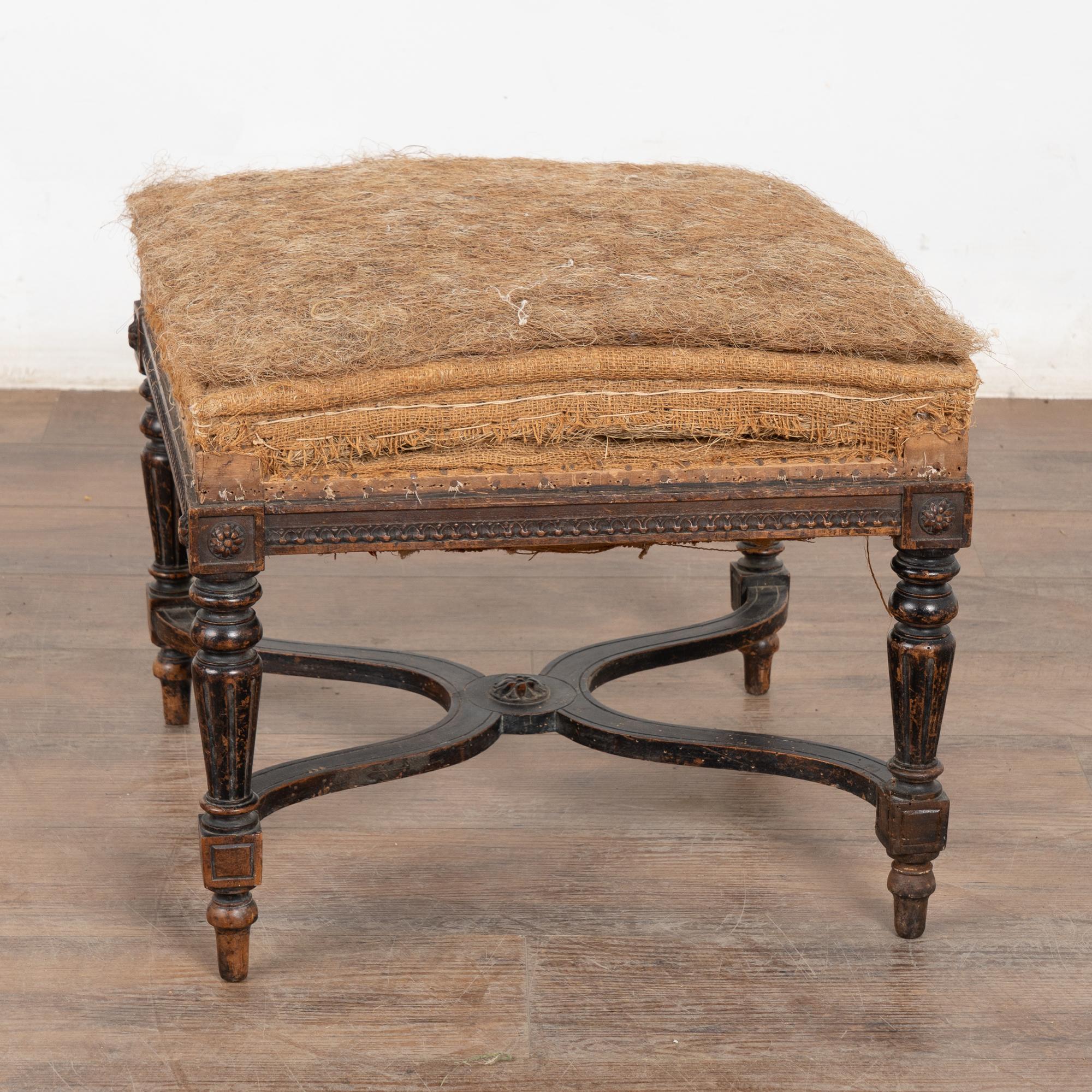 Wood frame is restored, strong/stable. Signs of wear including scratches, cracks, dings, or age related separation are reflective of age and use and do not detract from the beauty nor function of this Swedish tabouret. Note small piece missing from flower medallion, scuff to leg, etc.