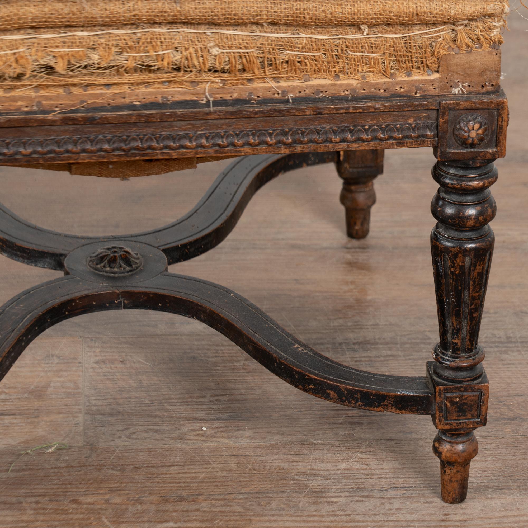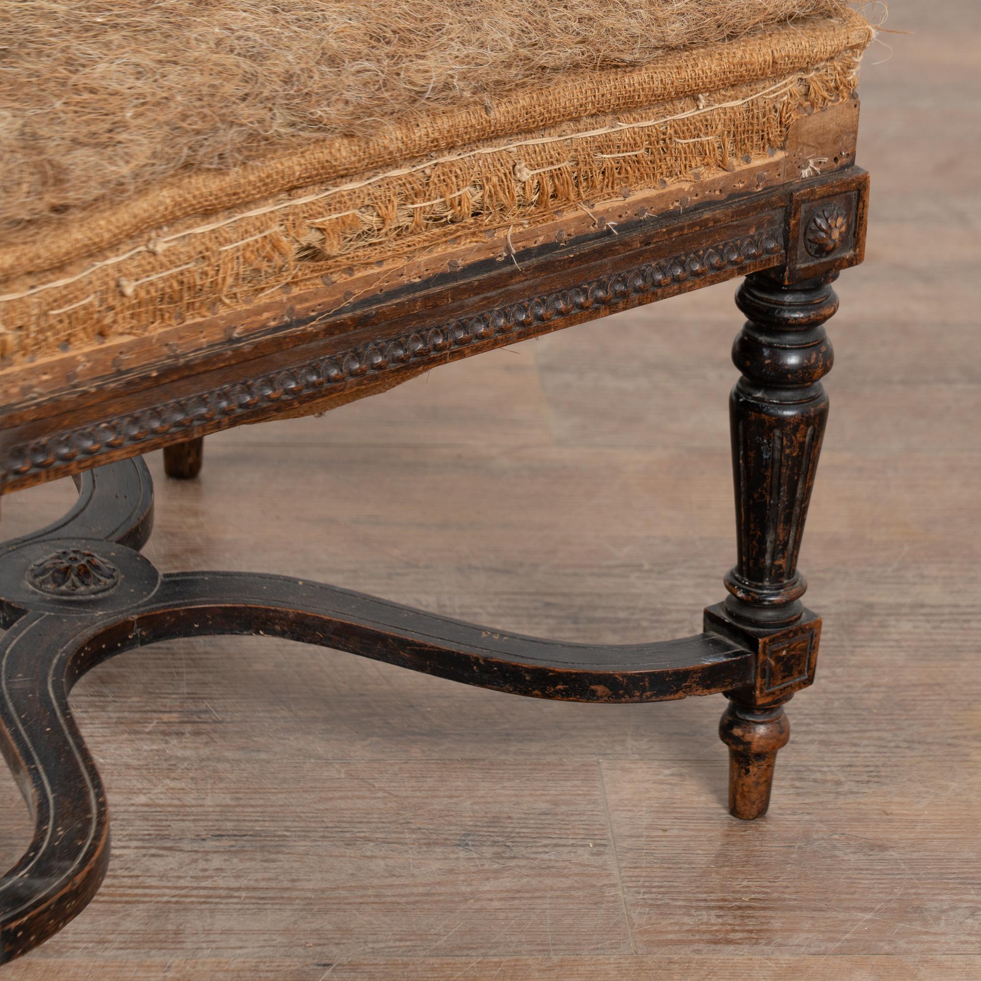 Simple linen upholstery on seat with deconstructed look and feel; tacks/nails visible throughout, some stains. Can easily be re-upholstered at discretion of buyer.