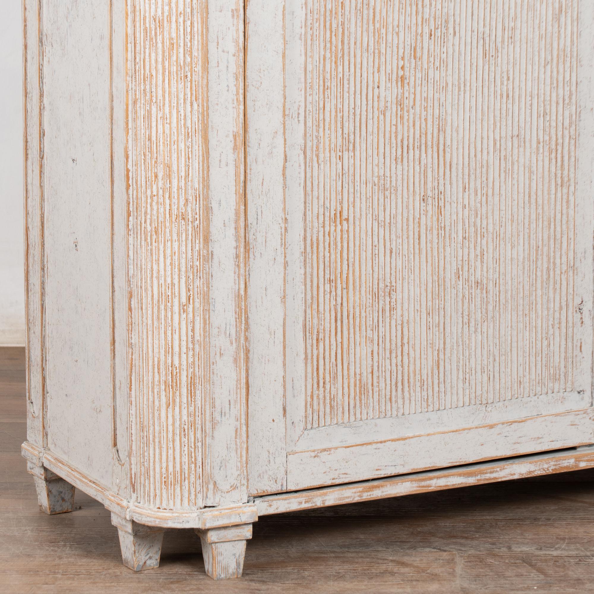 The attractive soft color pallet of this Swedish pine cabinet or sideboard comes from the original hand-painted light gray finish which has been gently scraped and softly distressed through generations of use, resulting in the warm aged patina of the natural pine revealed below.