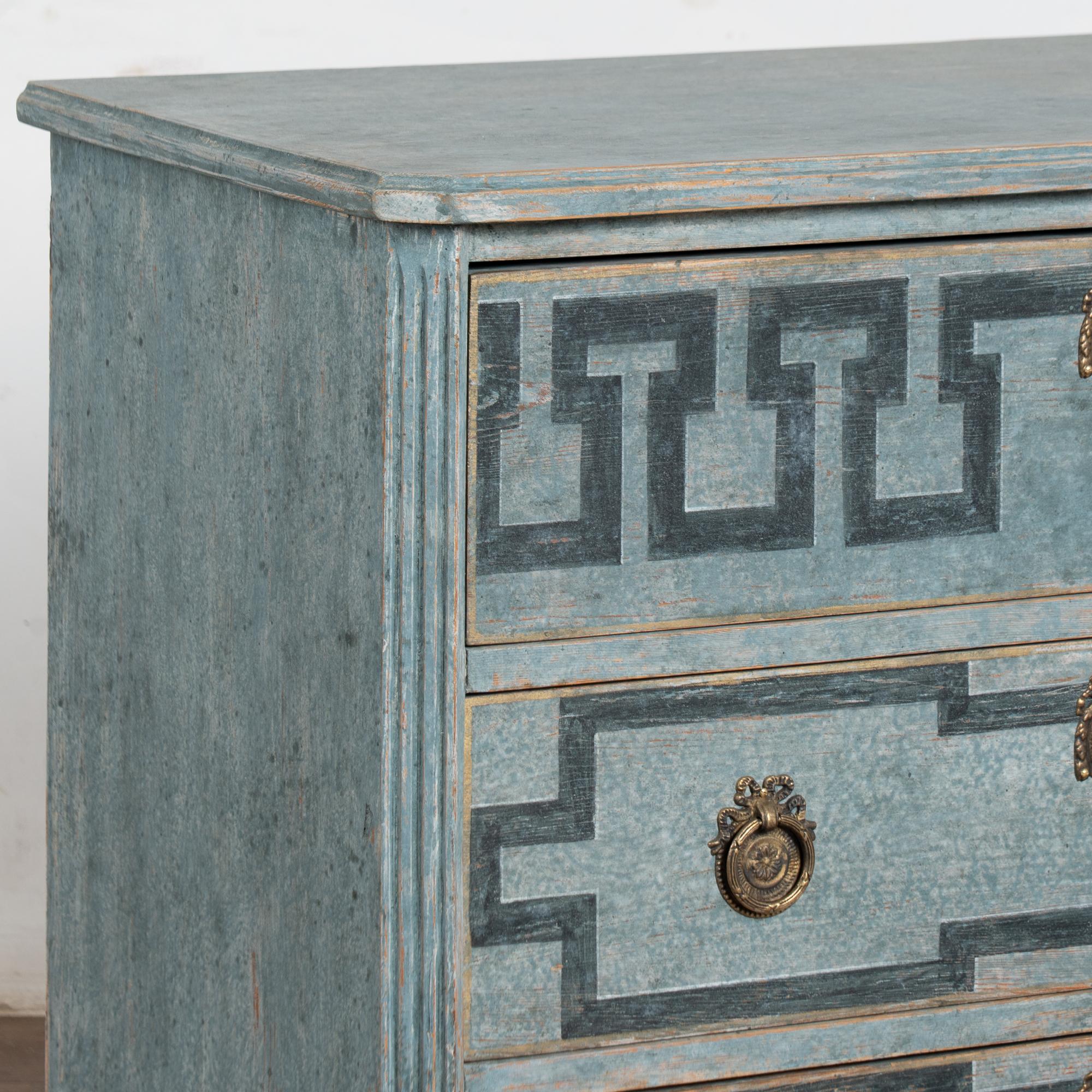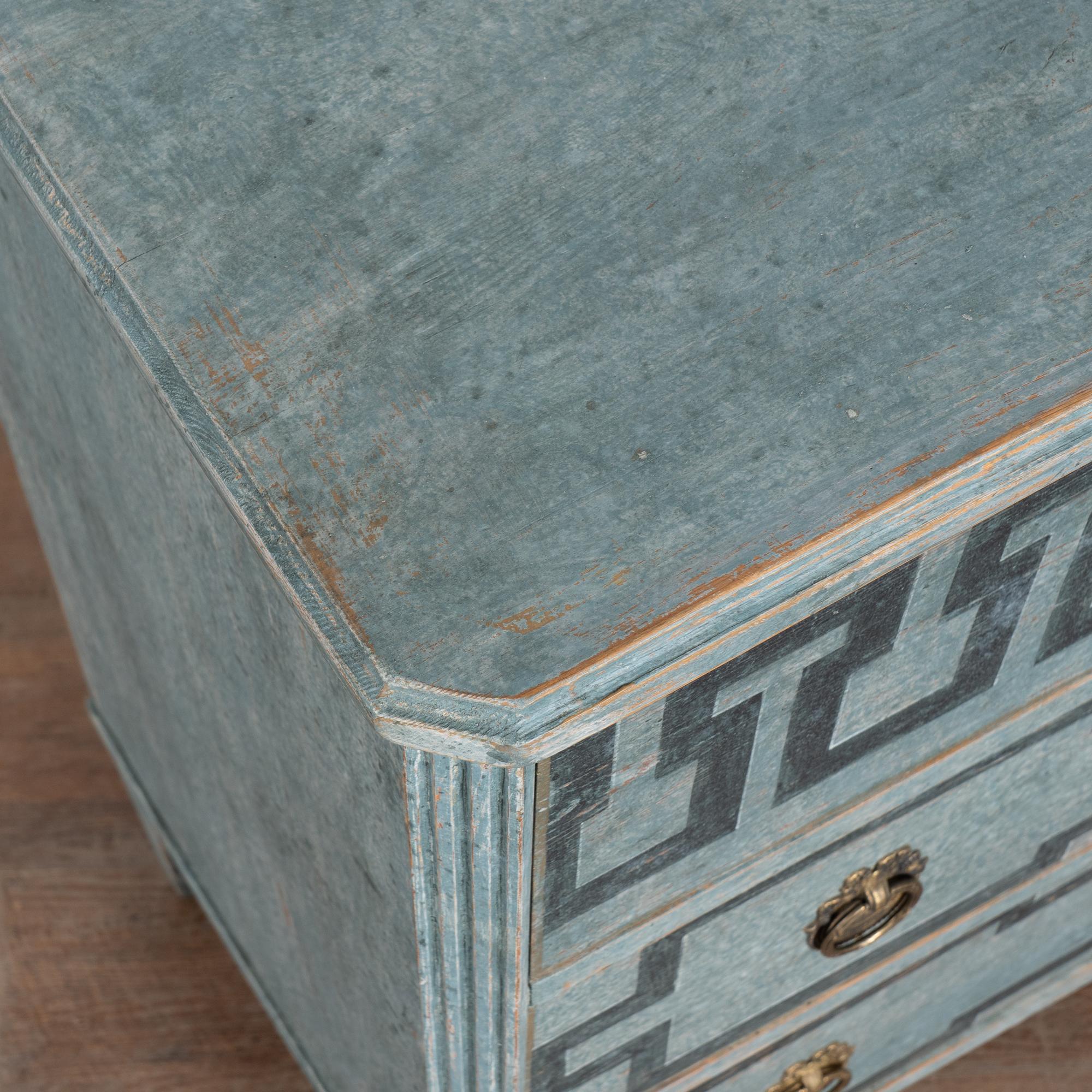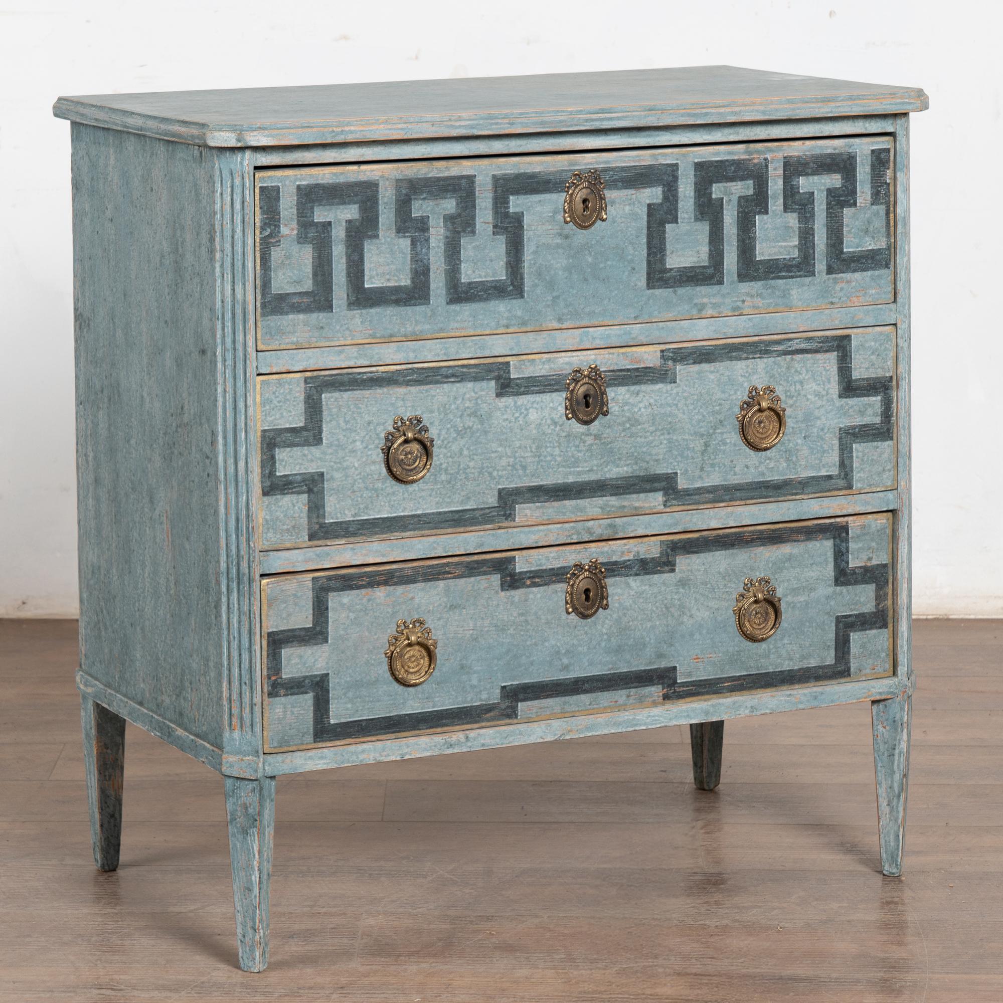 Three drawers decorated with "à La Grecque" or Greek key motif with two brass pulls on bottom drawers, key used as pull for top drawer (which has a divided interior).