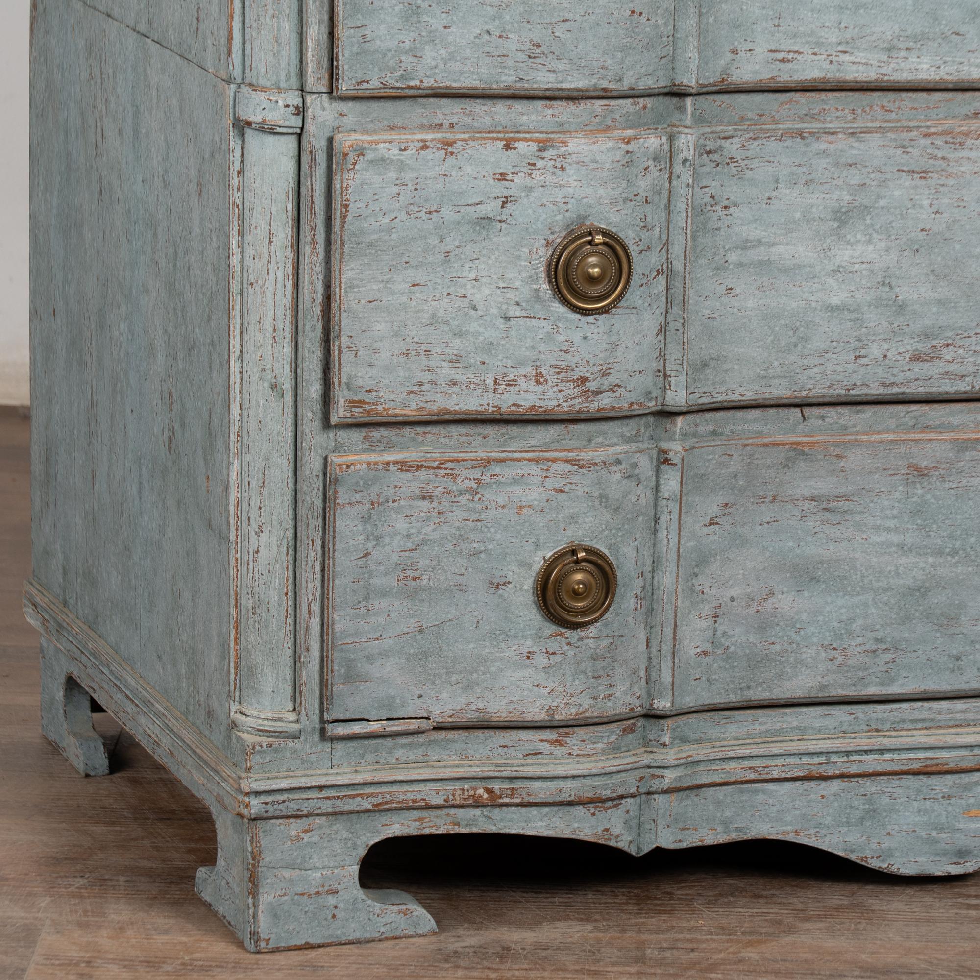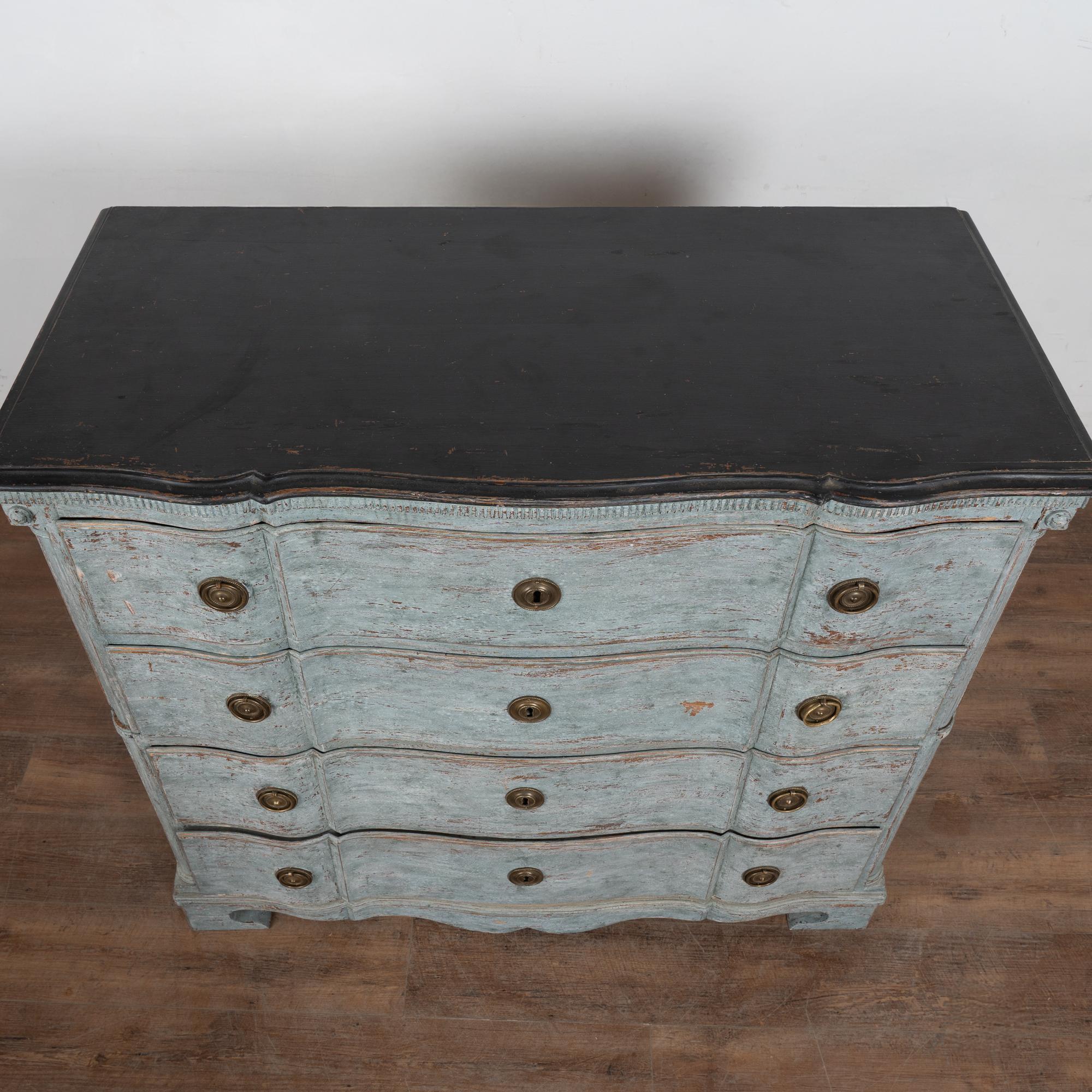 The newer, professionally applied and layered blue painted finish is gently scraped and distressed, revealing the natural wood below while complimenting the age and curved lines of the chest. Contrasting black painted top is also distressed revealing the wood below.
