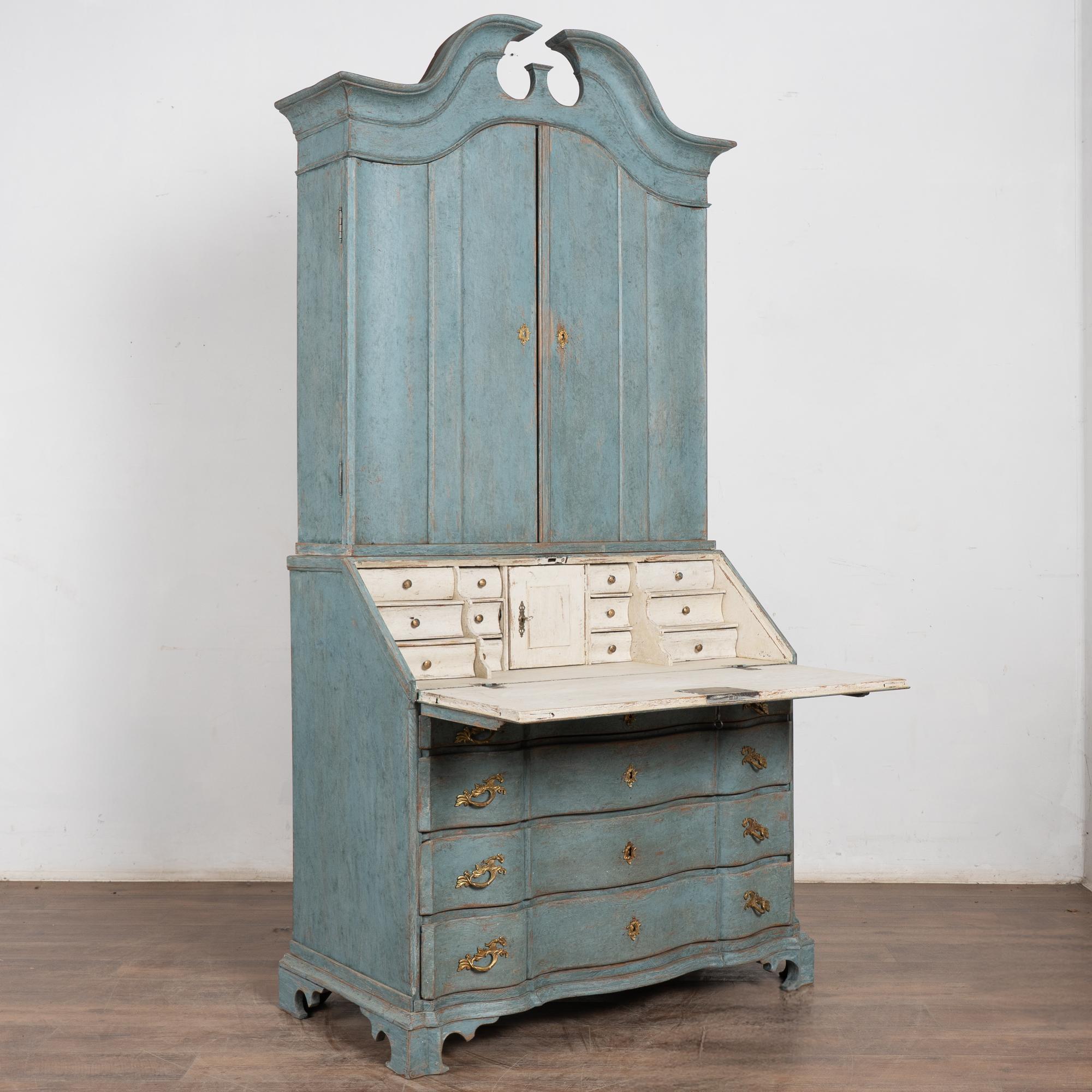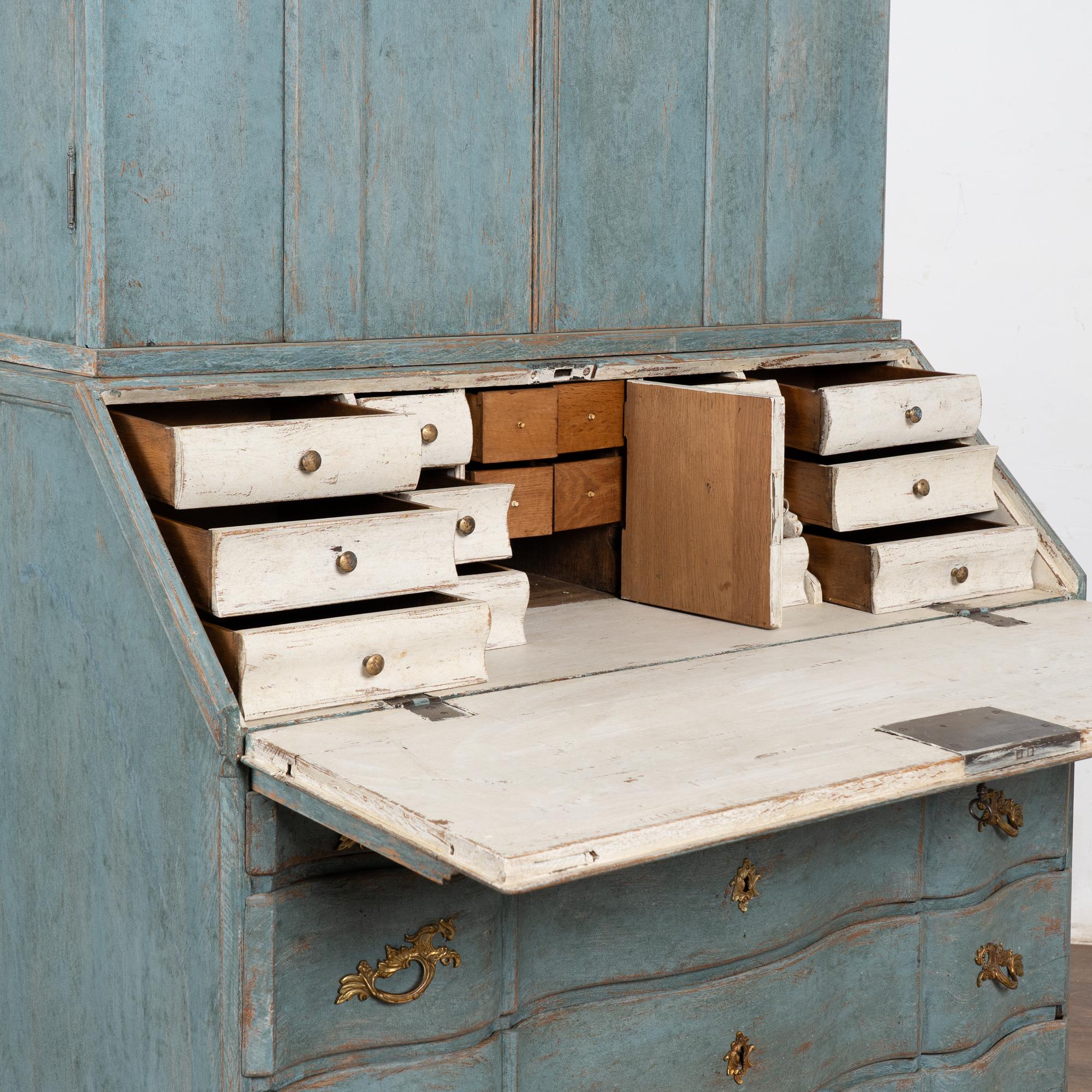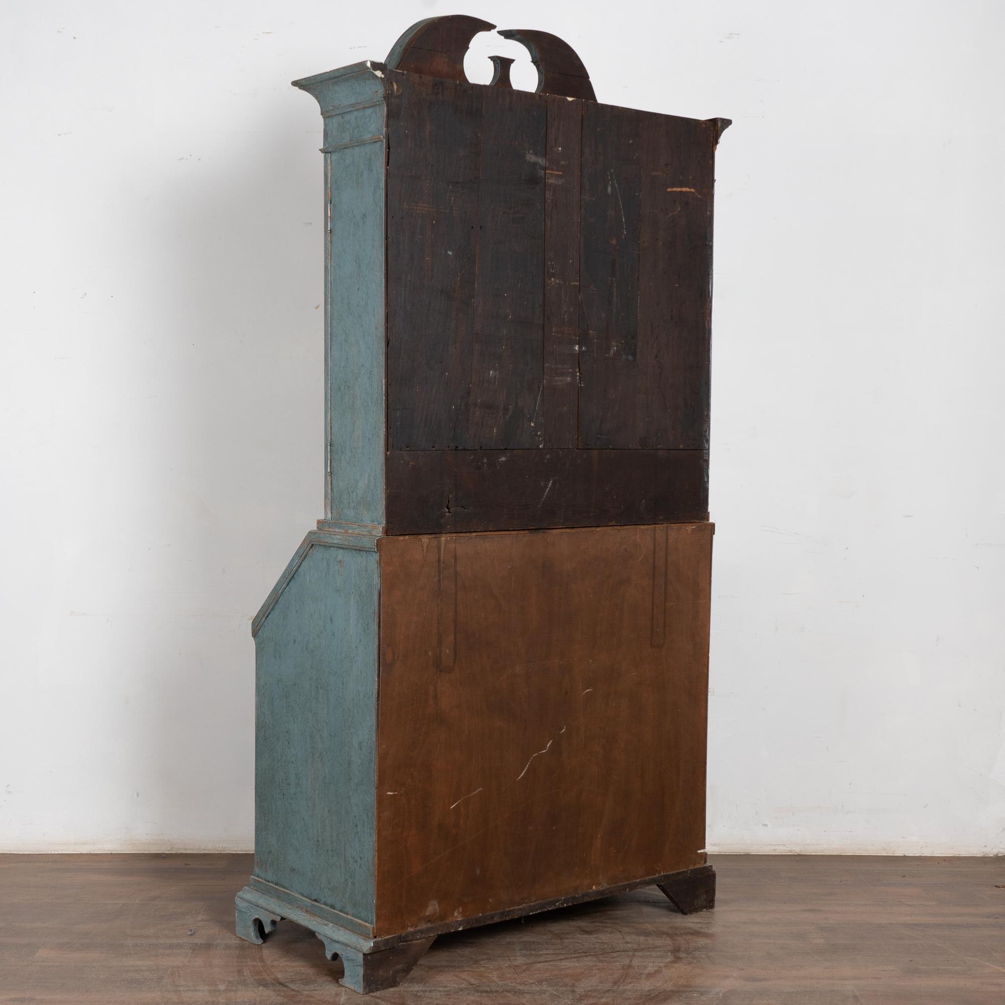 This blue painted secretary is restored, solid/stable and ready to be used. It is built in two sections allowing for easier transportation and installation. Lower back may have been restored/replaced at earlier point in time.