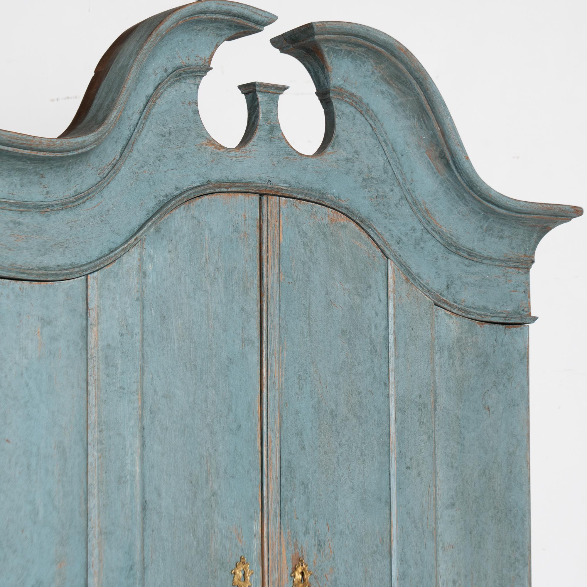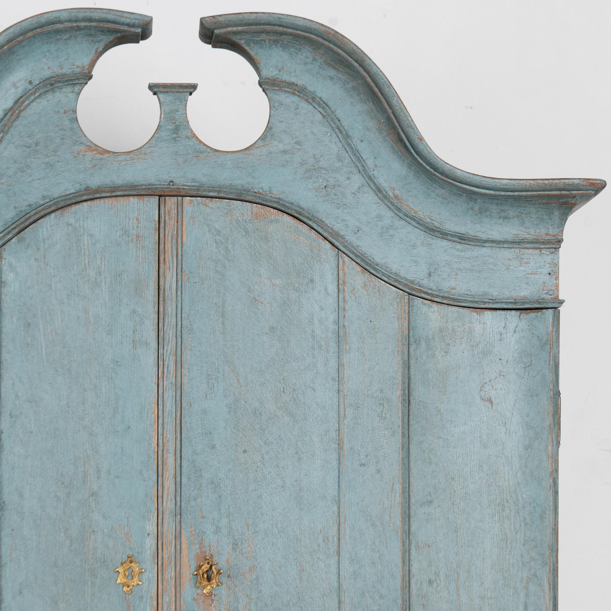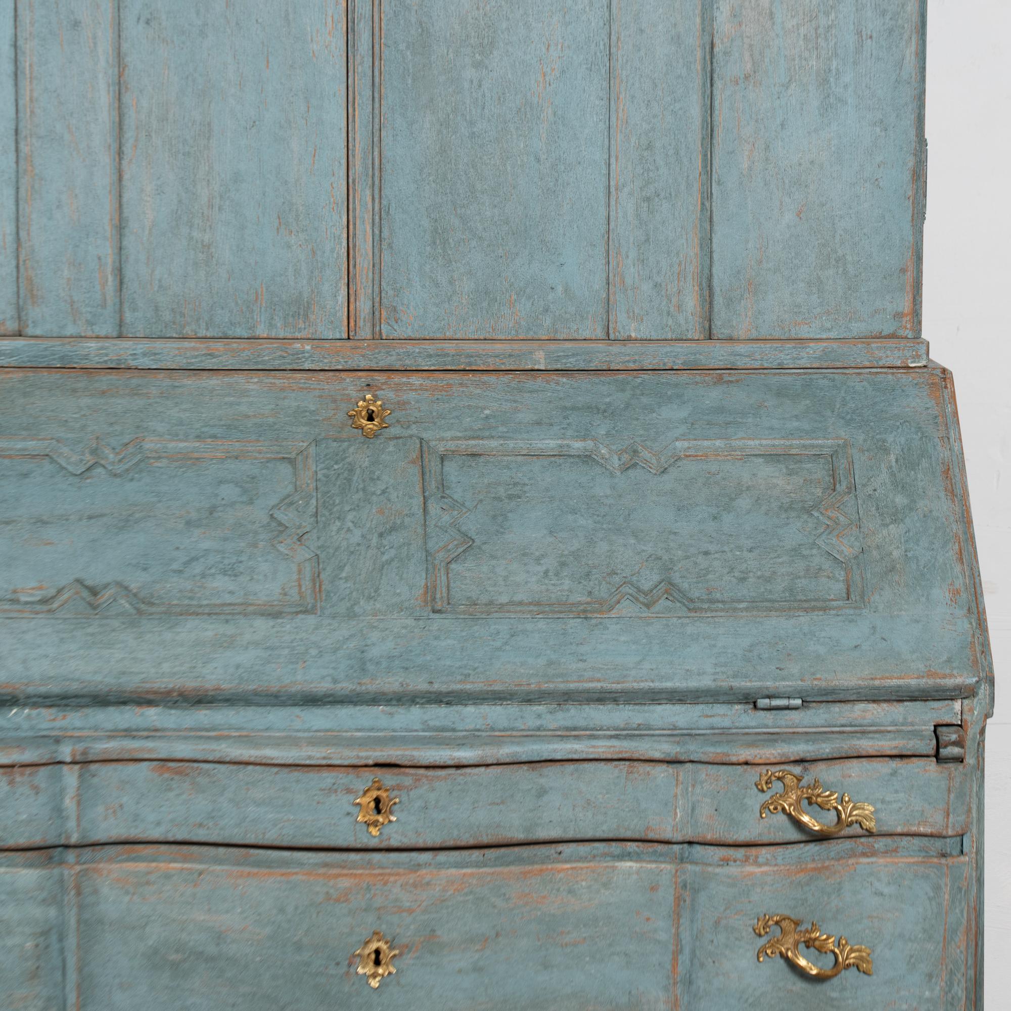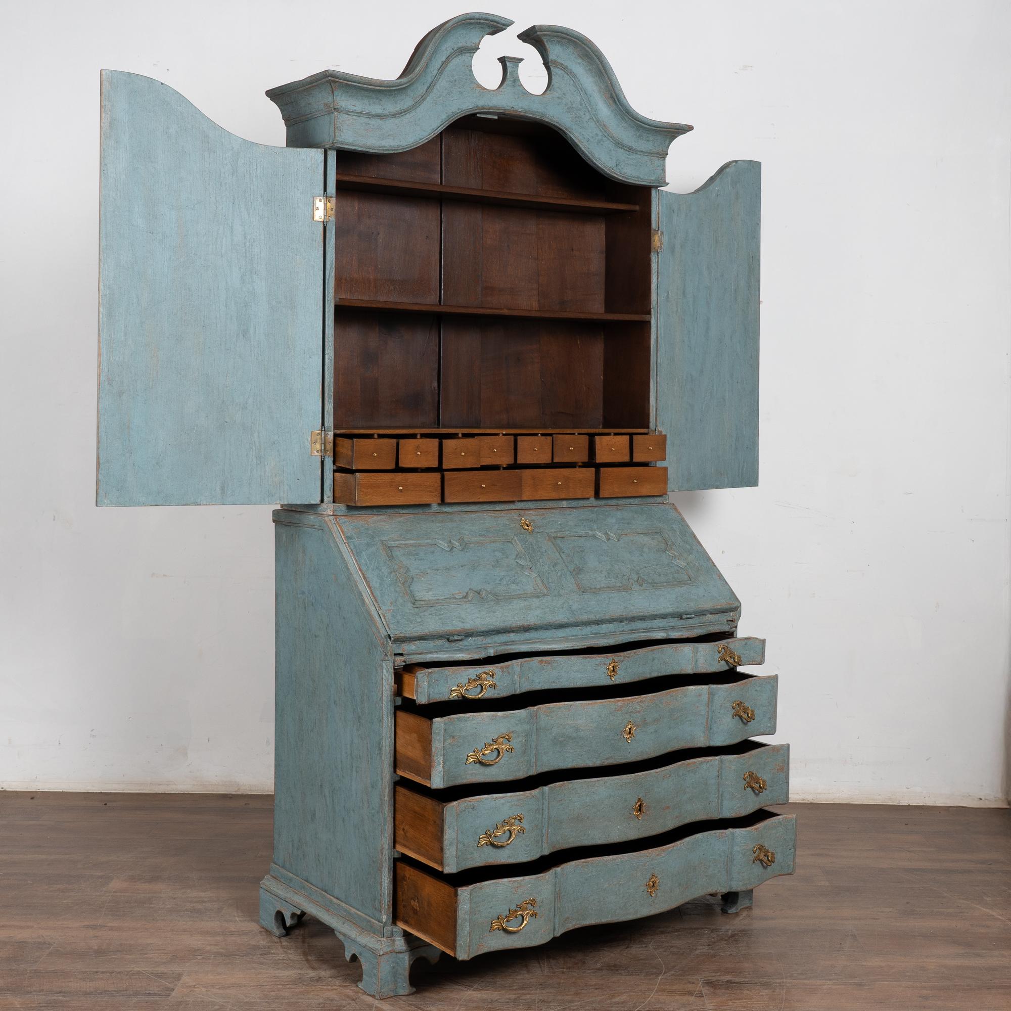 This blue painted secretary is restored, solid/stable and ready to be used. It is built in two sections allowing for easier transportation and installation. Lower back may have been restored/replaced at earlier point in time.