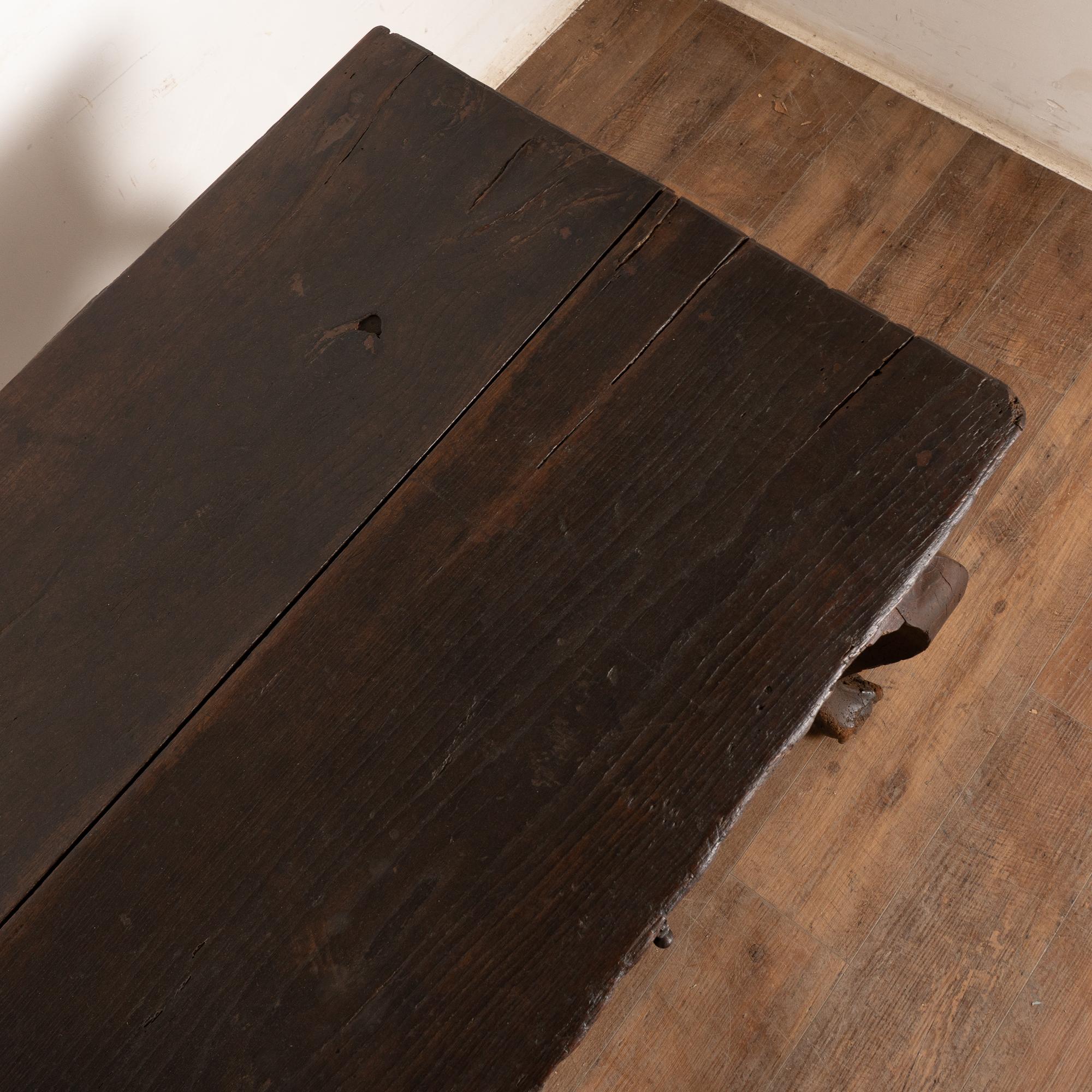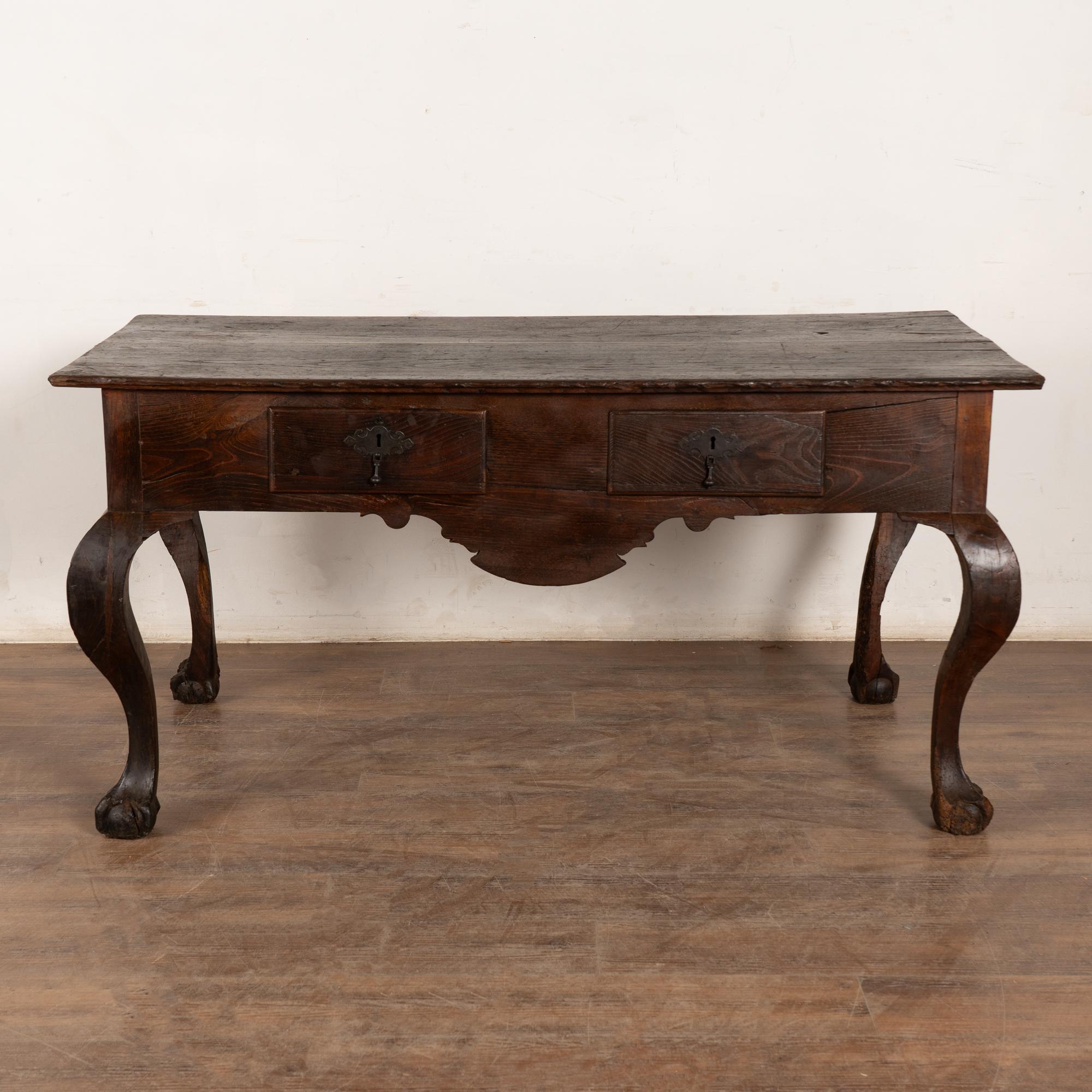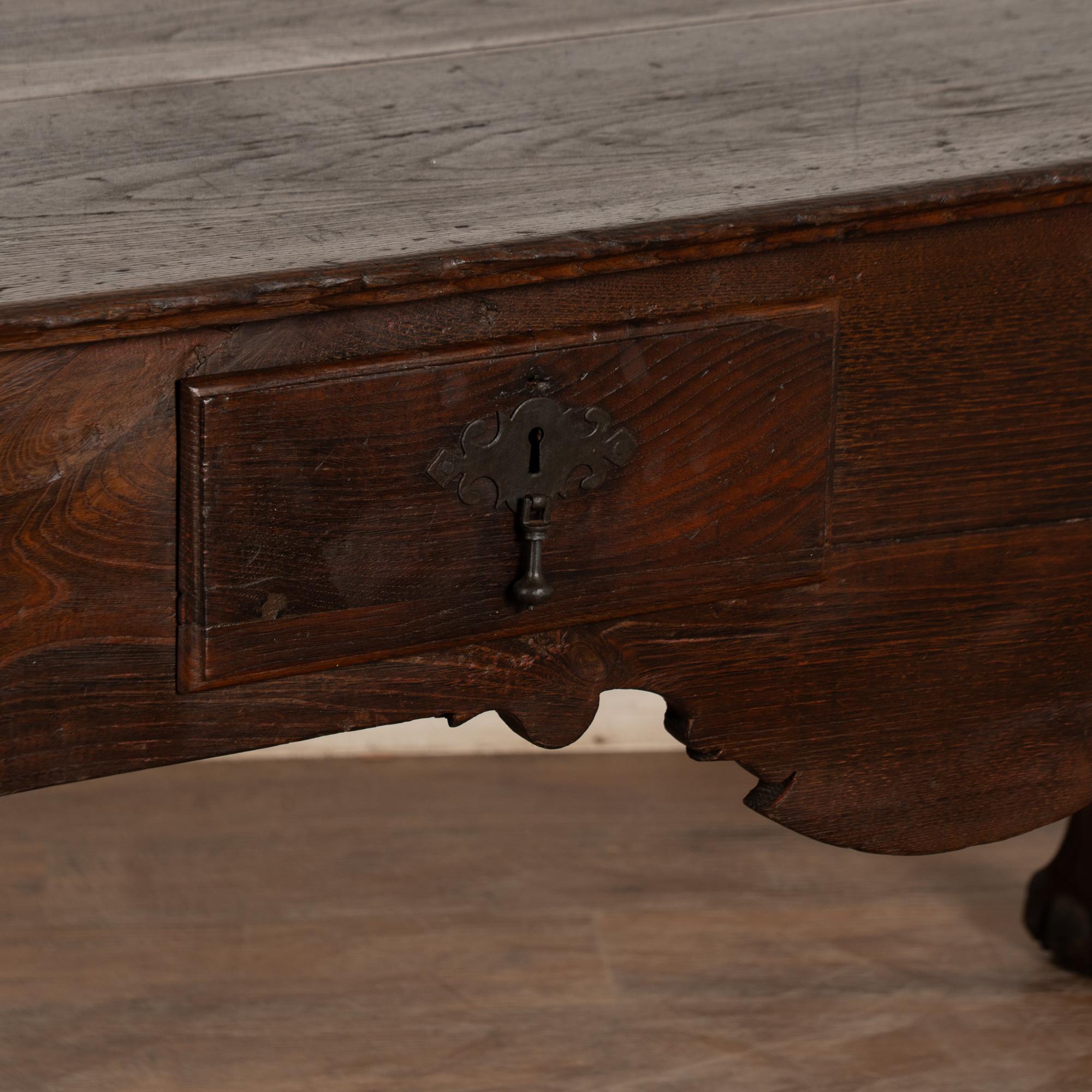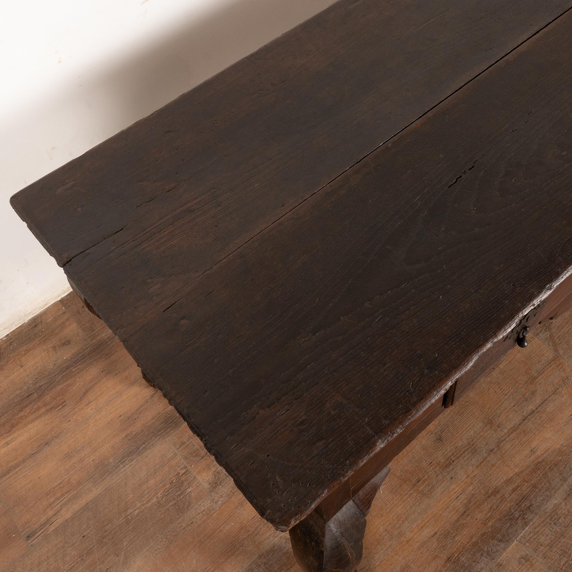 The generations of use are revealed in every old knot, nick (seen along edges, legs, drawers etc), crack, stain, etc. all resulting in the rich patina that brings character to this handsome console table. Note that the top is a contrasting wood, with slightly lighter patina; visible cracks in top.
