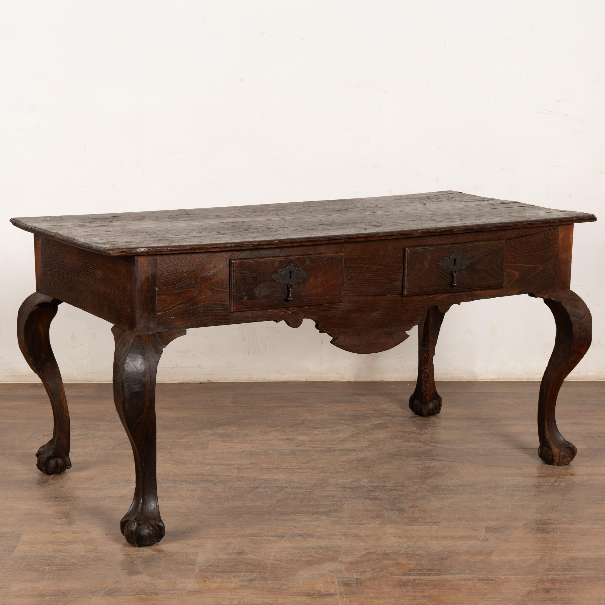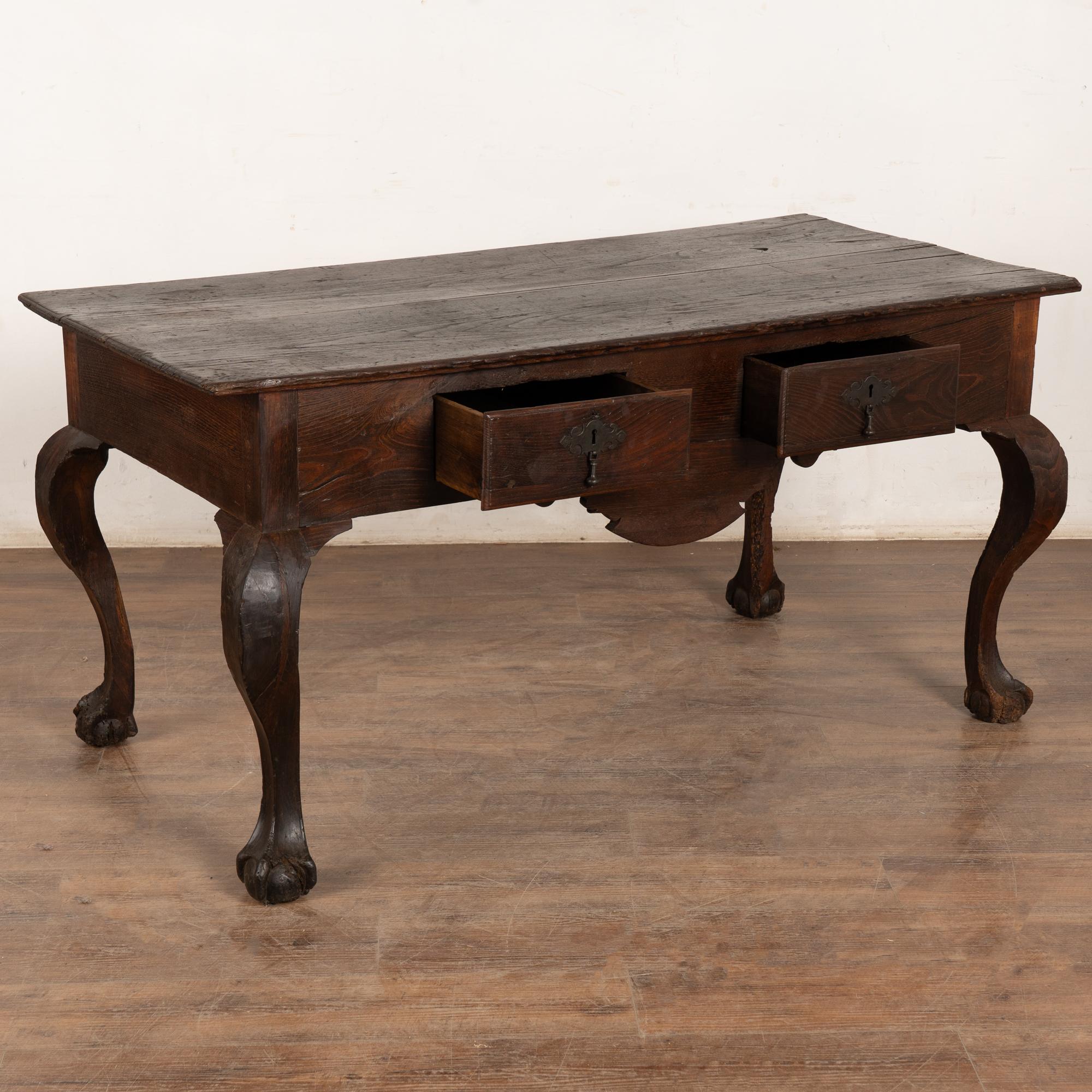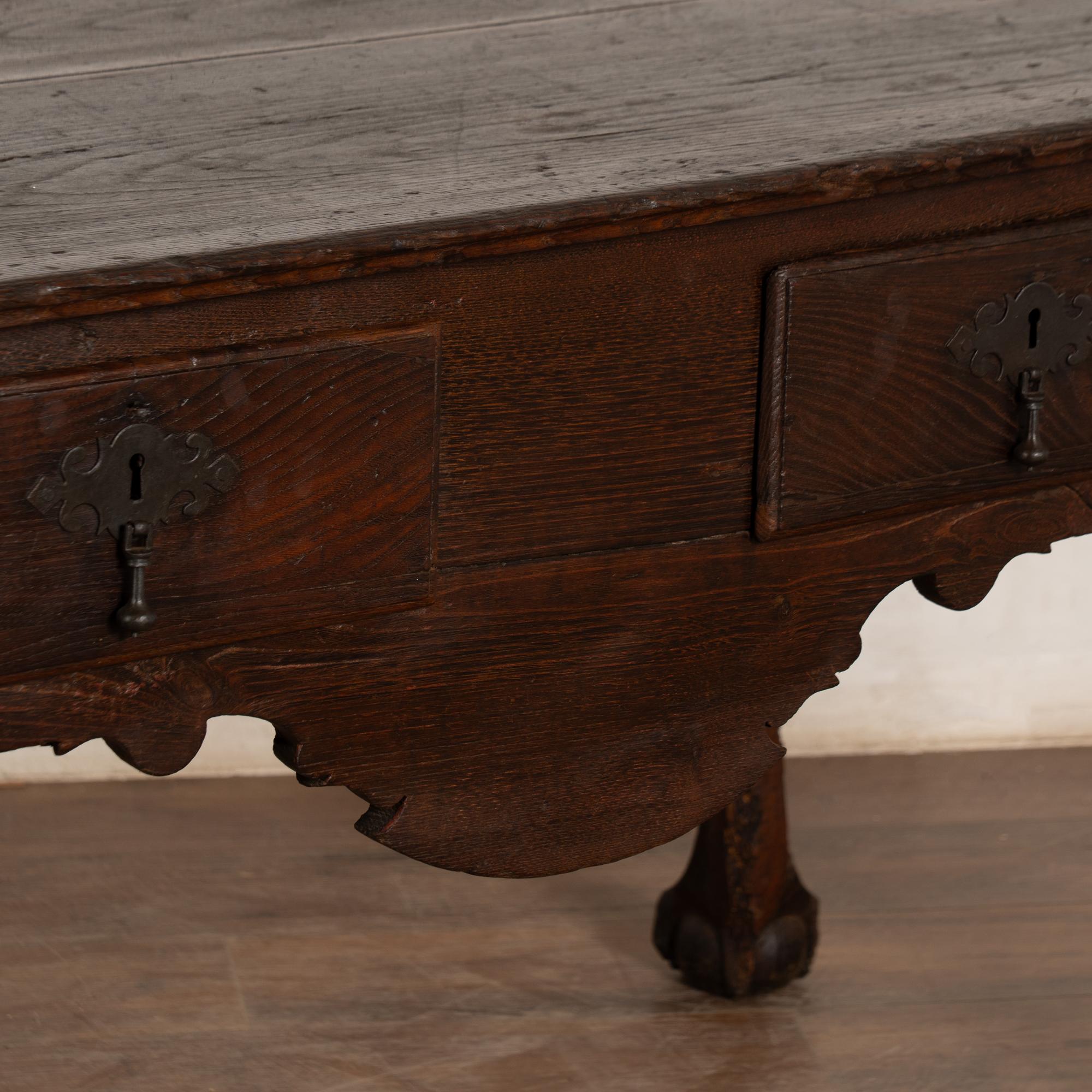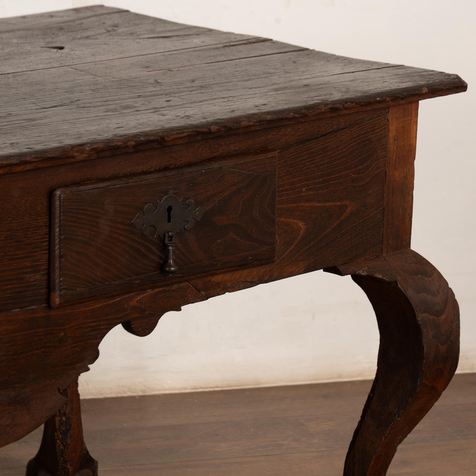 The generations of use are revealed in every old knot, nick (seen along edges, legs, drawers etc), crack, stain, etc. all resulting in the rich patina that brings character to this handsome console table. Note that the top is a contrasting wood, with slightly lighter patina; visible cracks in top.