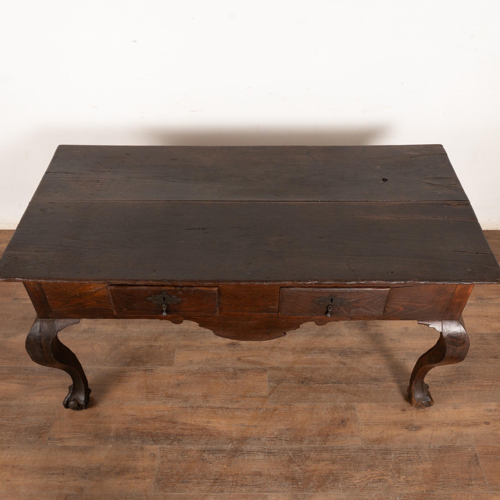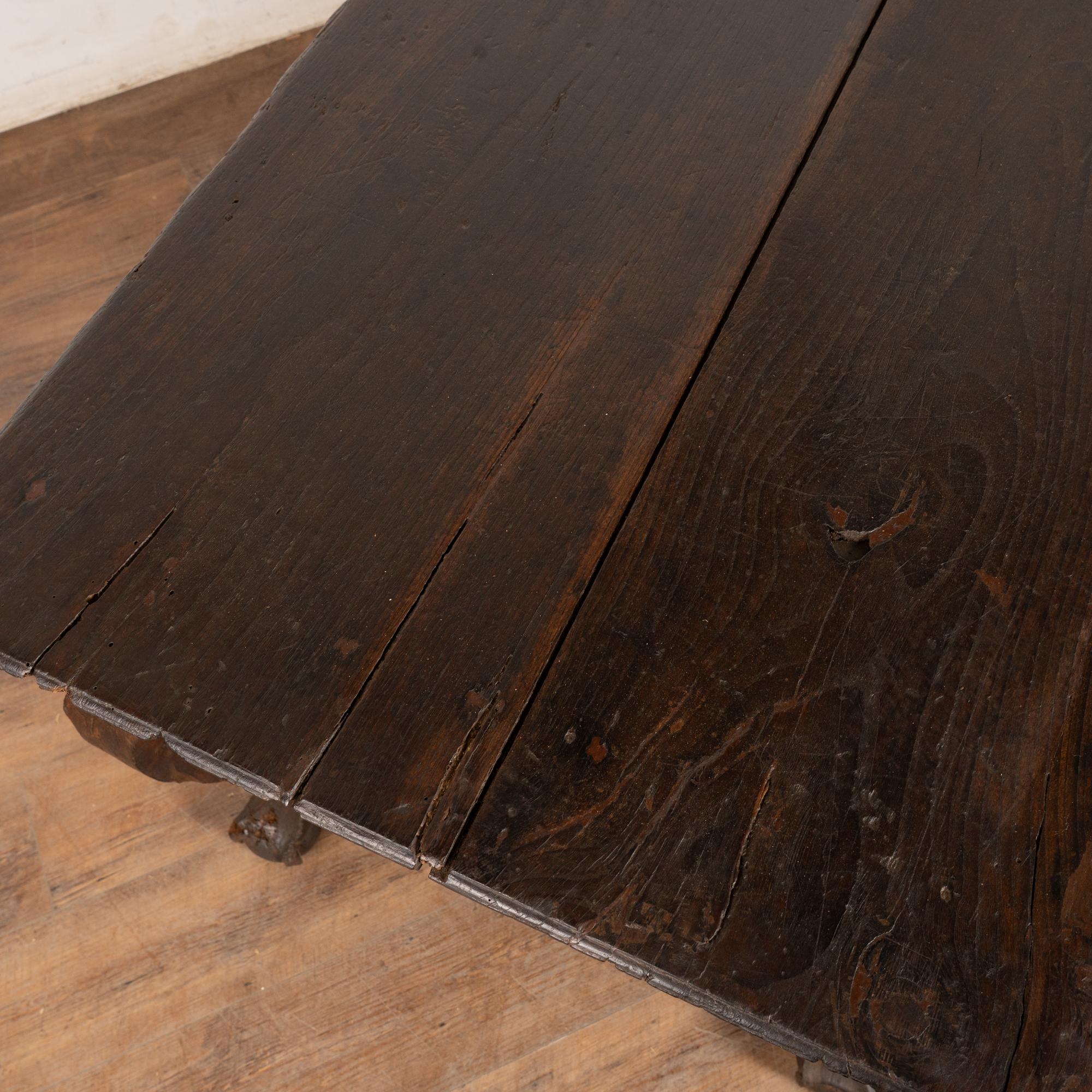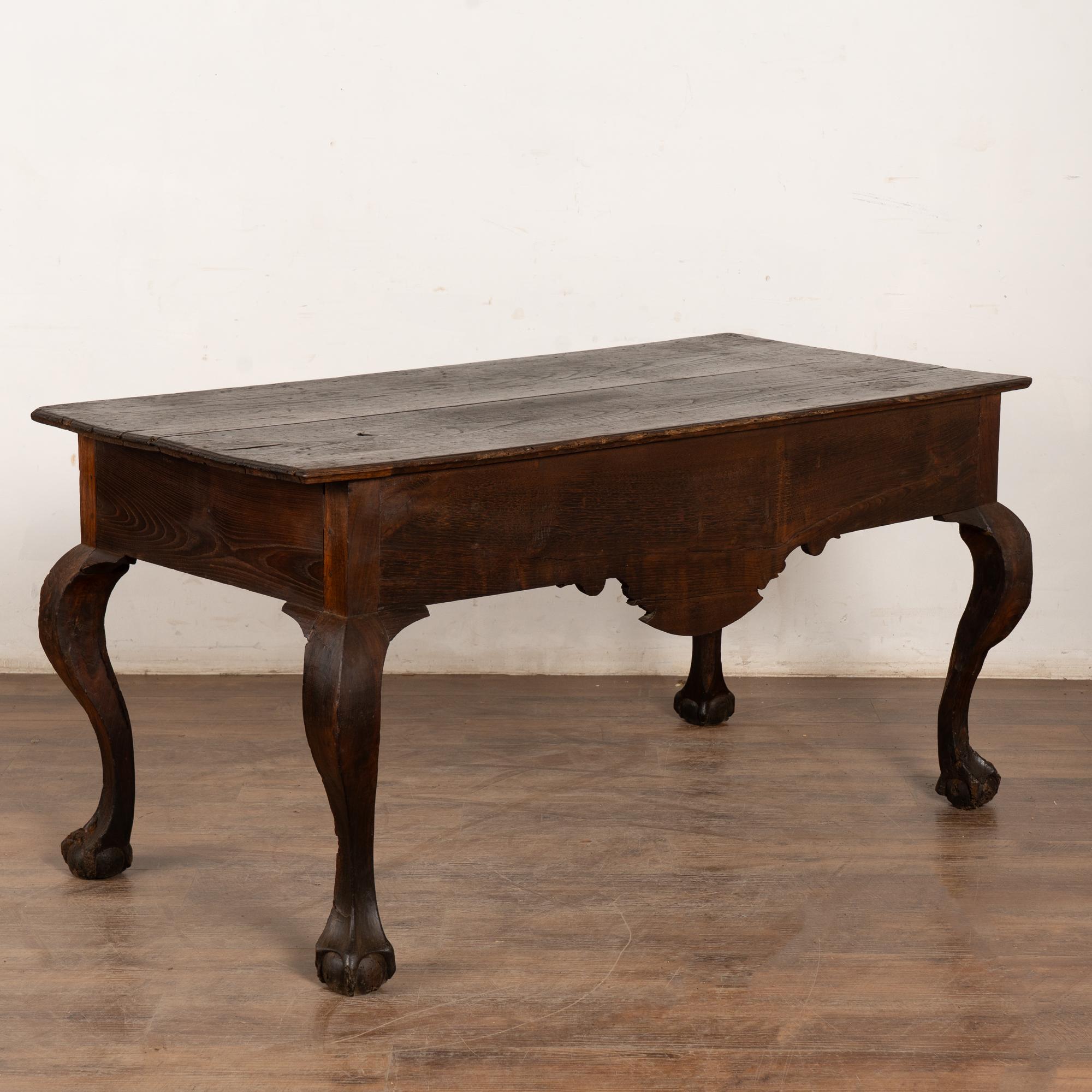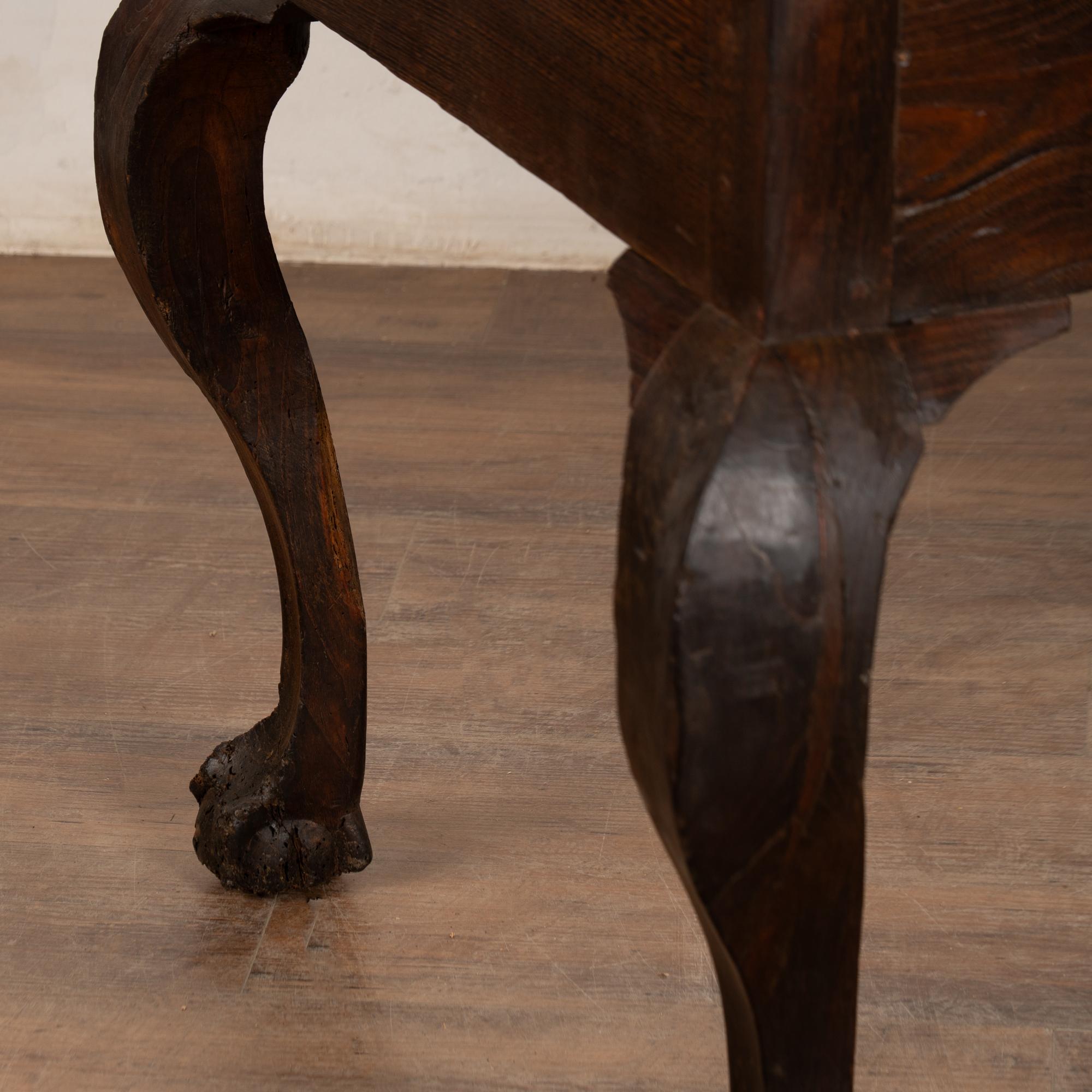 The generations of use are revealed in every old knot, nick (seen along edges, legs, drawers etc), crack, stain, etc. all resulting in the rich patina that brings character to this handsome console table. Note that the top is a contrasting wood, with slightly lighter patina; visible cracks in top.
