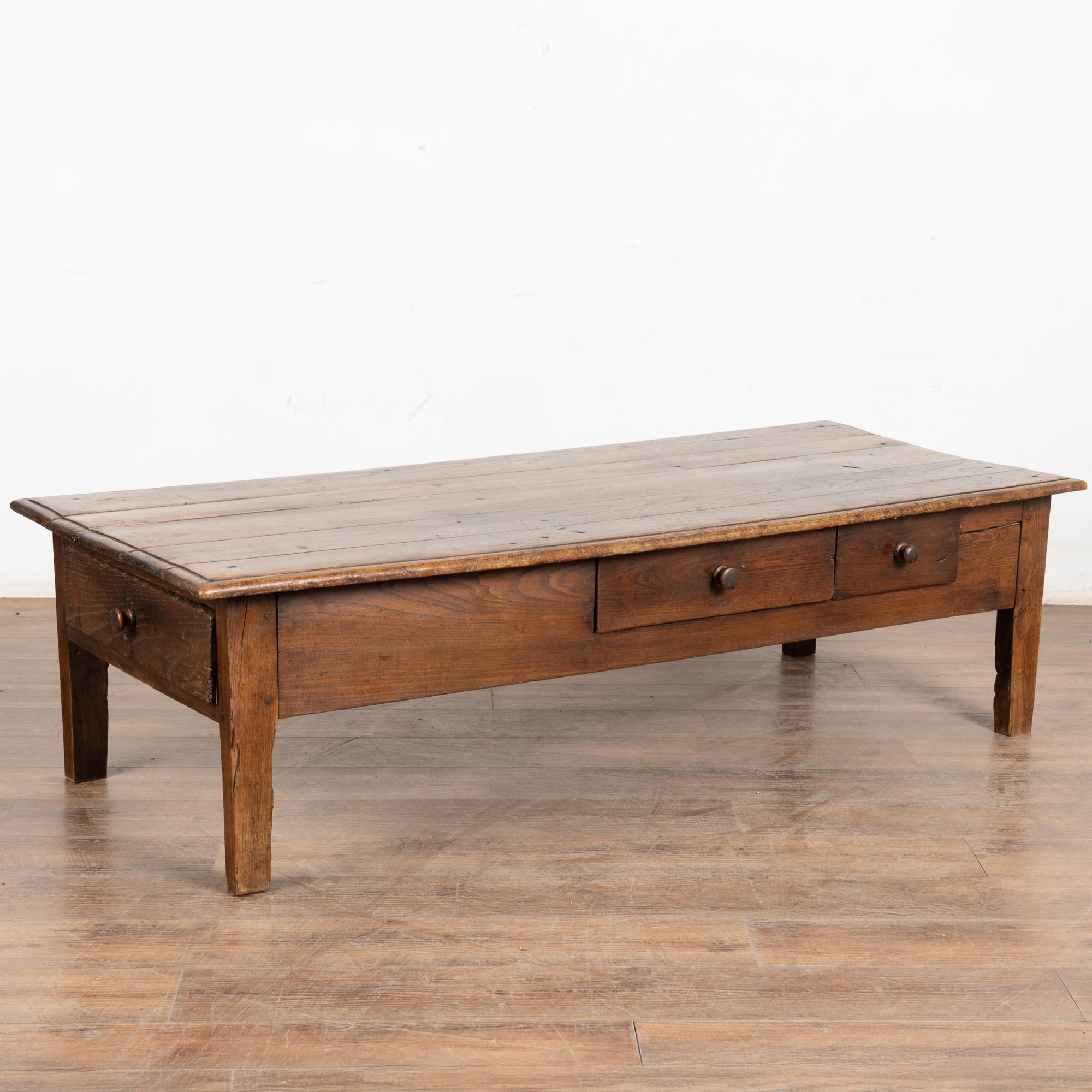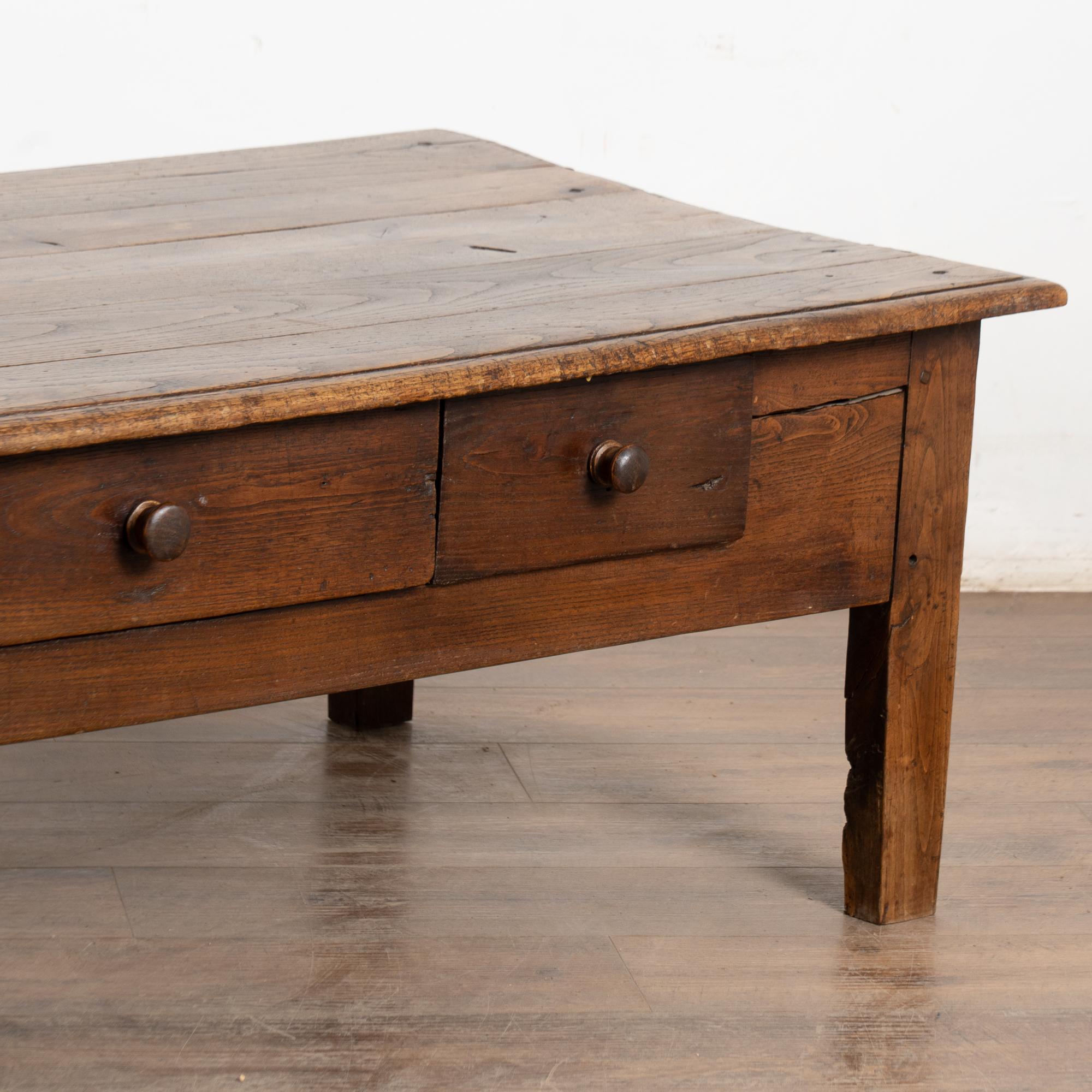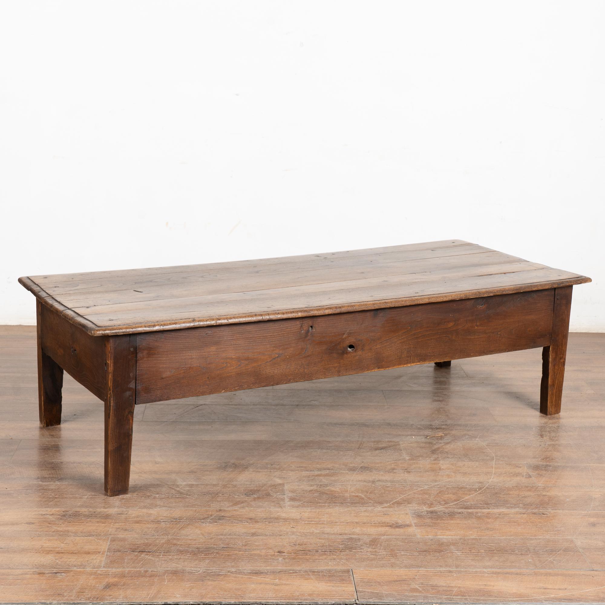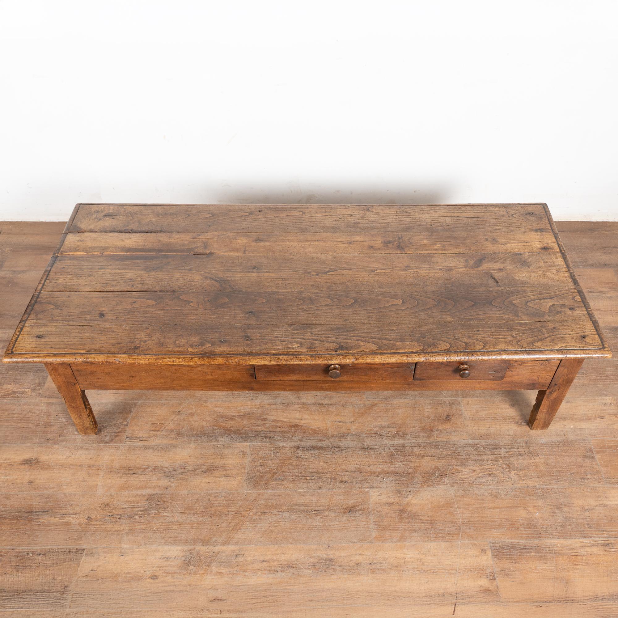 The strong appeal of this coffee table comes from the rich patina of the worn French hardwood. Every scratch, nick, crack and old dried worm holes add to the character of this coffee table.