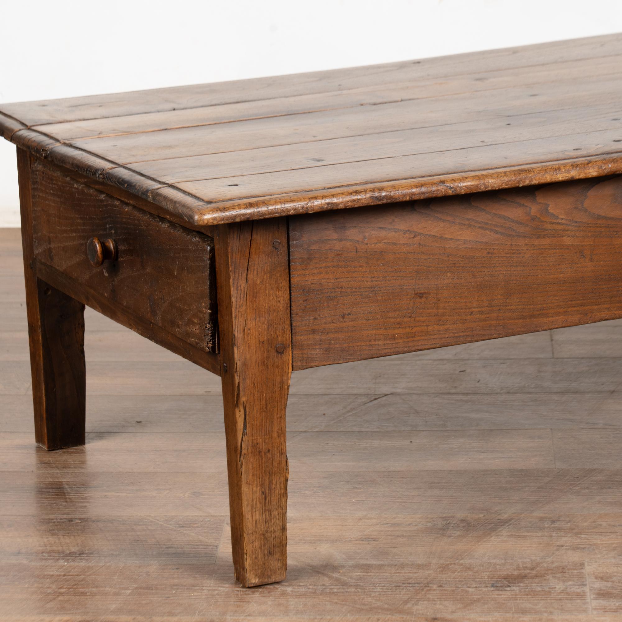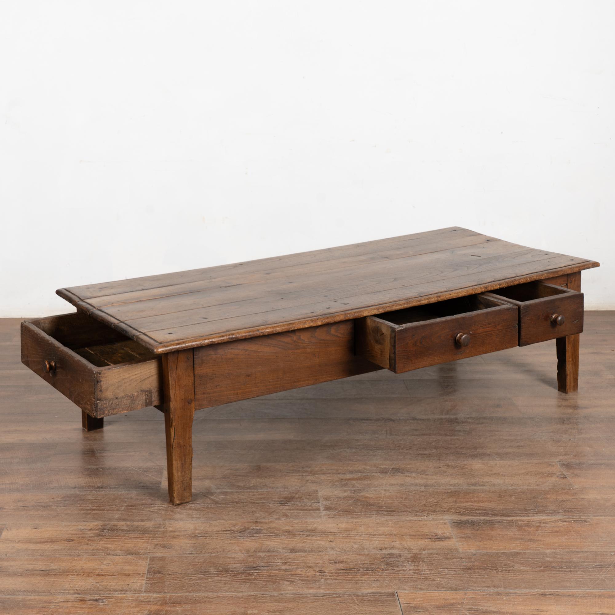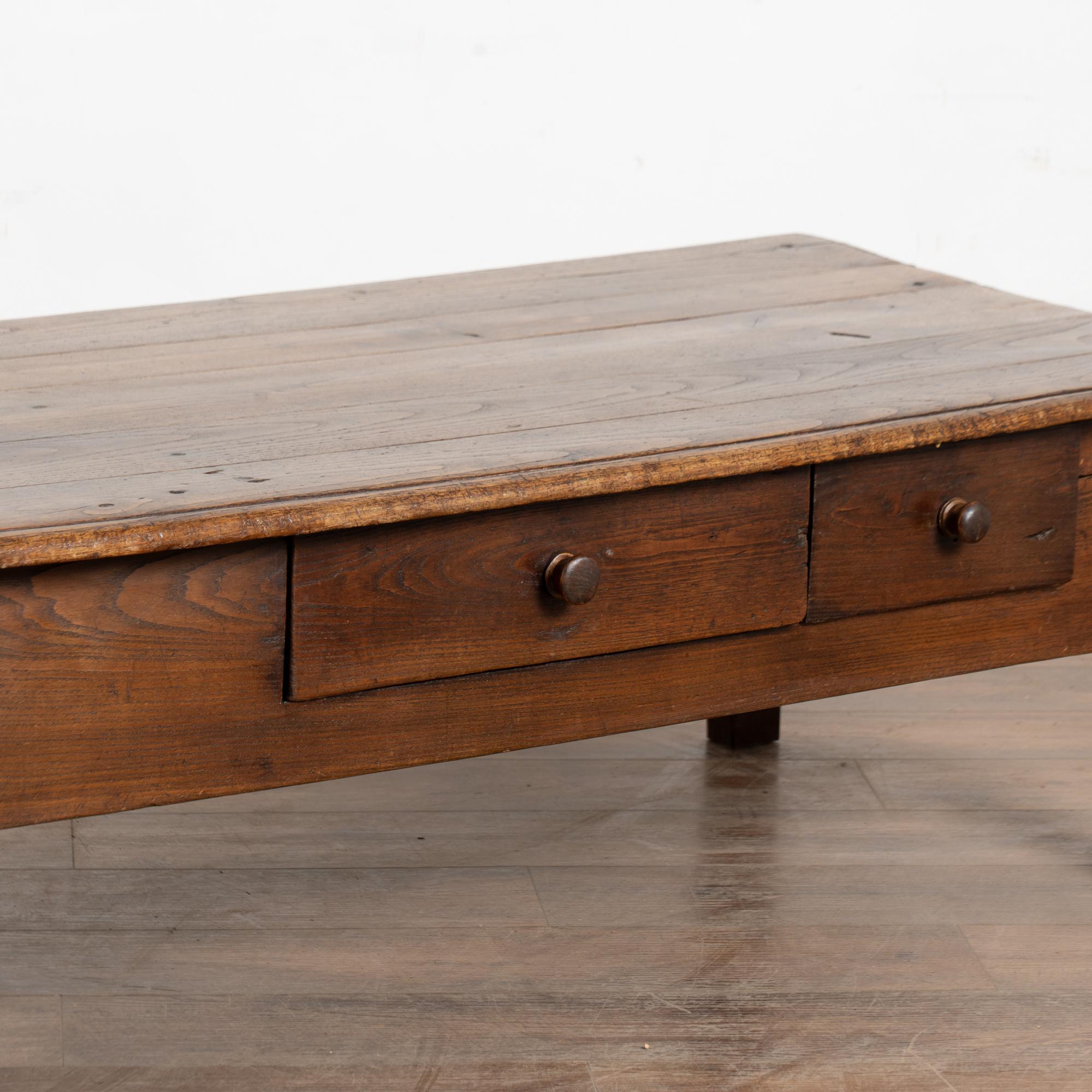 The strong appeal of this coffee table comes from the rich patina of the worn French hardwood. Every scratch, nick, crack and old dried worm holes add to the character of this coffee table.