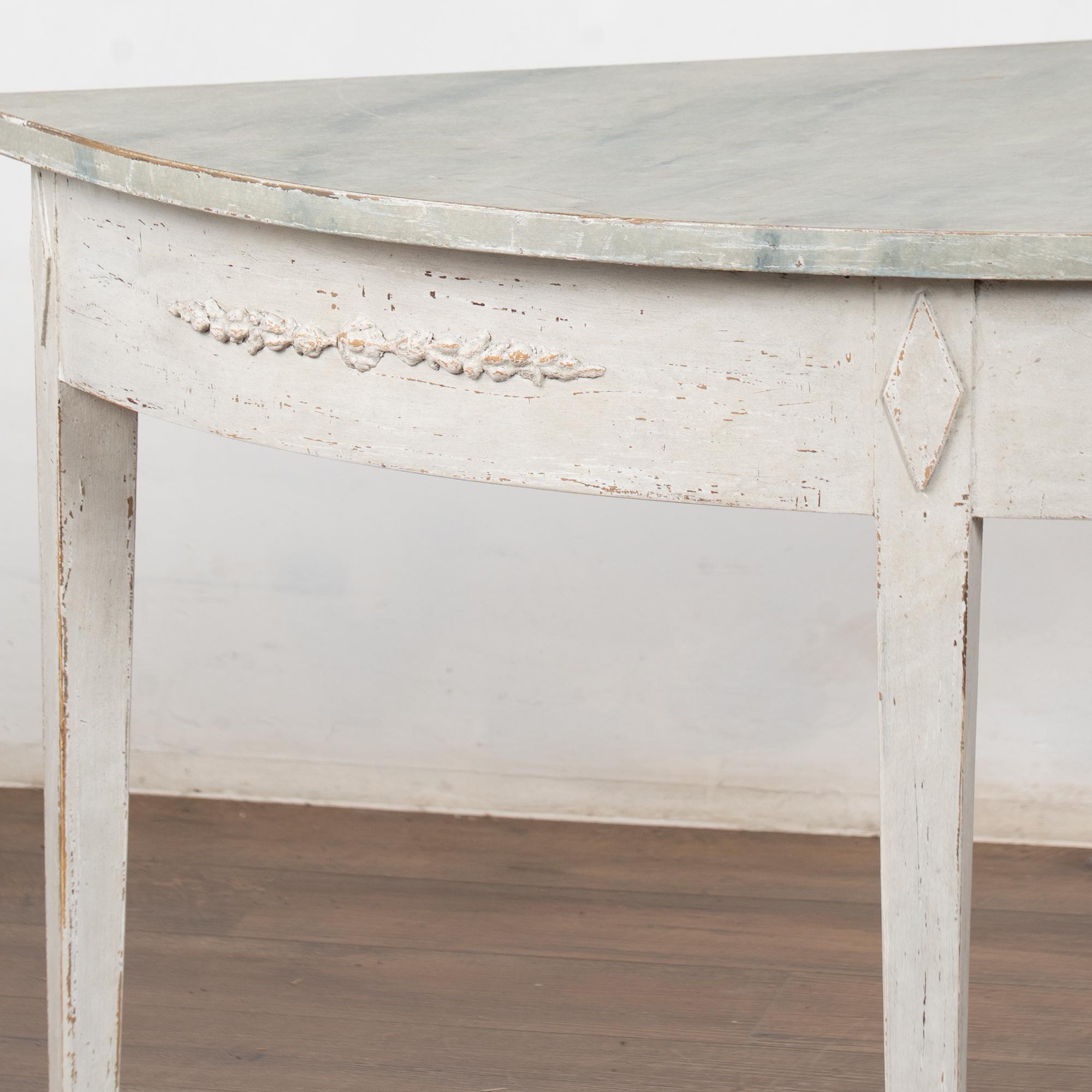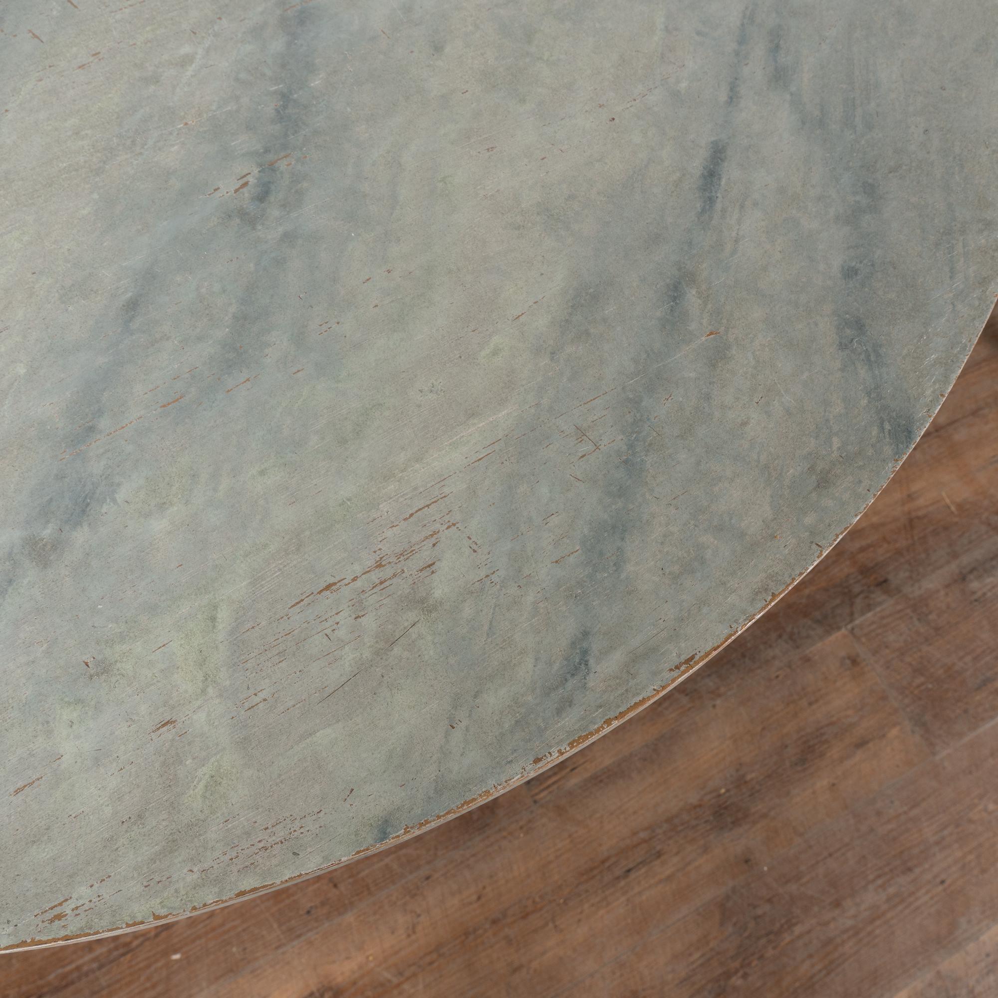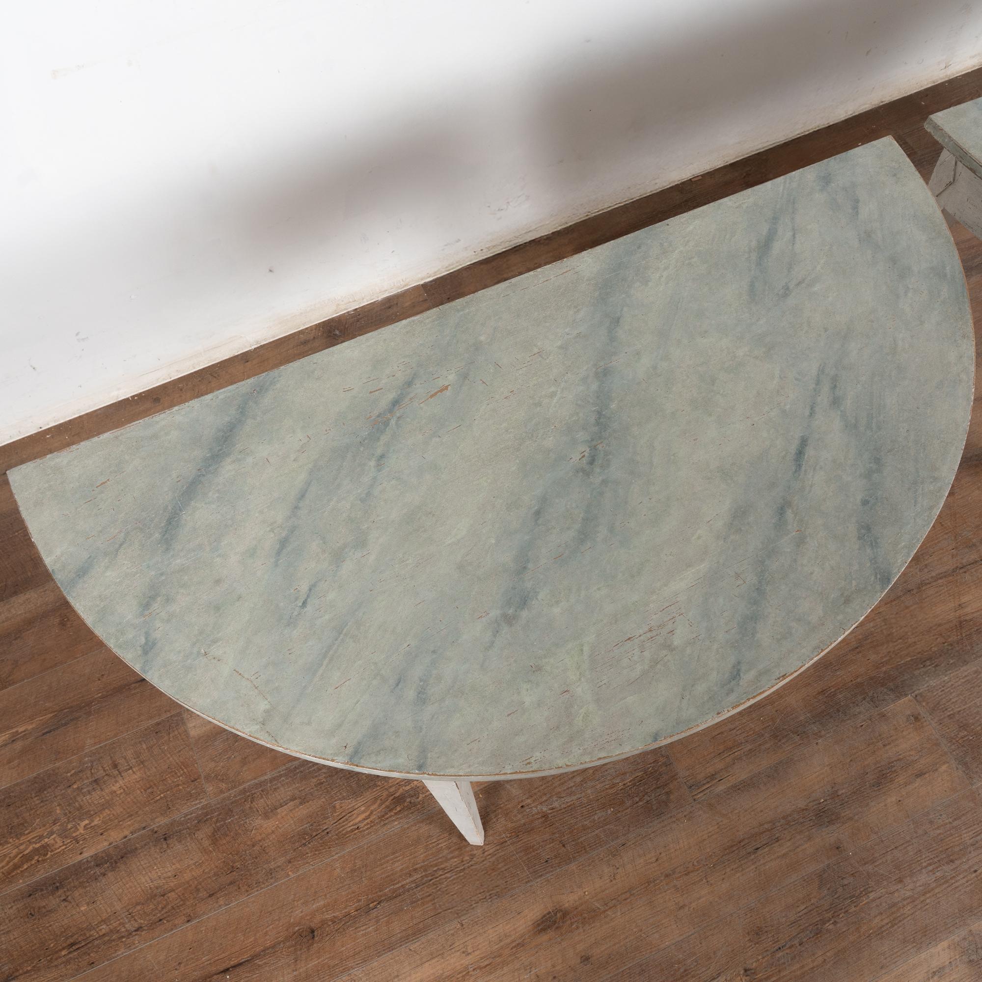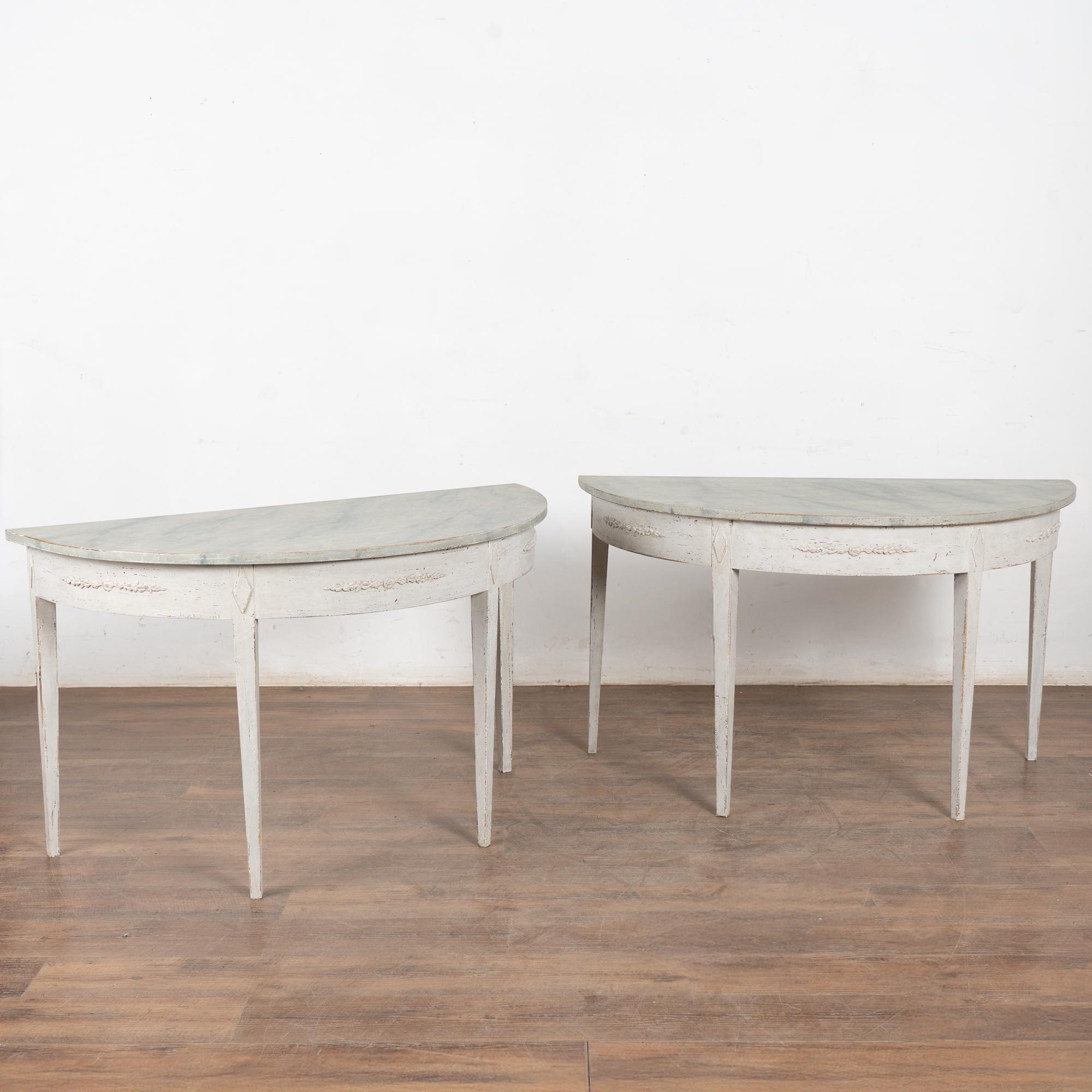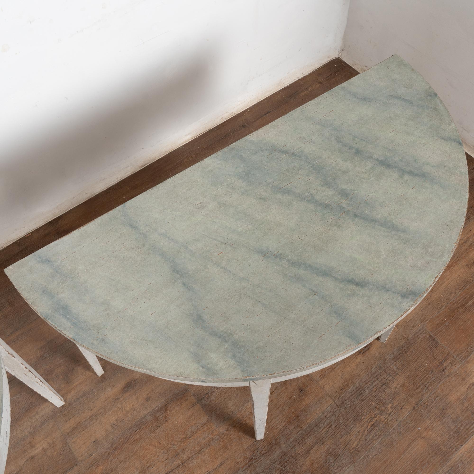 Newer professionally applied layered antique white painted finish, slightly distressed to fit age and grace of the tables. Top in contrasting light blue/gray faux marble finish, typical of the era.