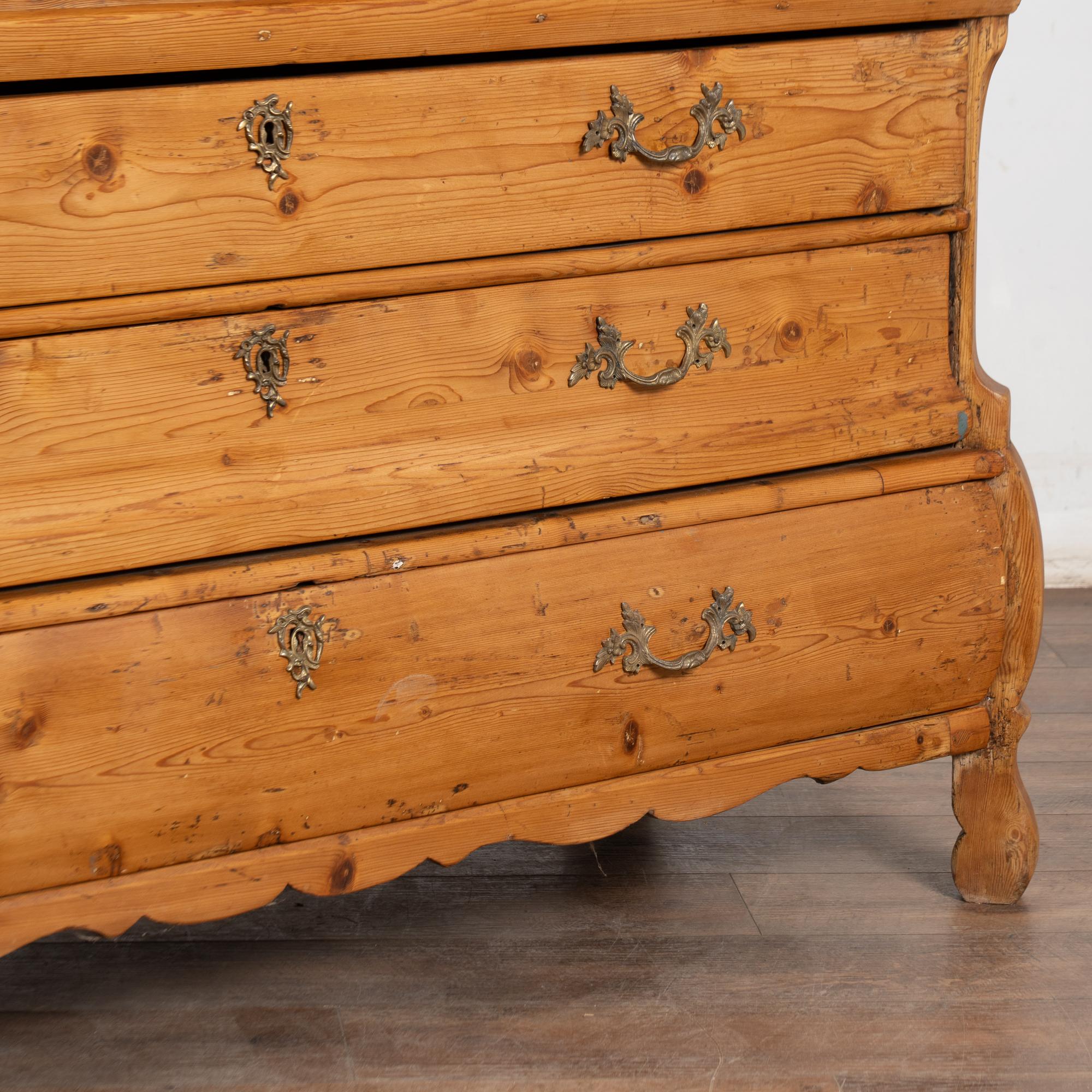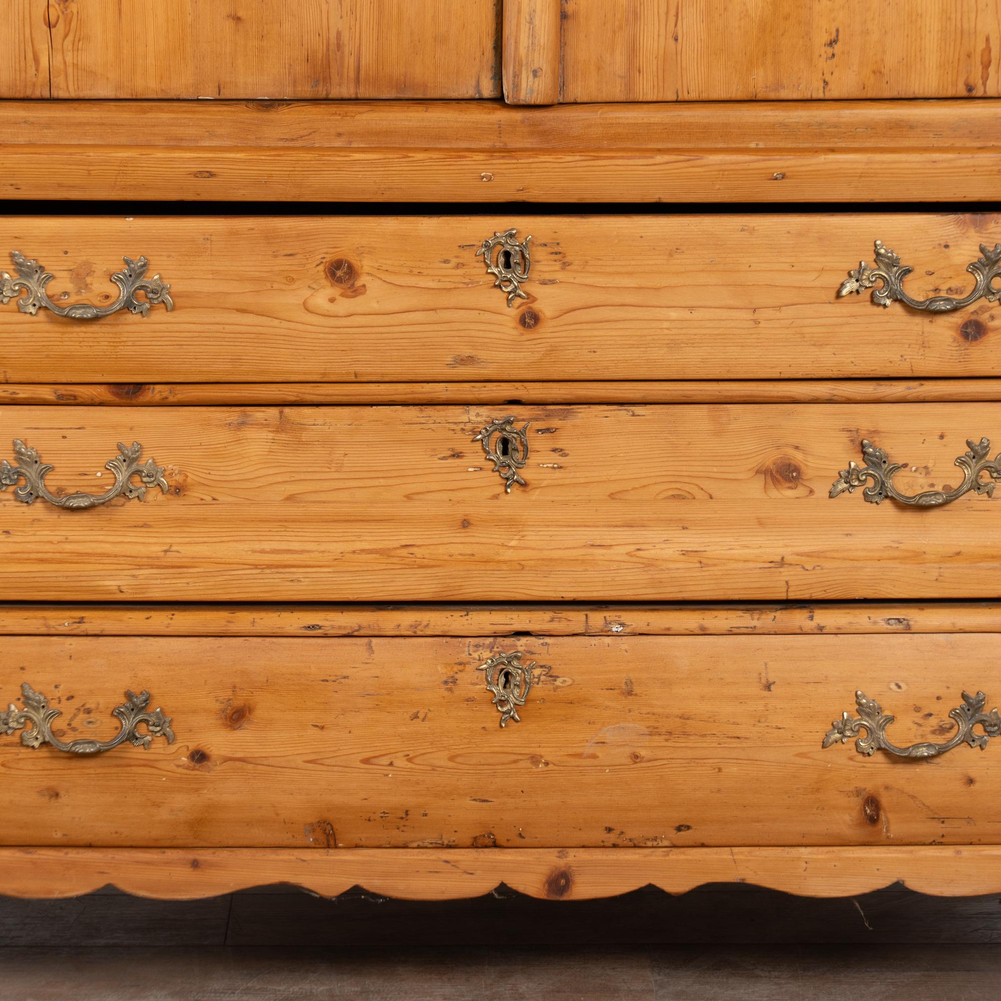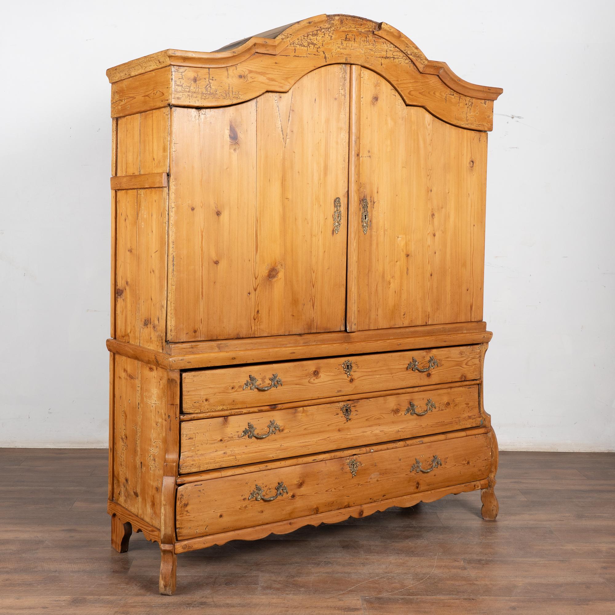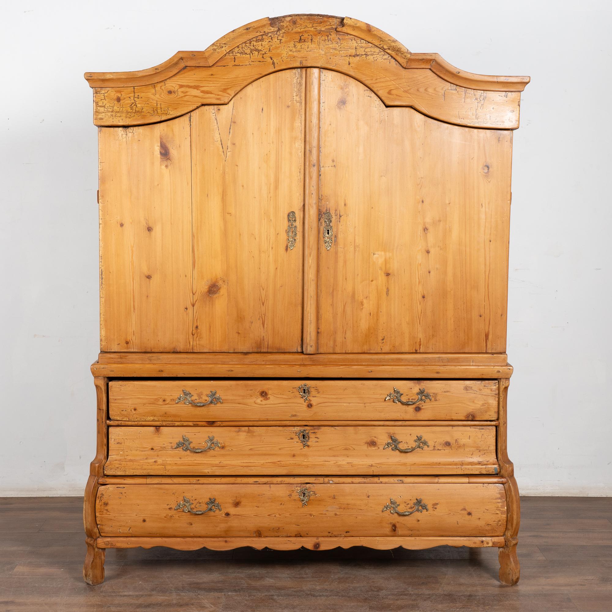 Large pine cabinet with curved bonnet (or crown), two cabinet doors over three large drawers with brass pulls. Built in two sections for easier transport.
