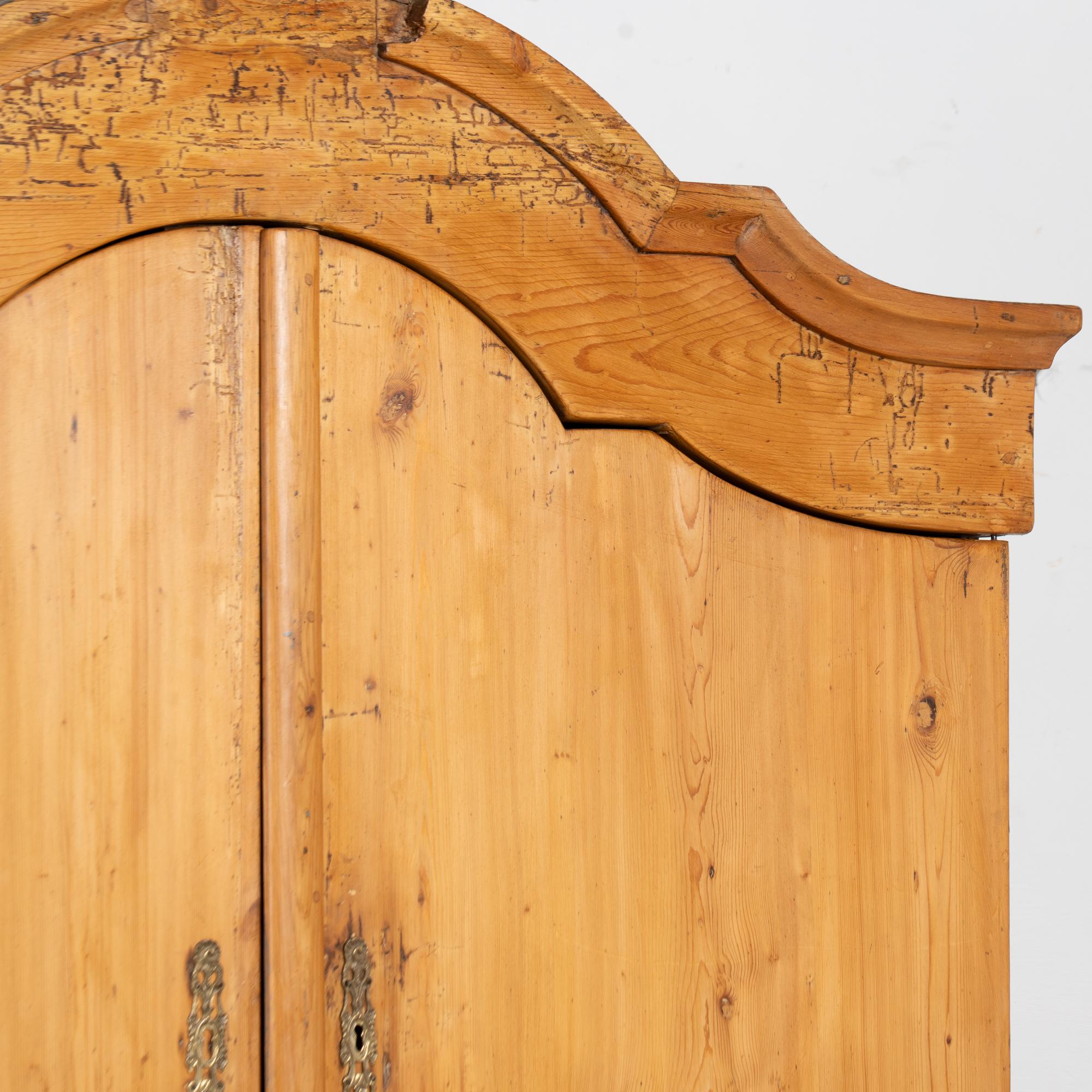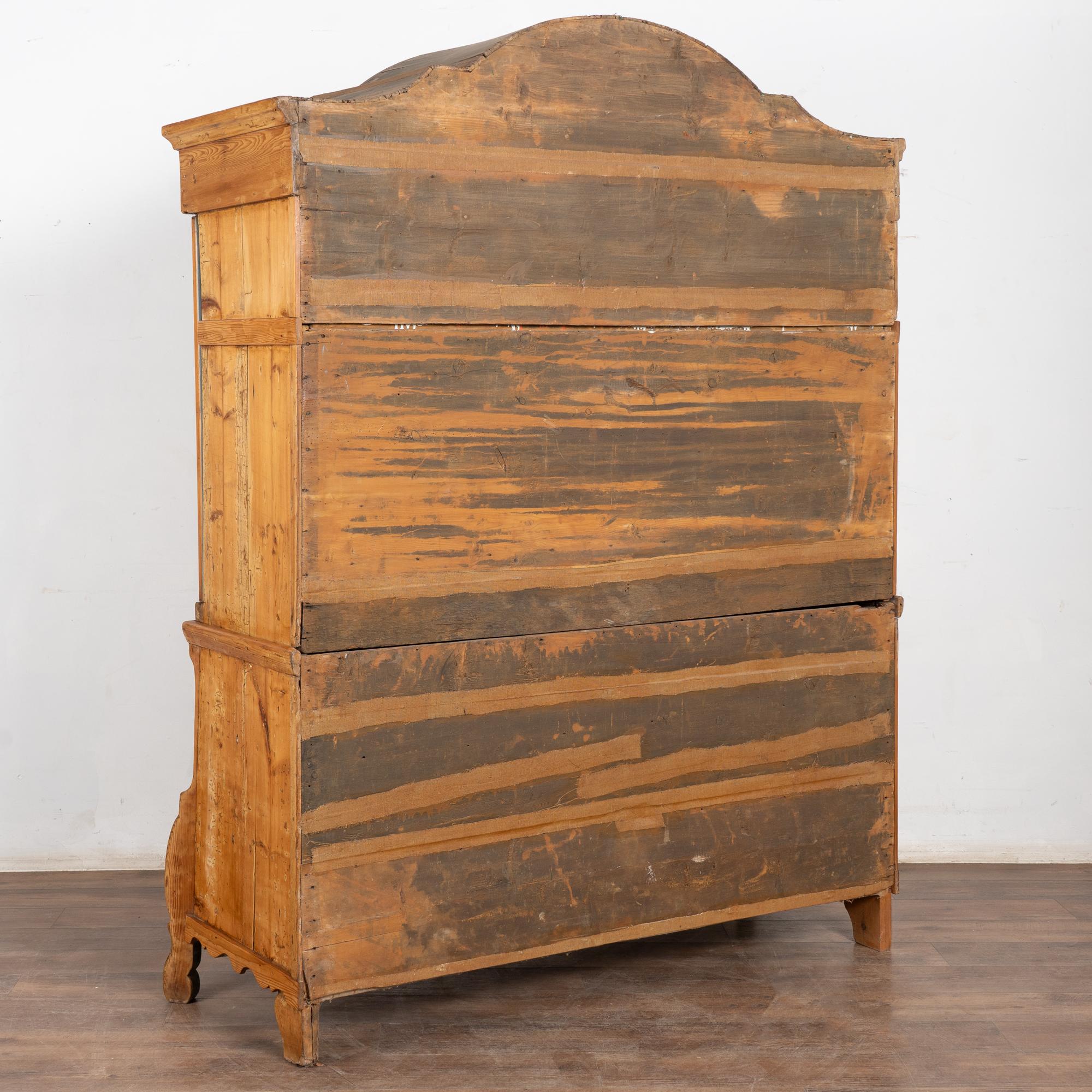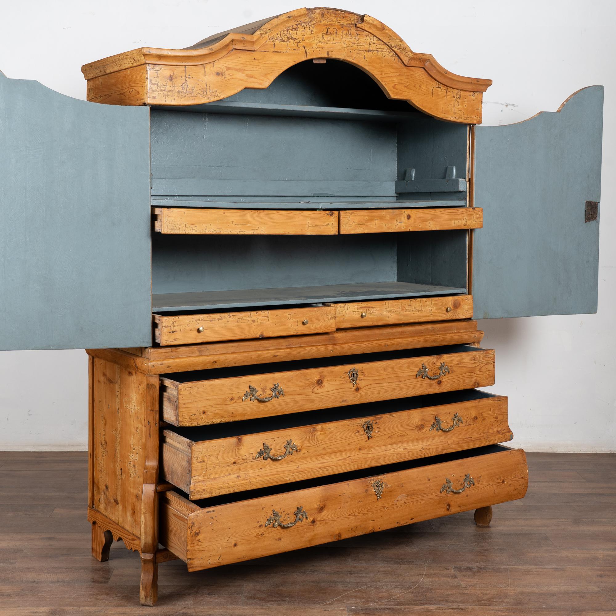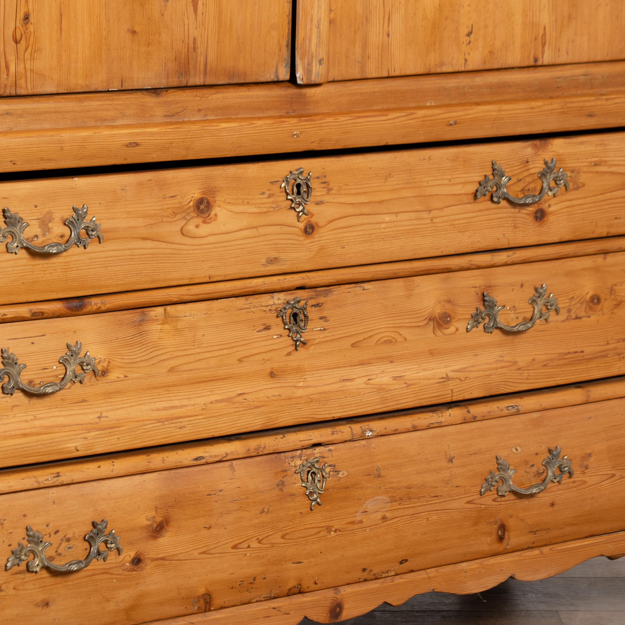Large pine cabinet with curved bonnet (or crown), two cabinet doors over three large drawers with brass pulls. Built in two sections for easier transport.