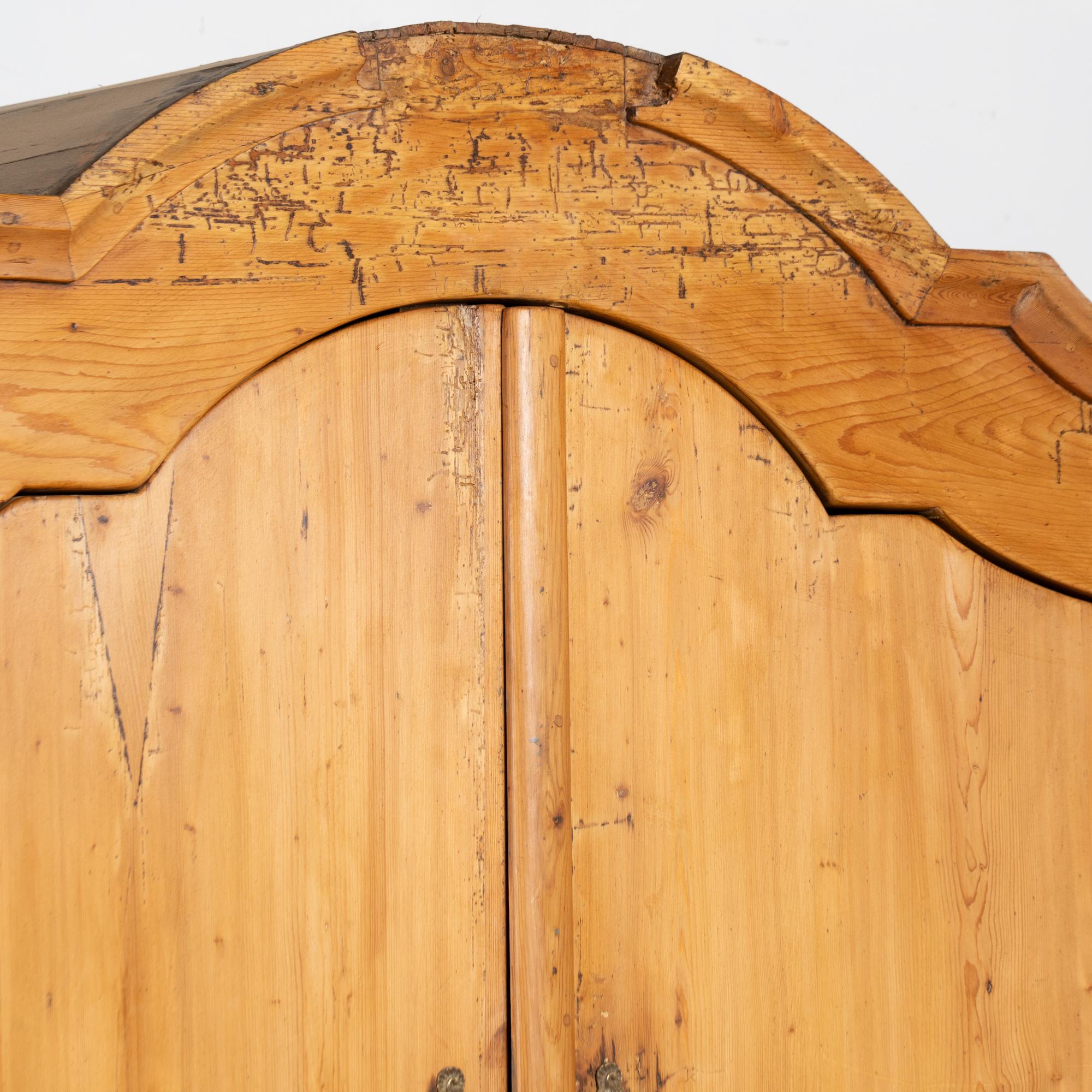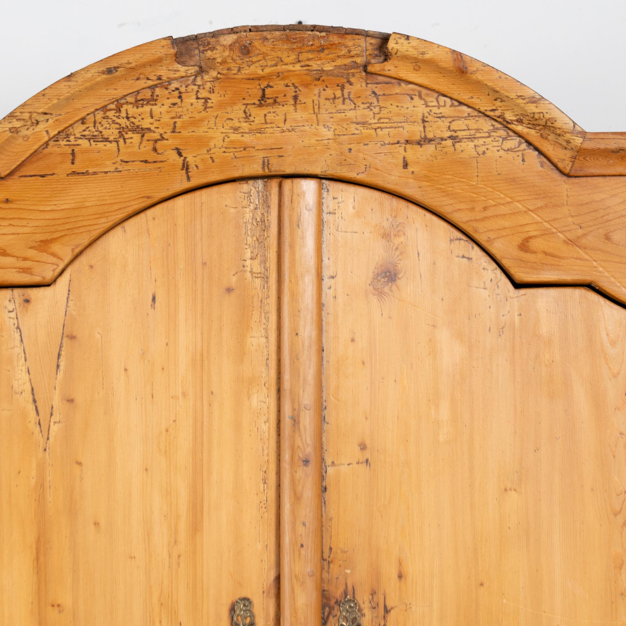 The aged pine shows warm patina with visible wormholes throughout, old repairs, cracks, and separations from generations of use.Trim on upper center crown shows past break. No key or functioning lock; an interior hook/latch holds the left door closed while right is open.