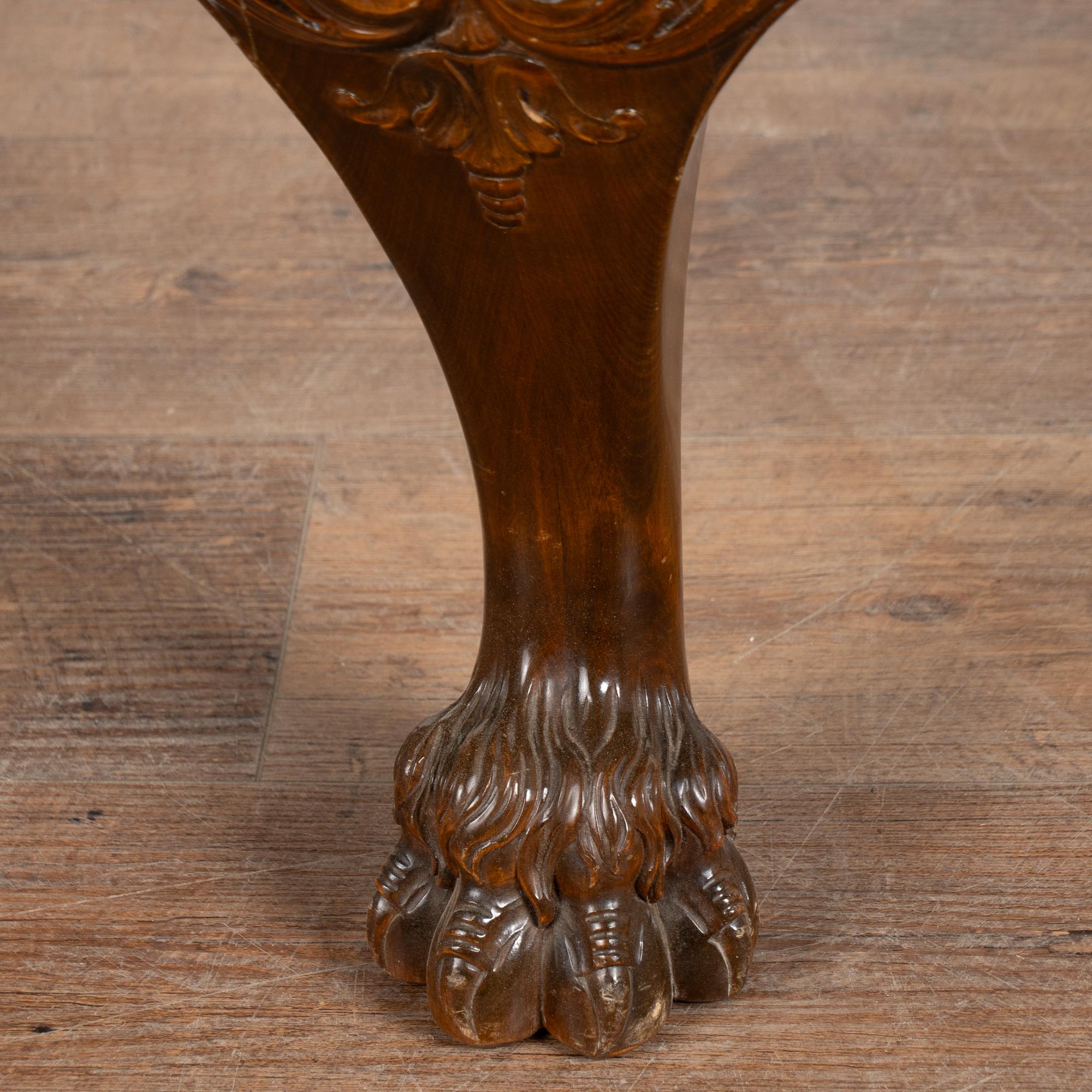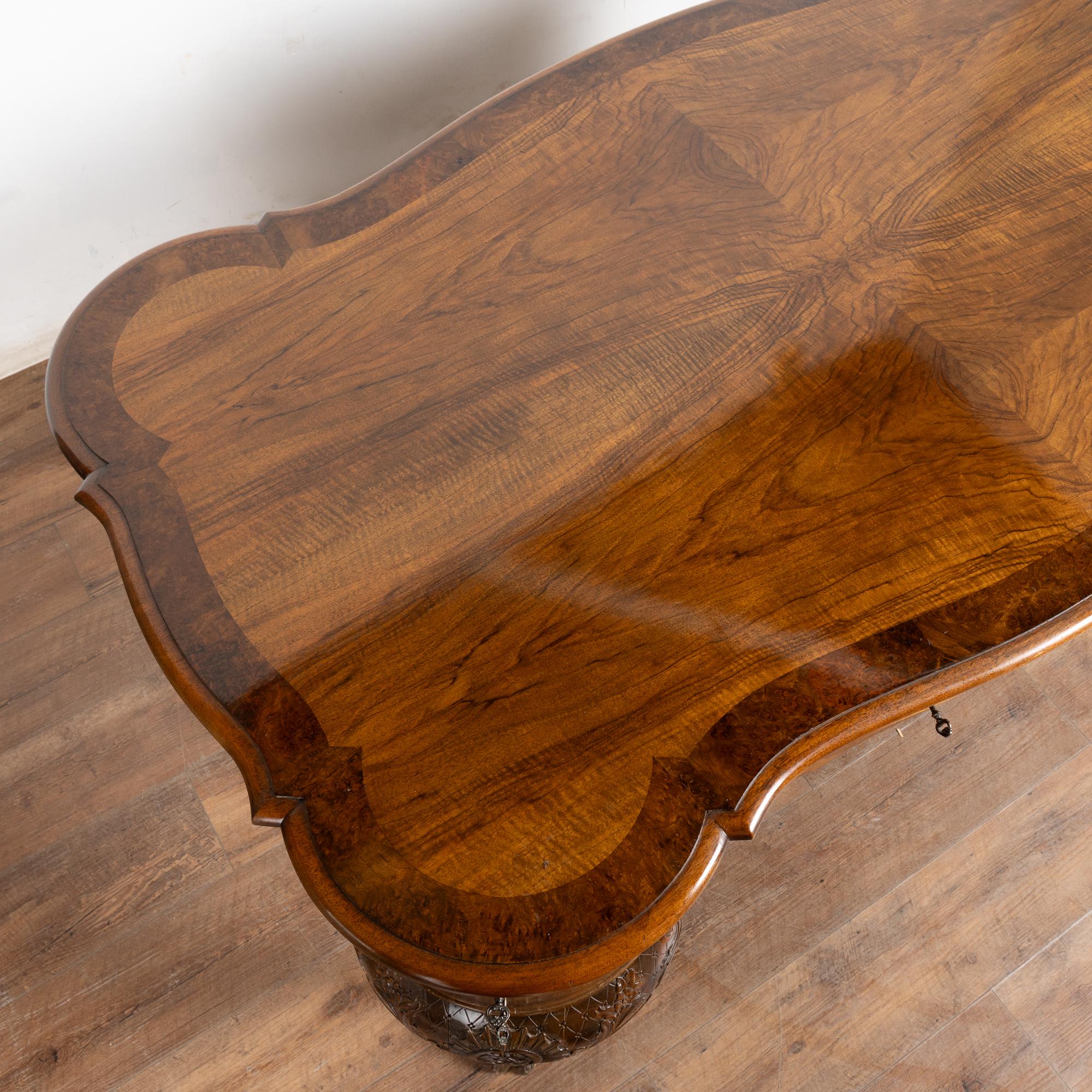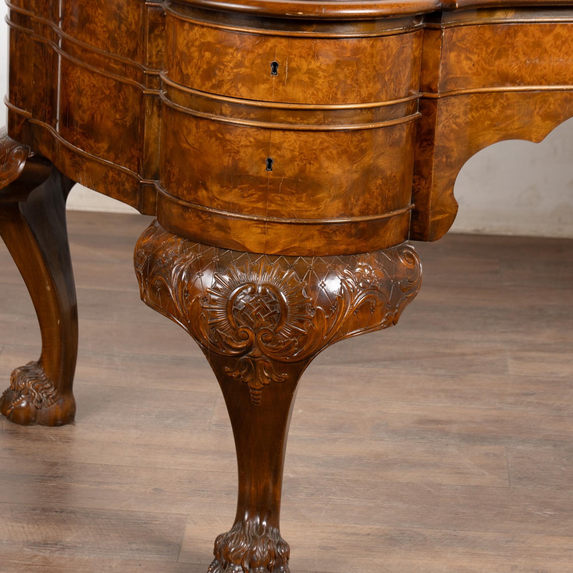 The heavily carved legs, bun feet and stretcher are mesmerizing in this stately writing desk. With three drawers on one side, this free standing desk is both functional and attractive from all angles. Please enlarge photos to appreciate the hand carved details seen throughout this striking desk.