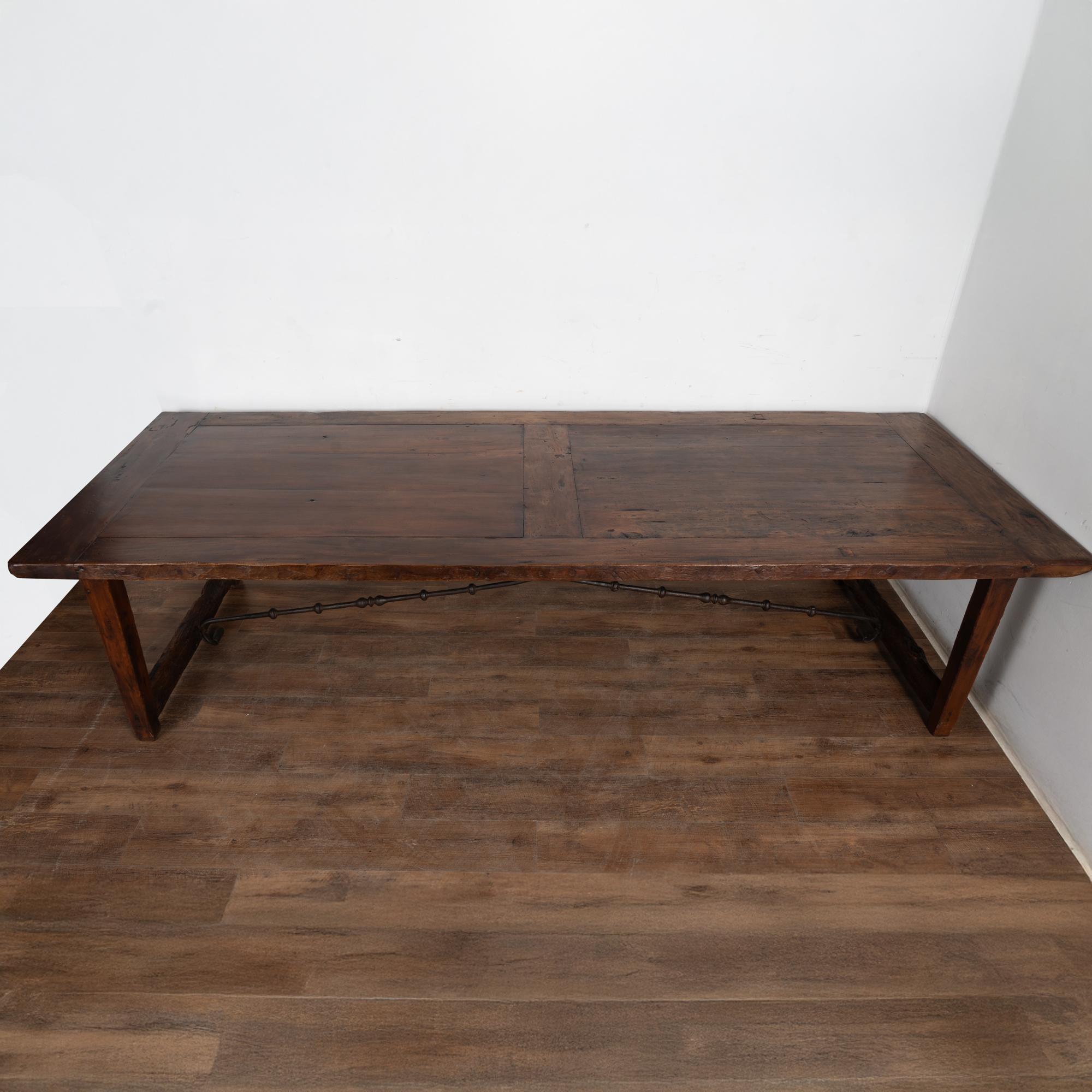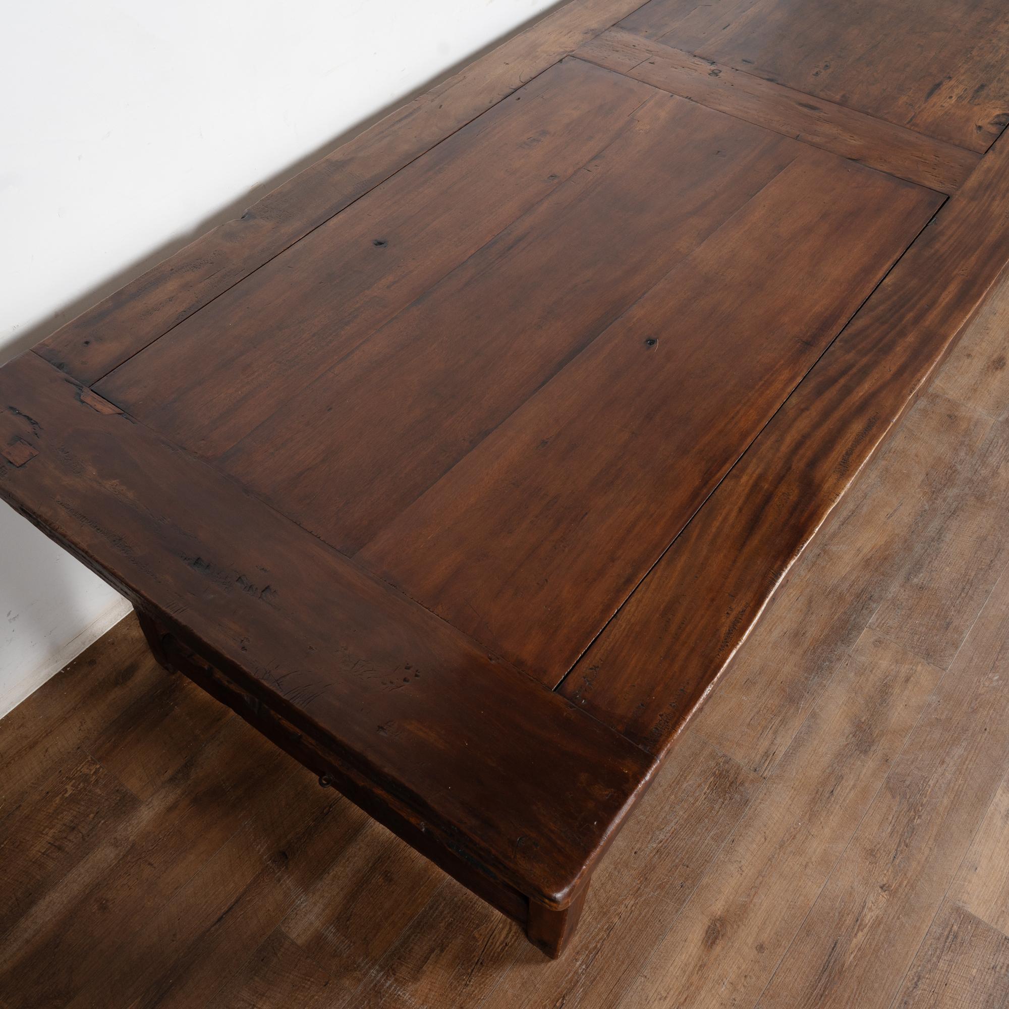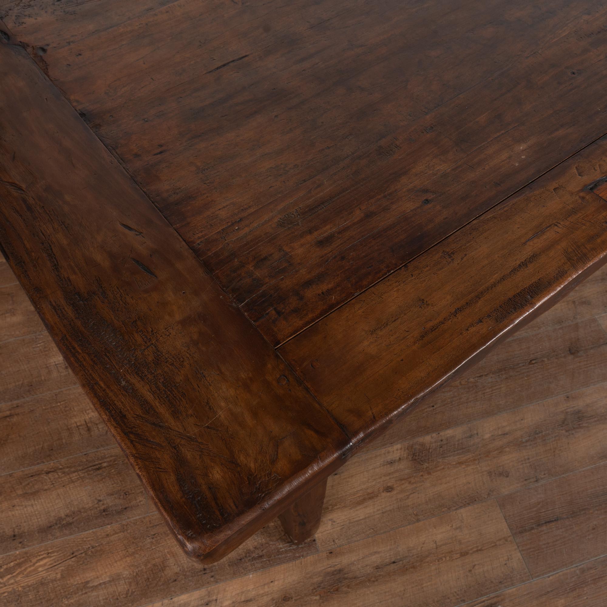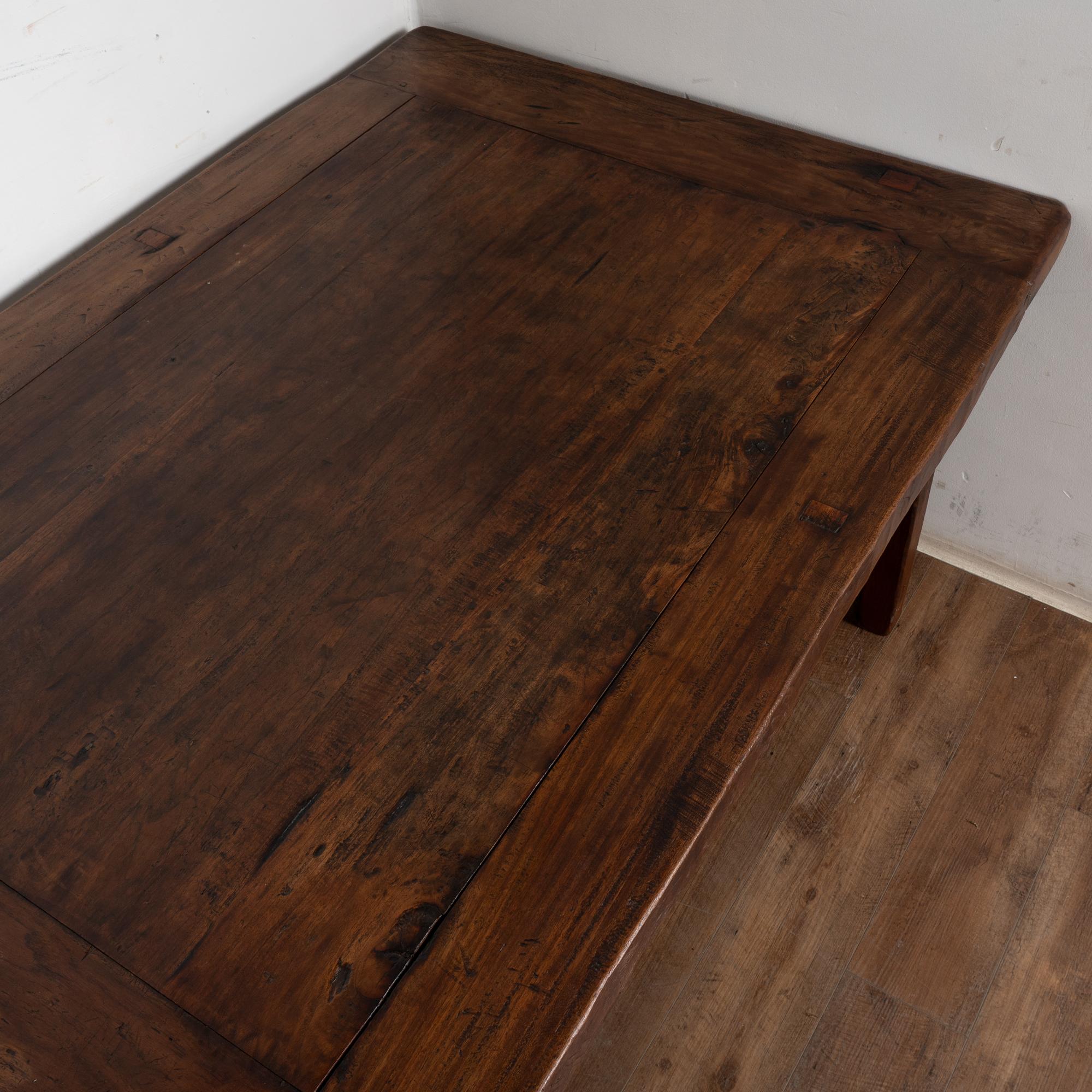 The clean lines and long top are impressive; rich character is revealed in the scratches, distress, abrasions and large butterfly repairs seen along the top (to inhibit cracks spreading) of this stunning dining table.