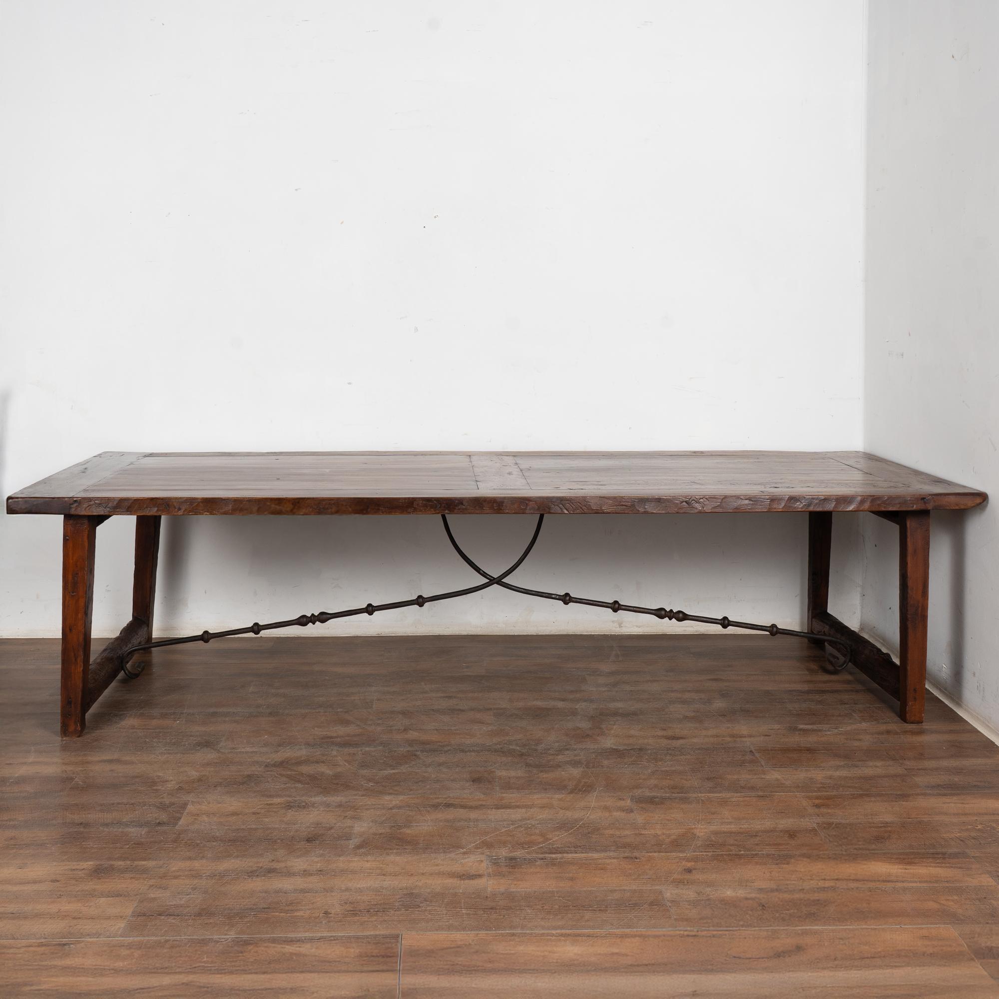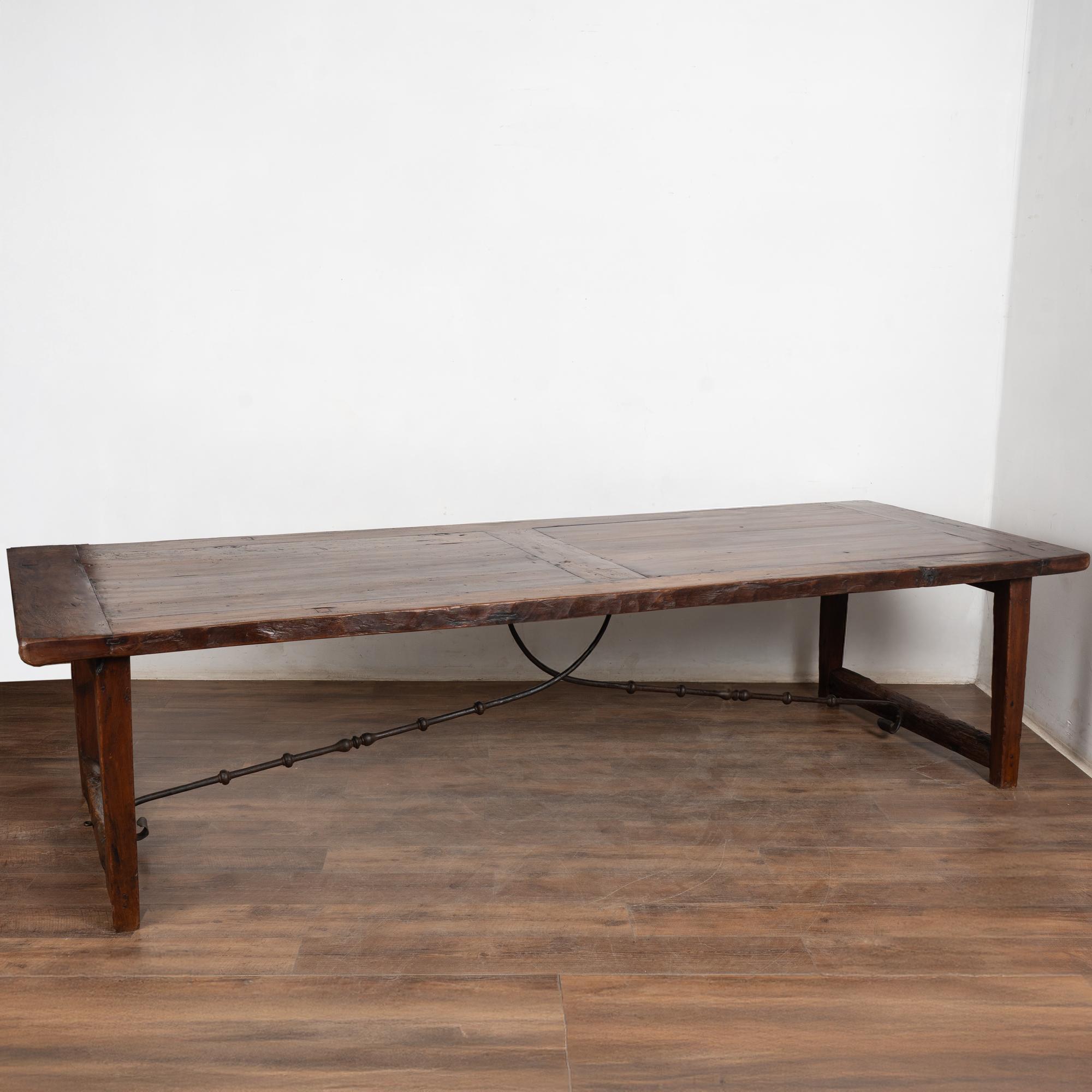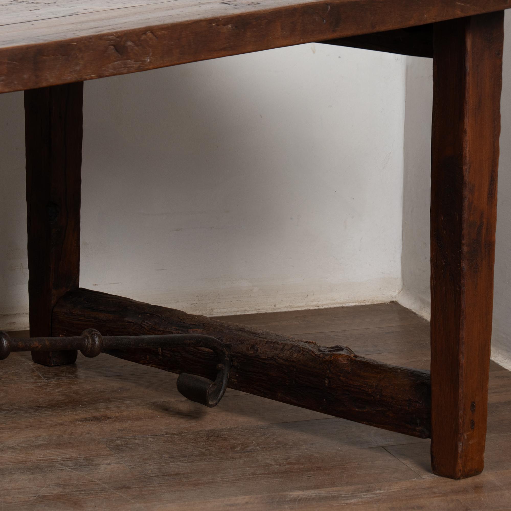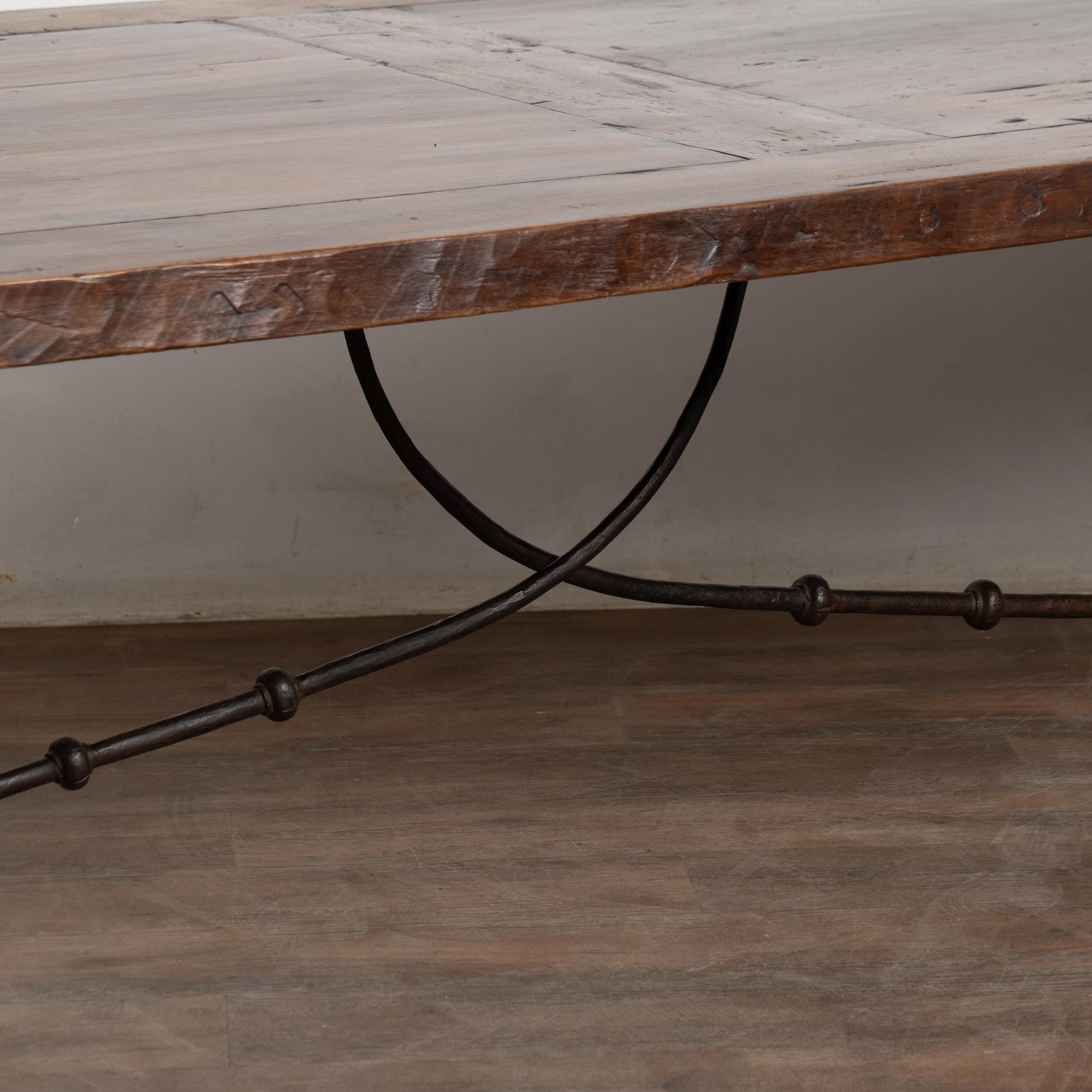 The clean lines and long top are impressive; rich character is revealed in the scratches, distress, abrasions and large butterfly repairs seen along the top (to inhibit cracks spreading) of this stunning dining table.