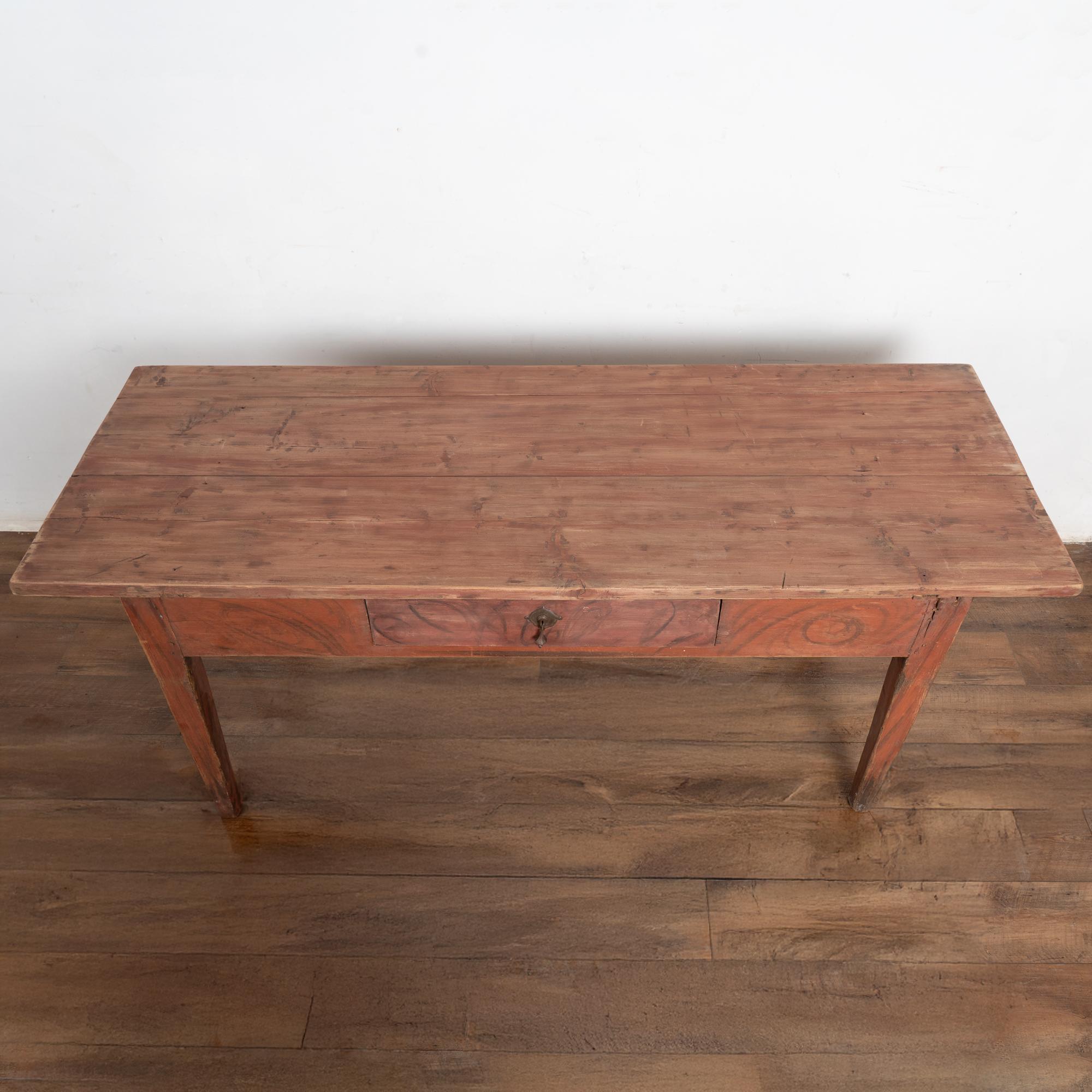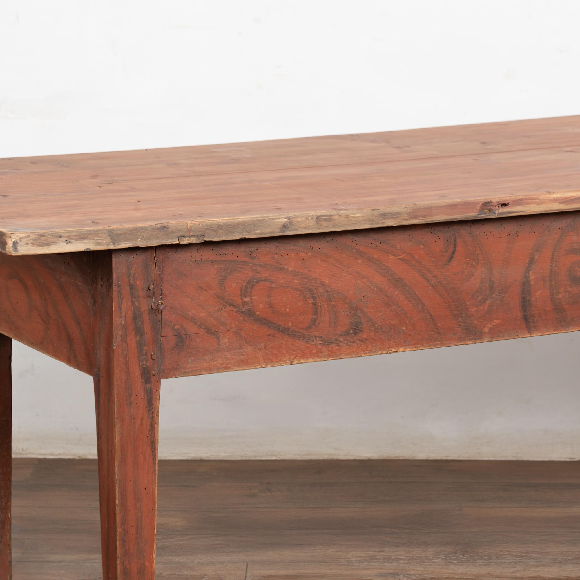 19th-century Swedish pine farm table retaining its original red painted surface and traditional country form. The table features tapered legs and a single drawer fitted with a drop pull. The brick red painted base displays a faux wood/marbling technique that was a traditional folk art motif of the era.