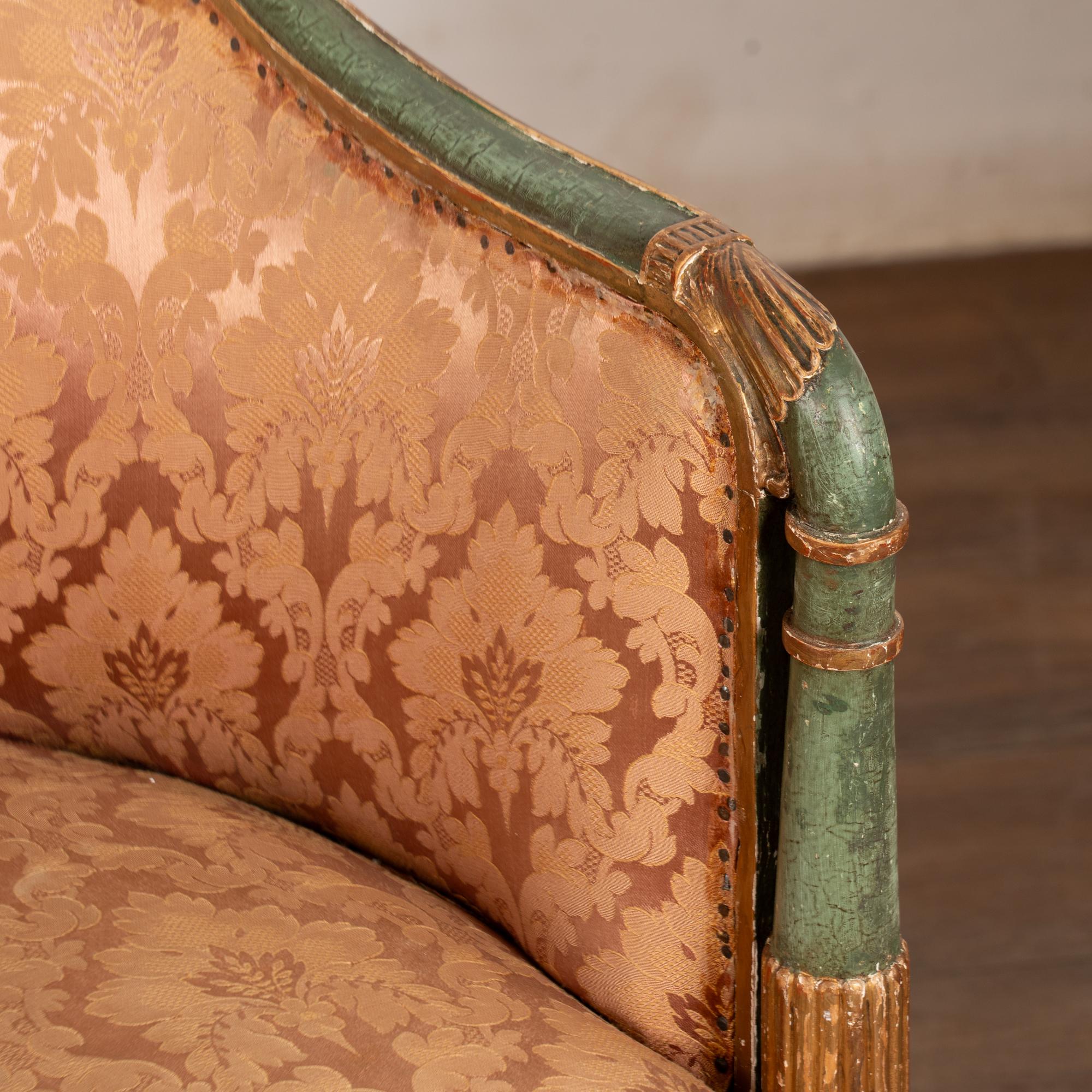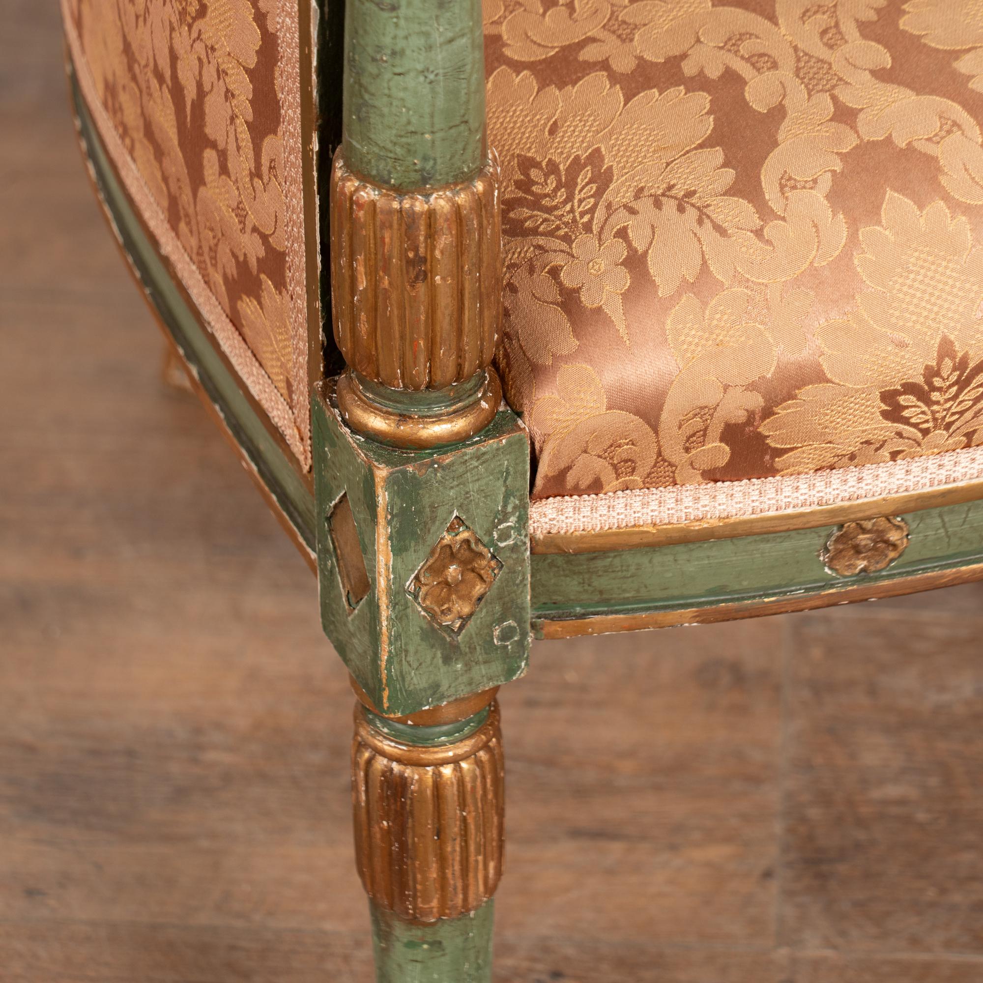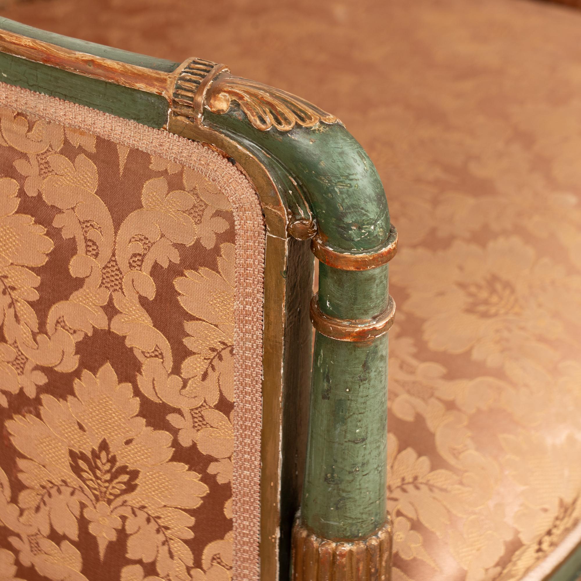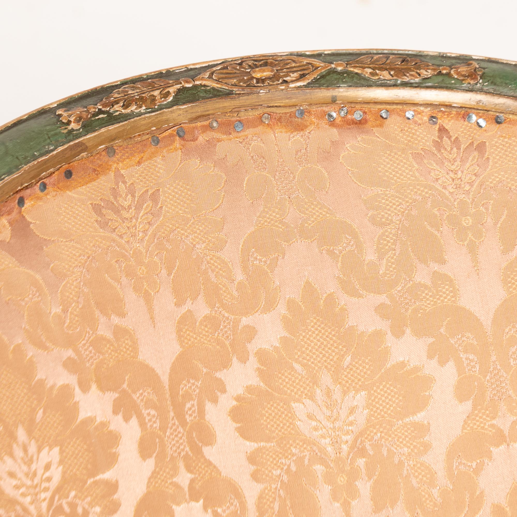 Painted wooden frame with carved and bronzed decoration. Upholstered in textile. Seat height 38, width 60, height 91 cm.