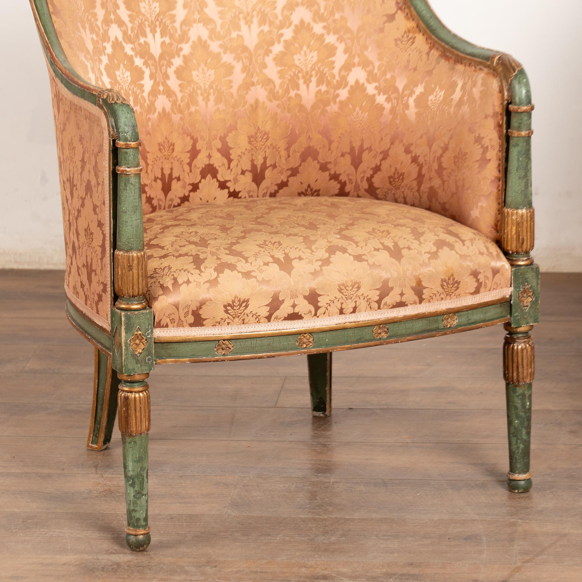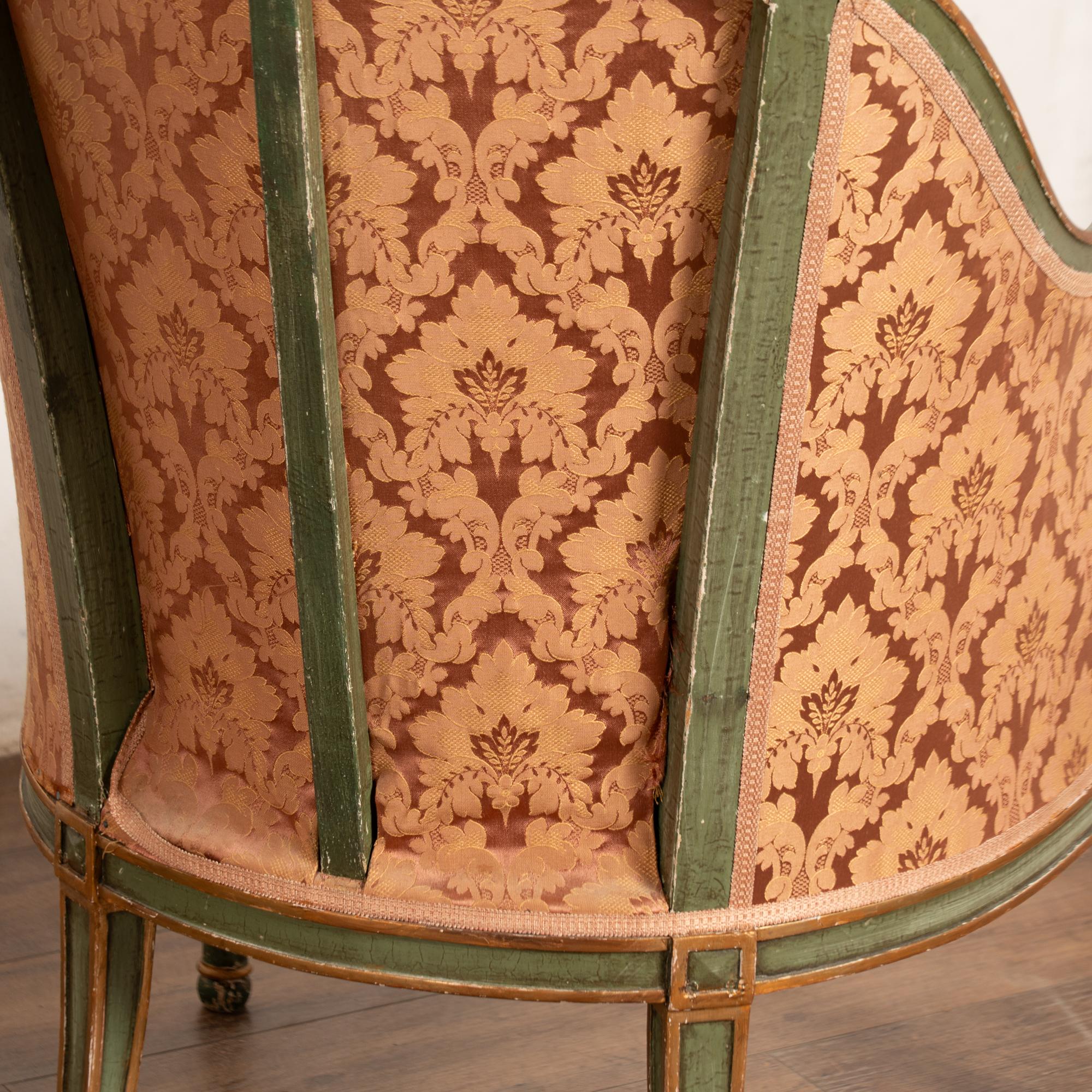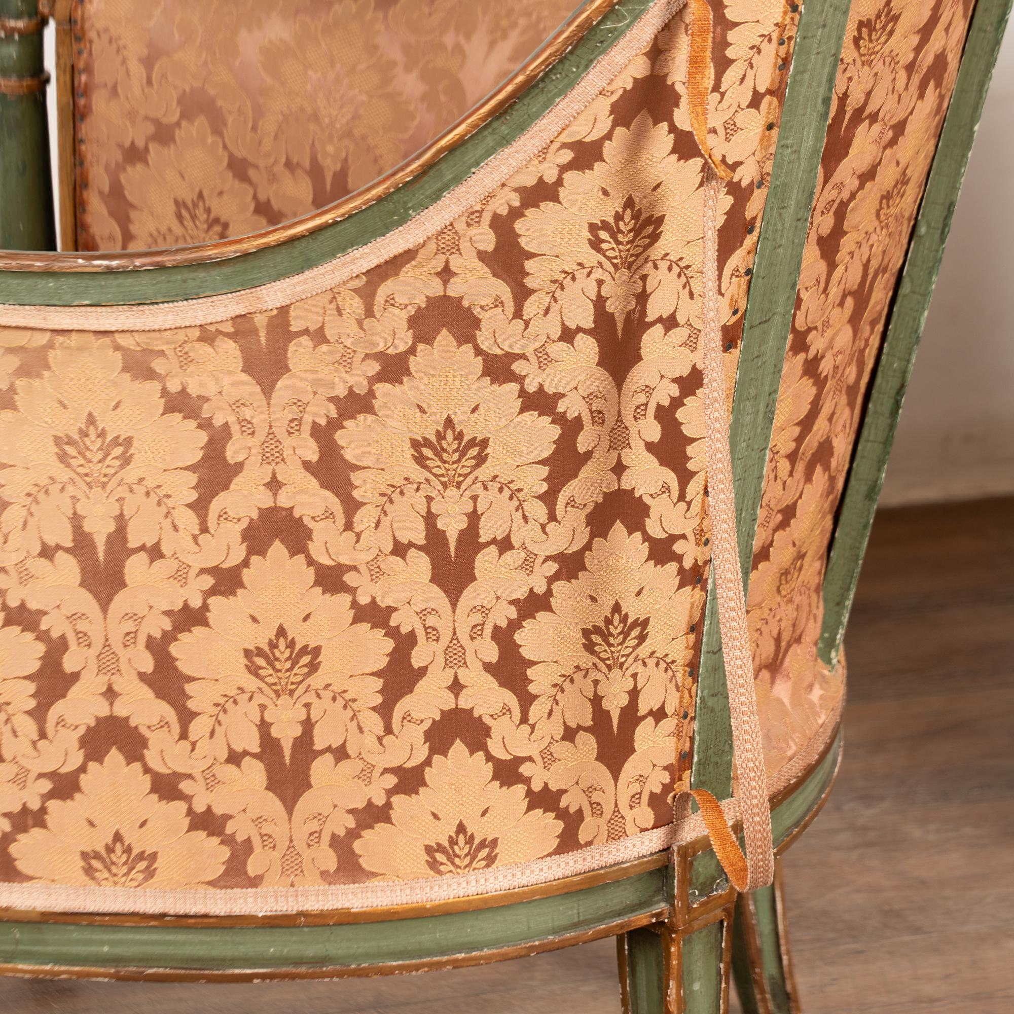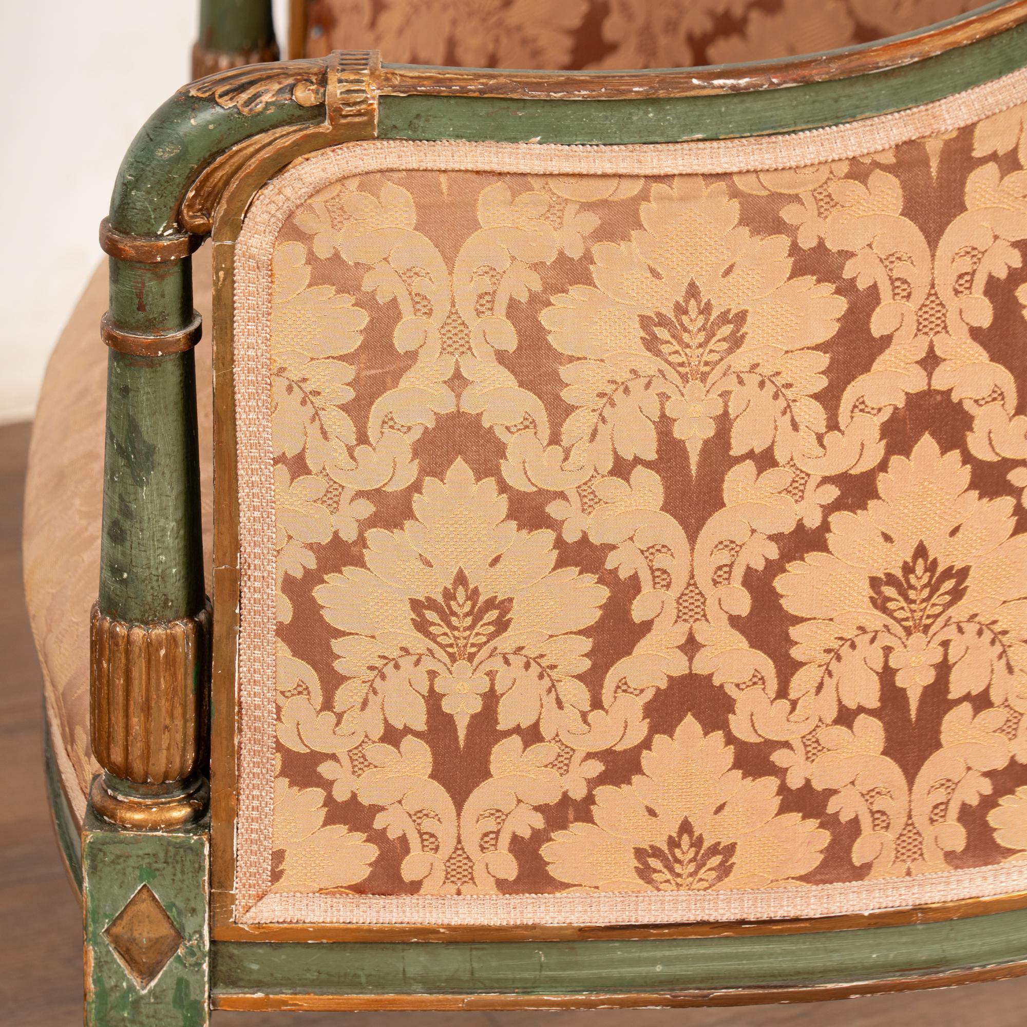 Painted wooden frame with carved and bronzed decoration. Upholstered in textile. Seat height 38, width 60, height 91 cm.