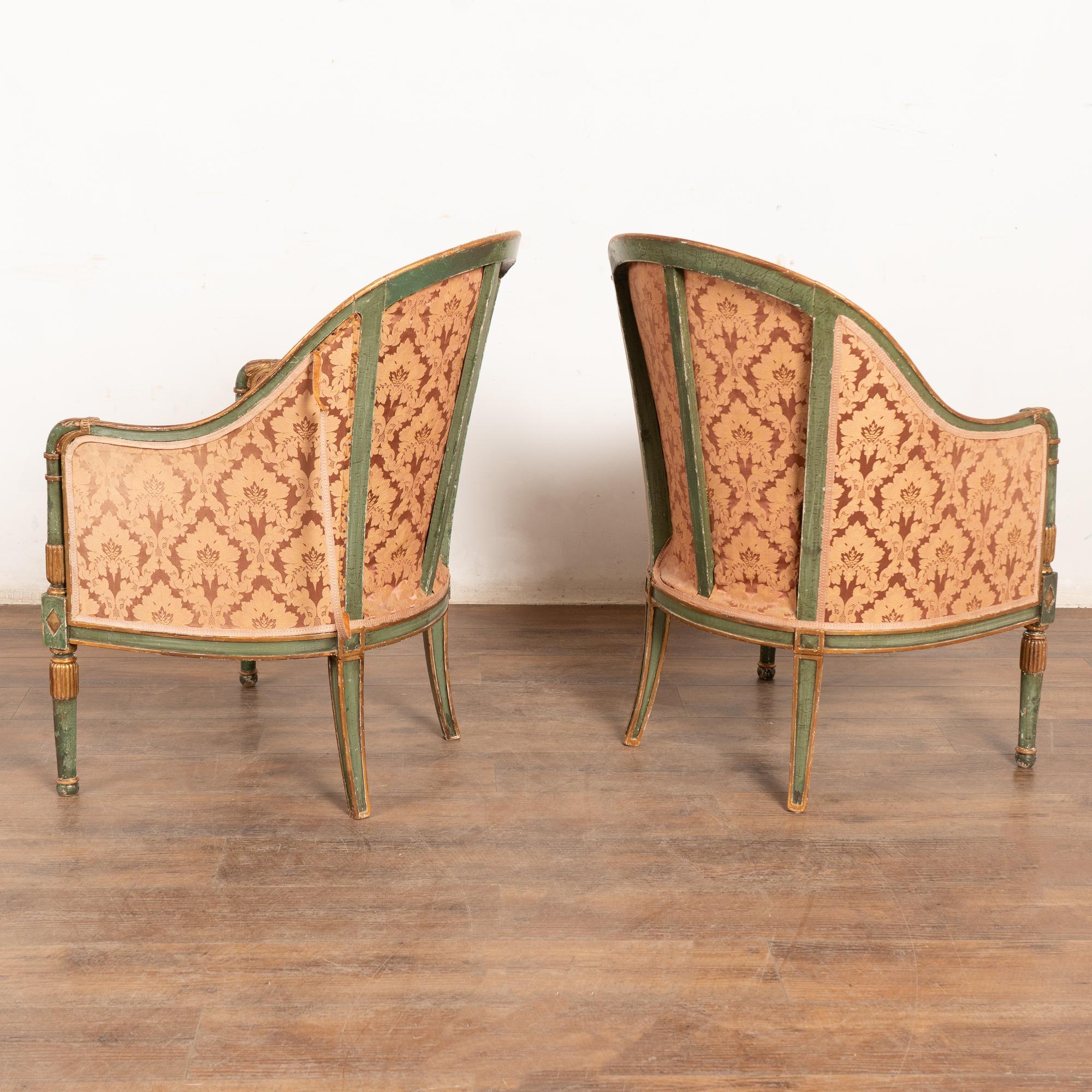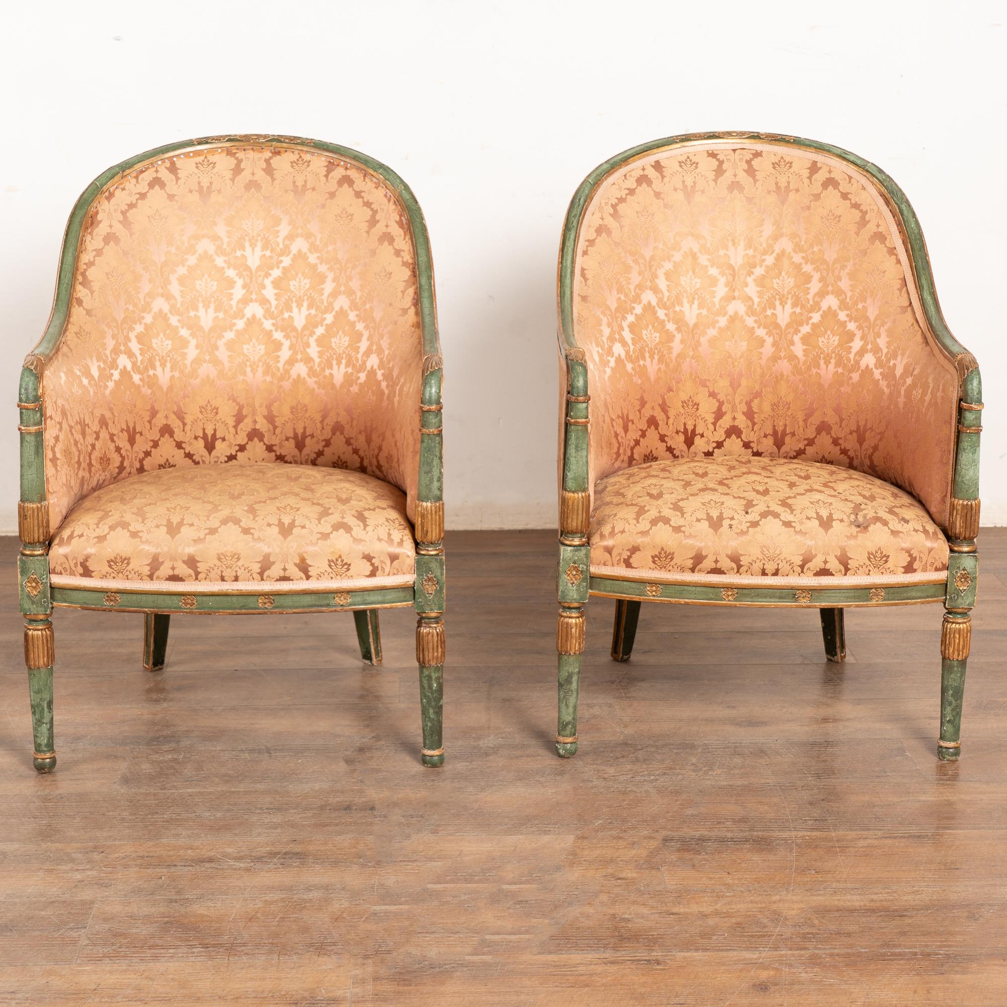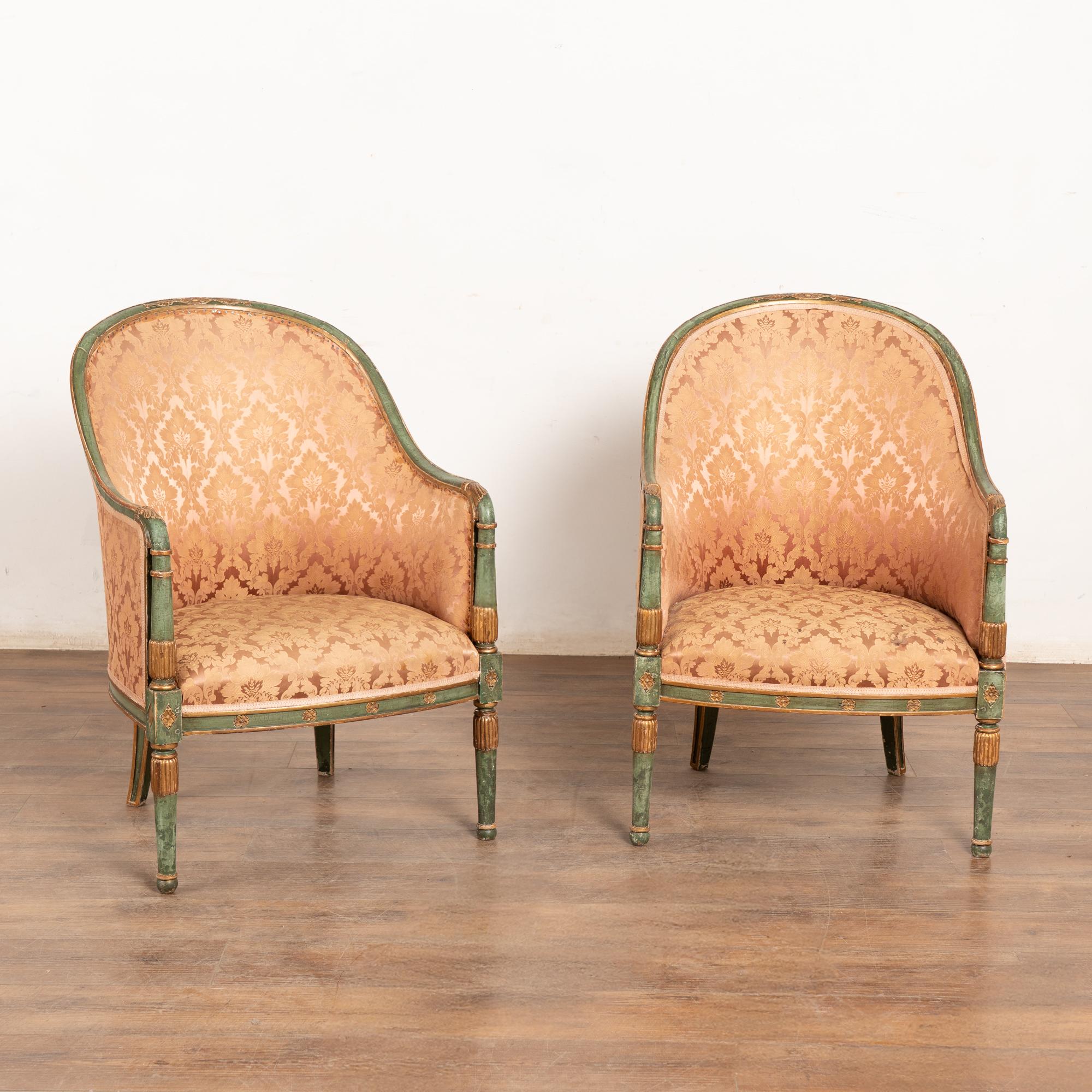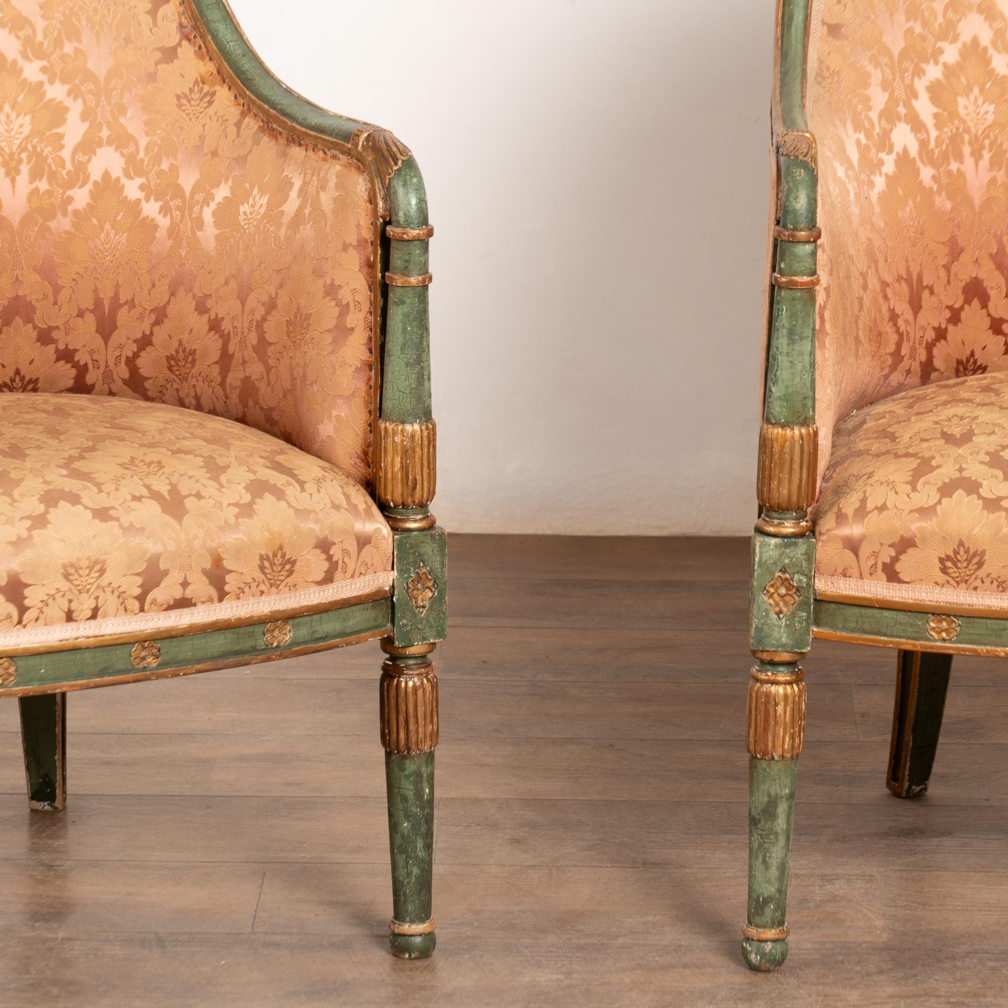 Painted wooden frame with carved and bronzed decoration. Upholstered in textile. Seat height 38, width 60, height 91 cm.