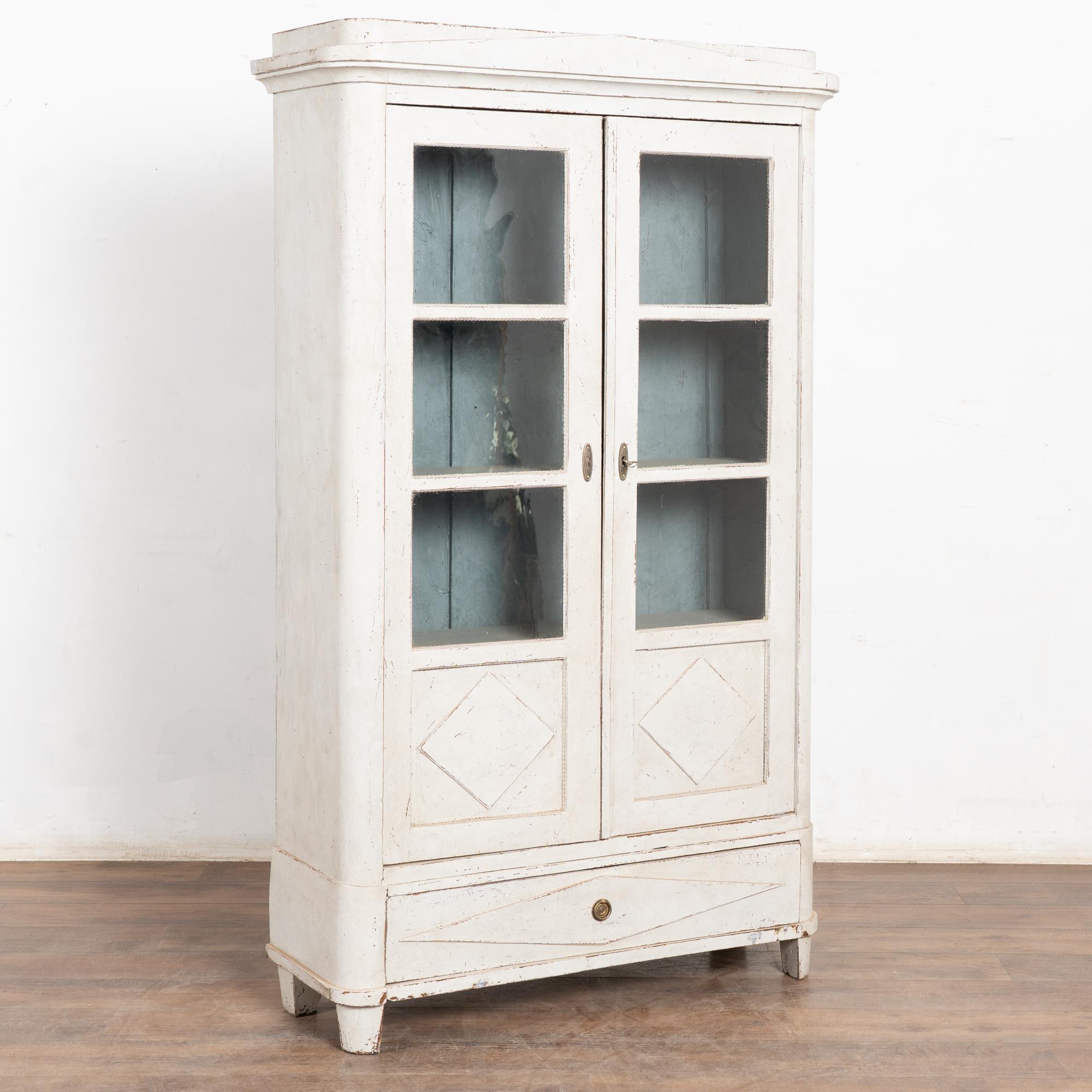 Small Swedish Gustavian pine bookcase featuring a professionally applied layered antique white painted finish with pale gray undertones. Light distressing reveals natural pine wood beneath and fits the age and grace of this cabinet.