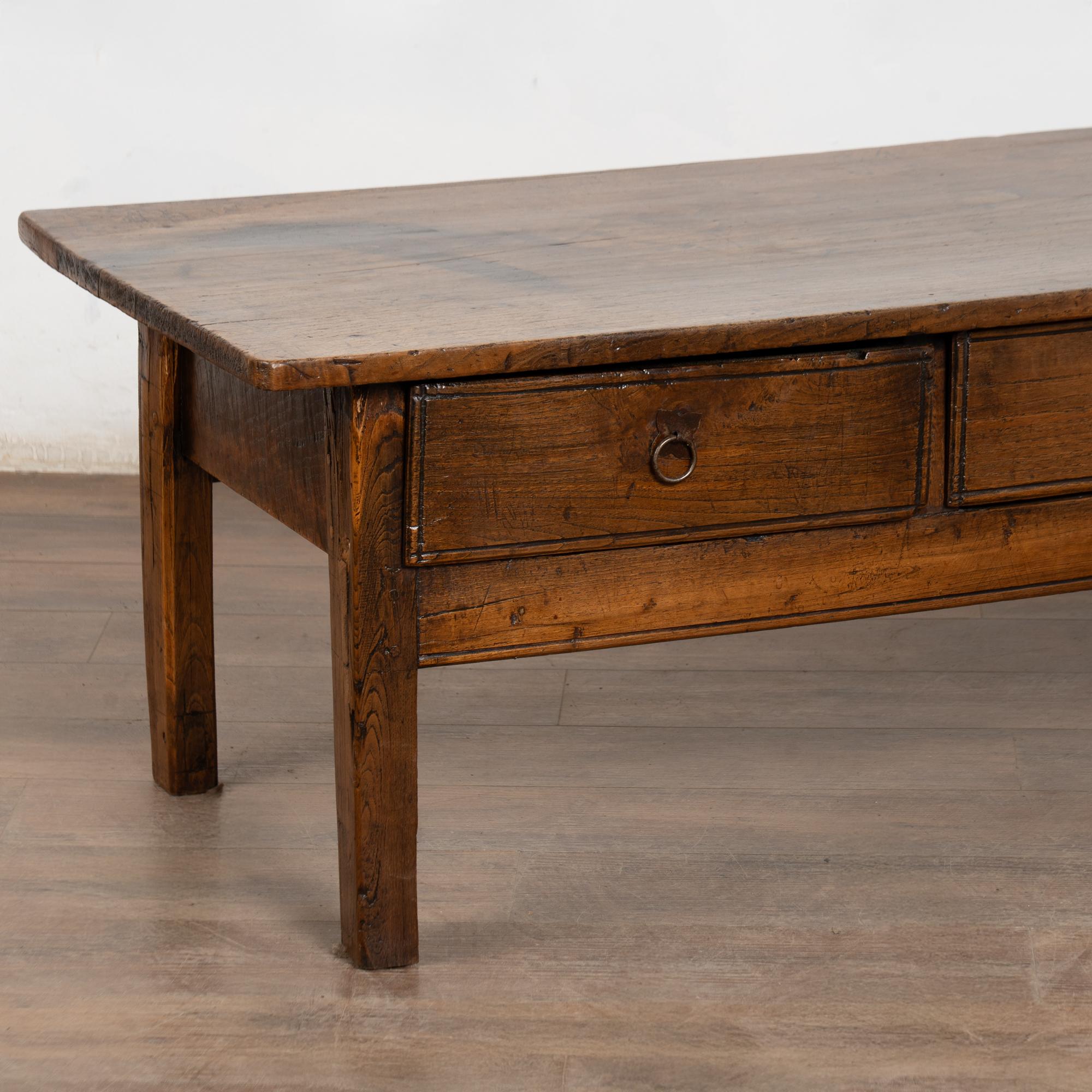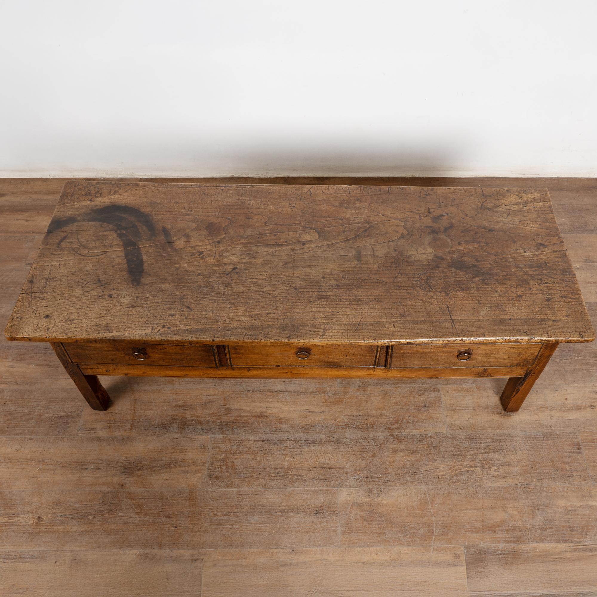 19th-century French oak coffee table with three functional drawers fitted with metal pulls. Square legs and pegged joinery reinforce its traditional construction. The top and legs reflect long use through visible character marks and historic repairs to old cracks, typical of antique French oak furniture. Drawers slide smoothly and provide excellent storage.