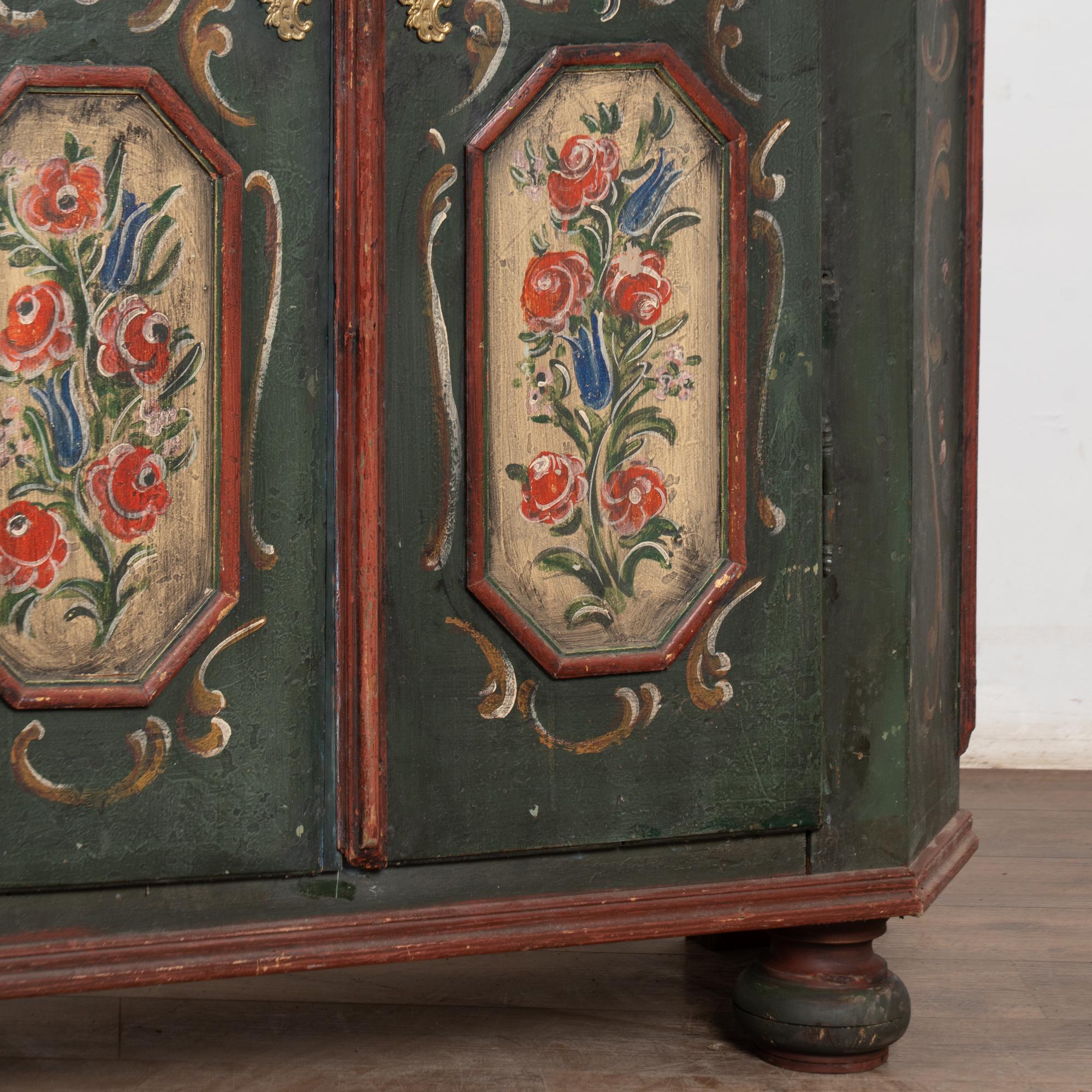 Early 19th-century German pine two-door armoire ("Shrunk") retaining its hand-painted finish. Front doors feature four paneled sections with floral motif, canted sides, painted in a forest green base accented by deep burgundy detailing. The piece rests on traditional bun feet.
