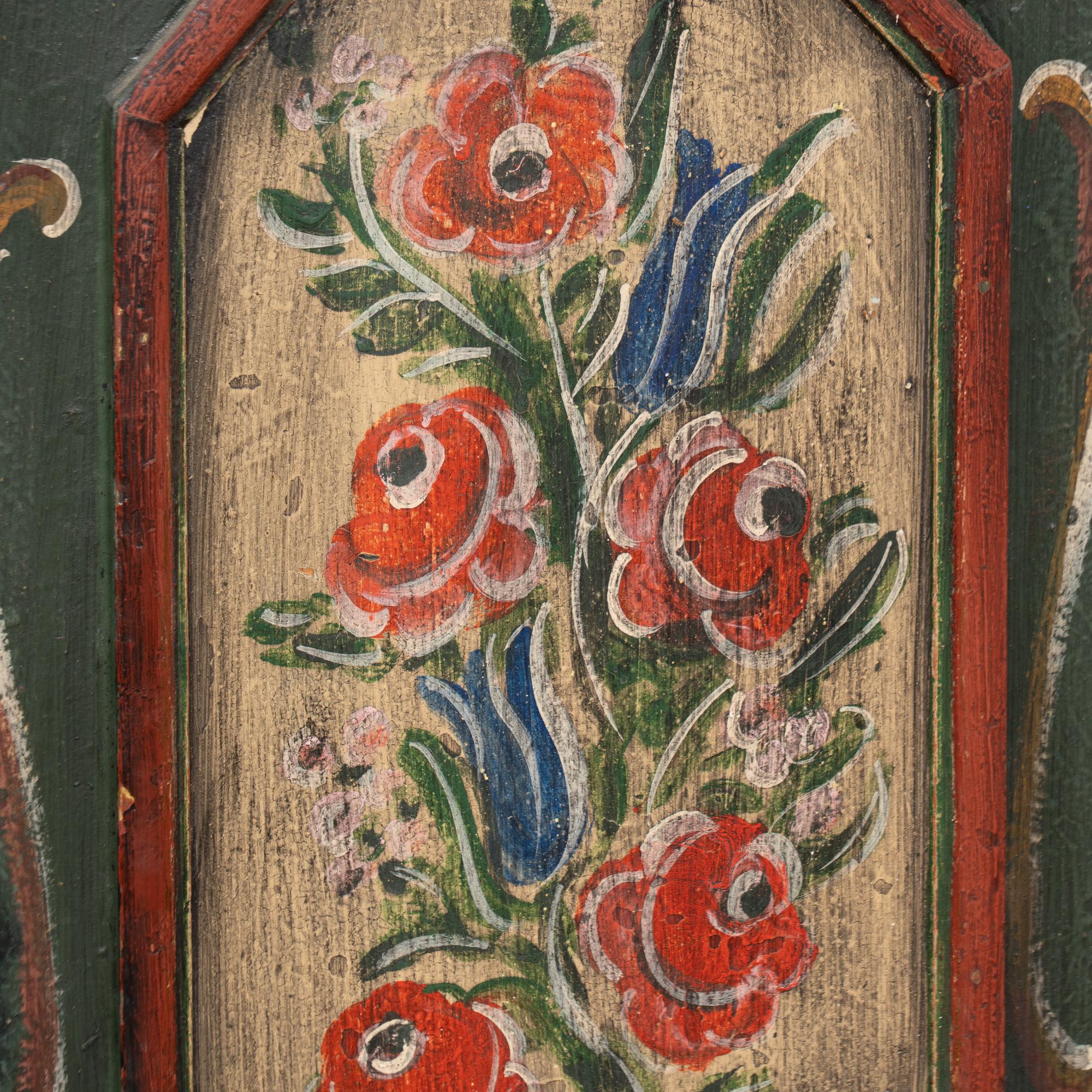 Historic use is reflected through its paint history and craftsmanship details, including small holes and cracks/gouges in the door fronts and back that may indicate an earlier repainting. Traditional German design elements and the original decorative palette give this piece strong character and presence.