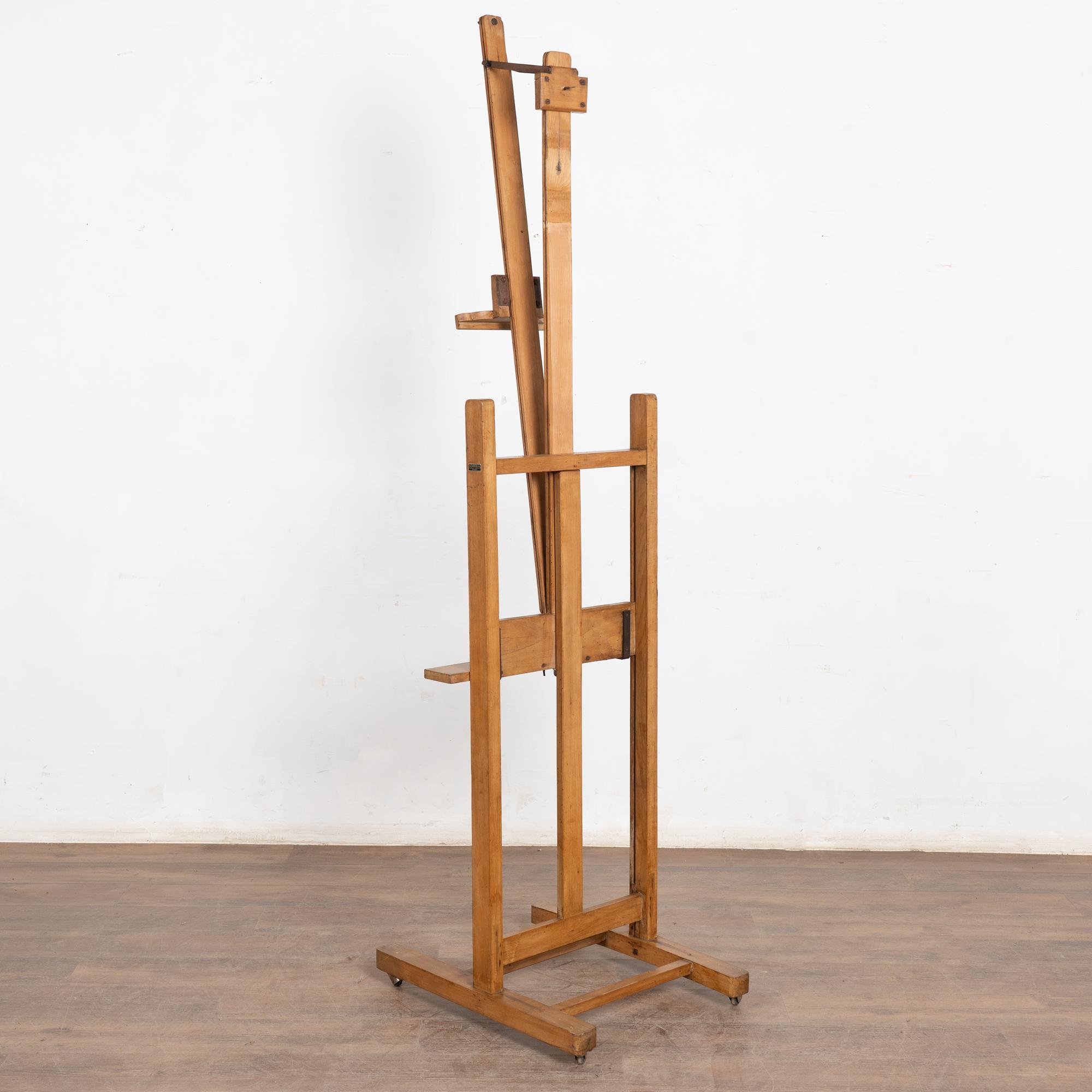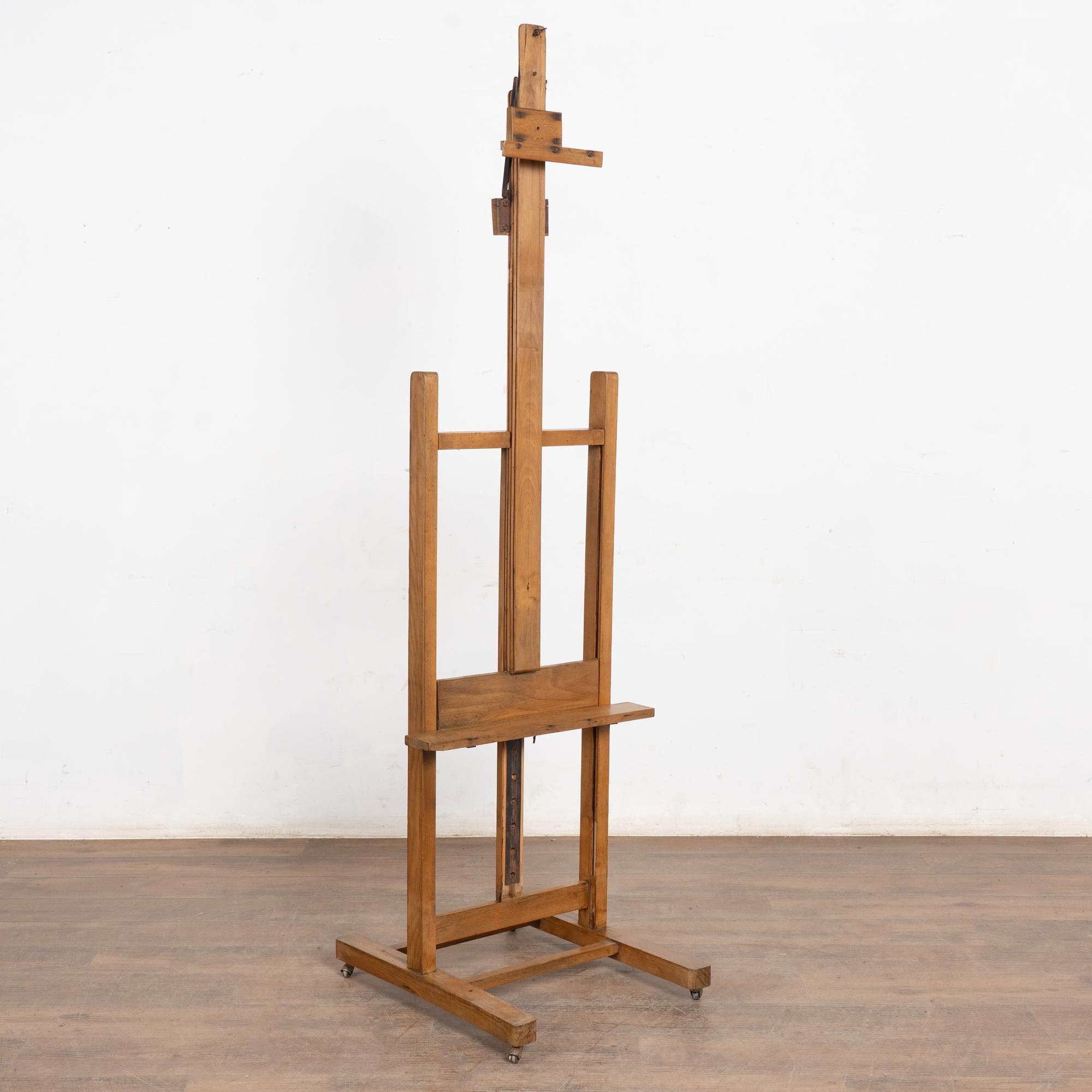 This vintage artist's easel rests on four casters. It reveals years of use as seen in the many paint spills, scratches, dings and areas of distress and wear throughout.