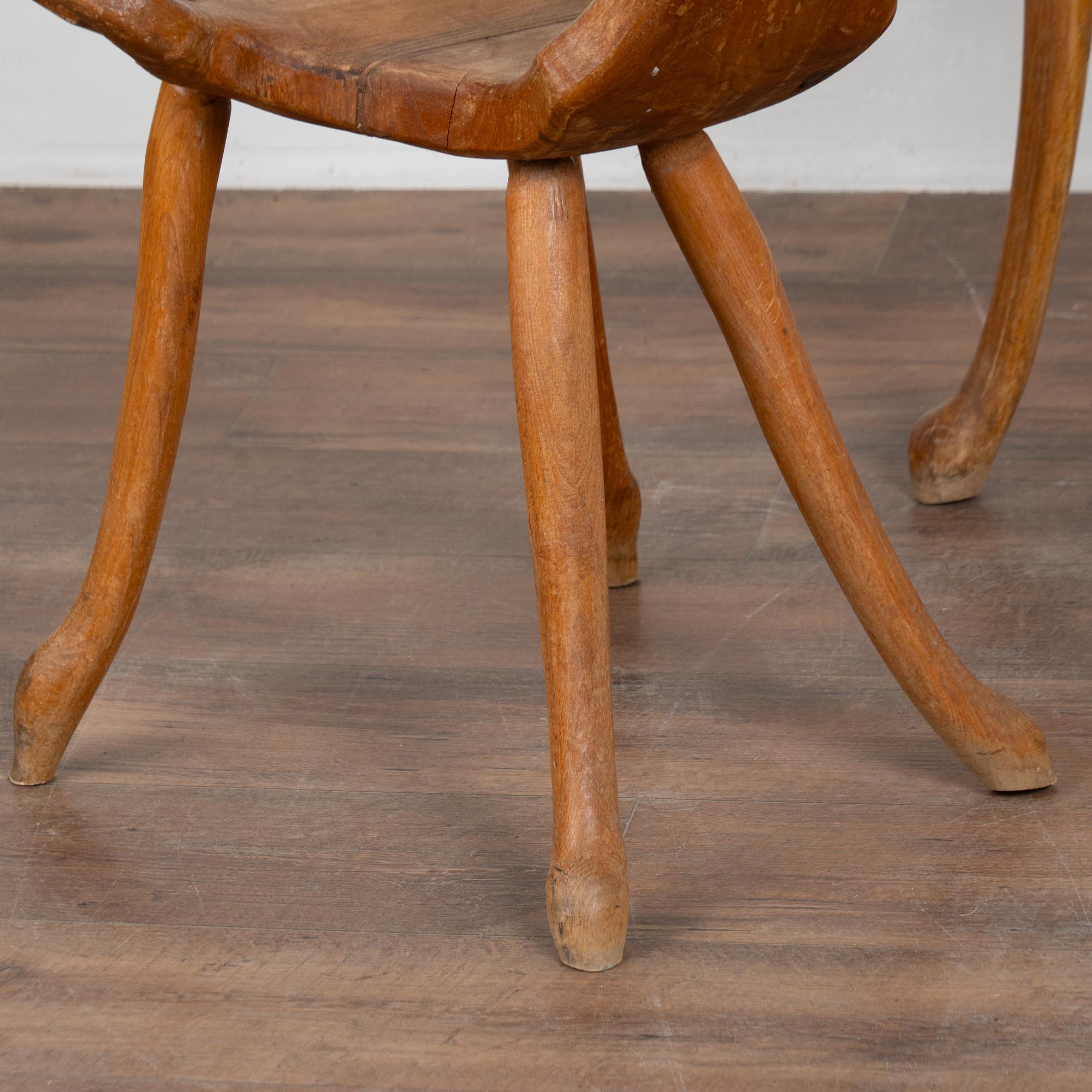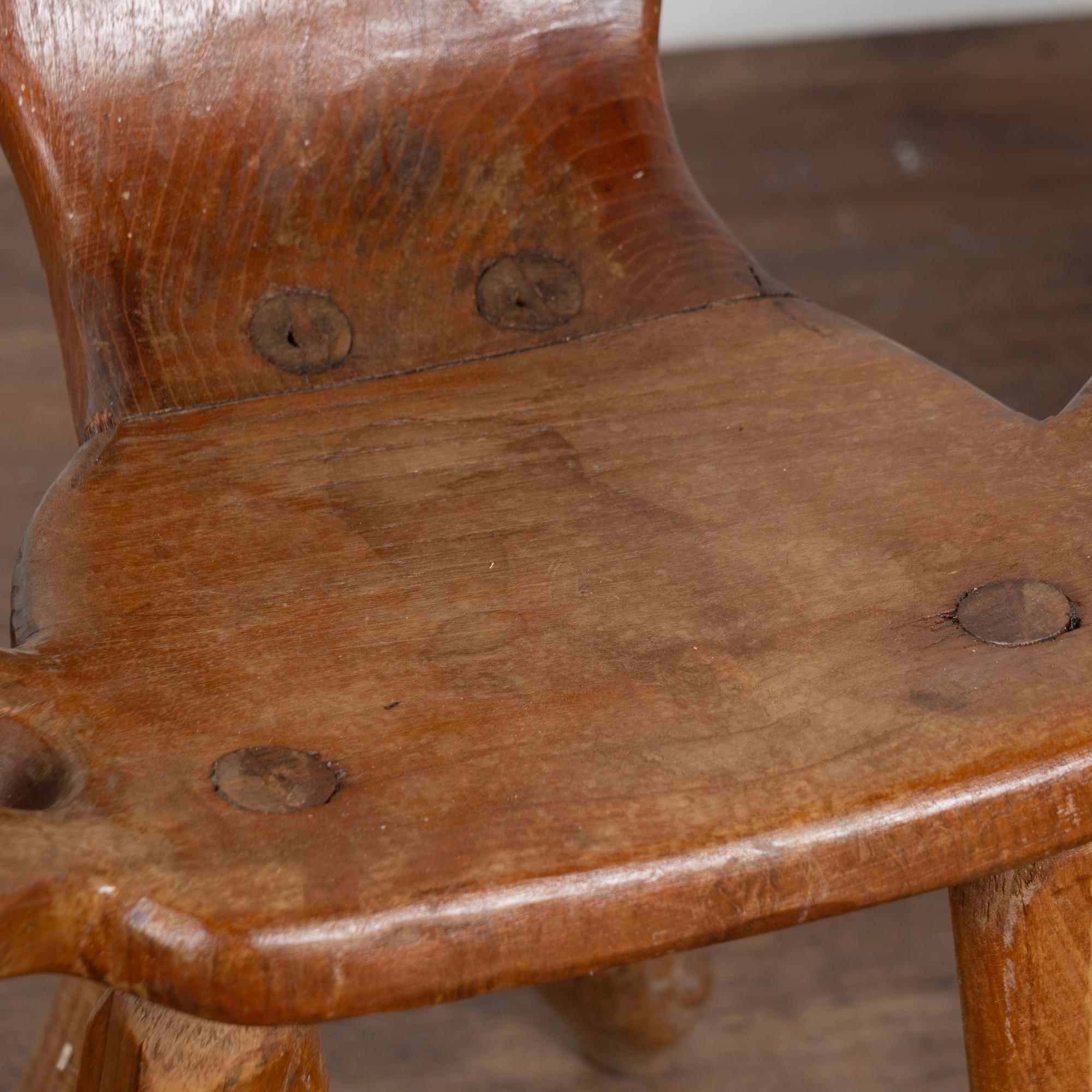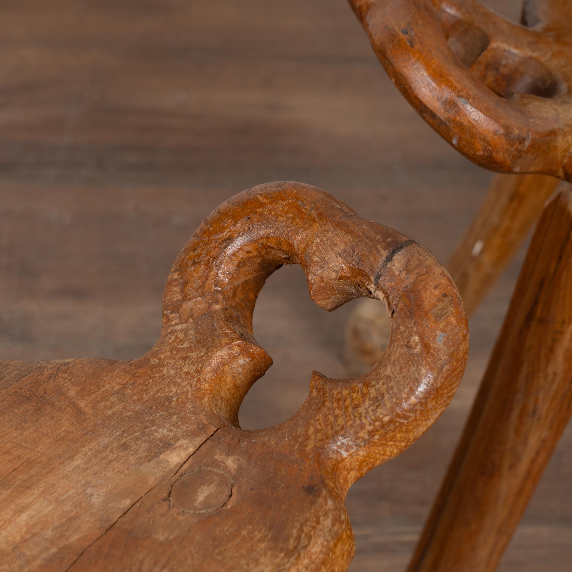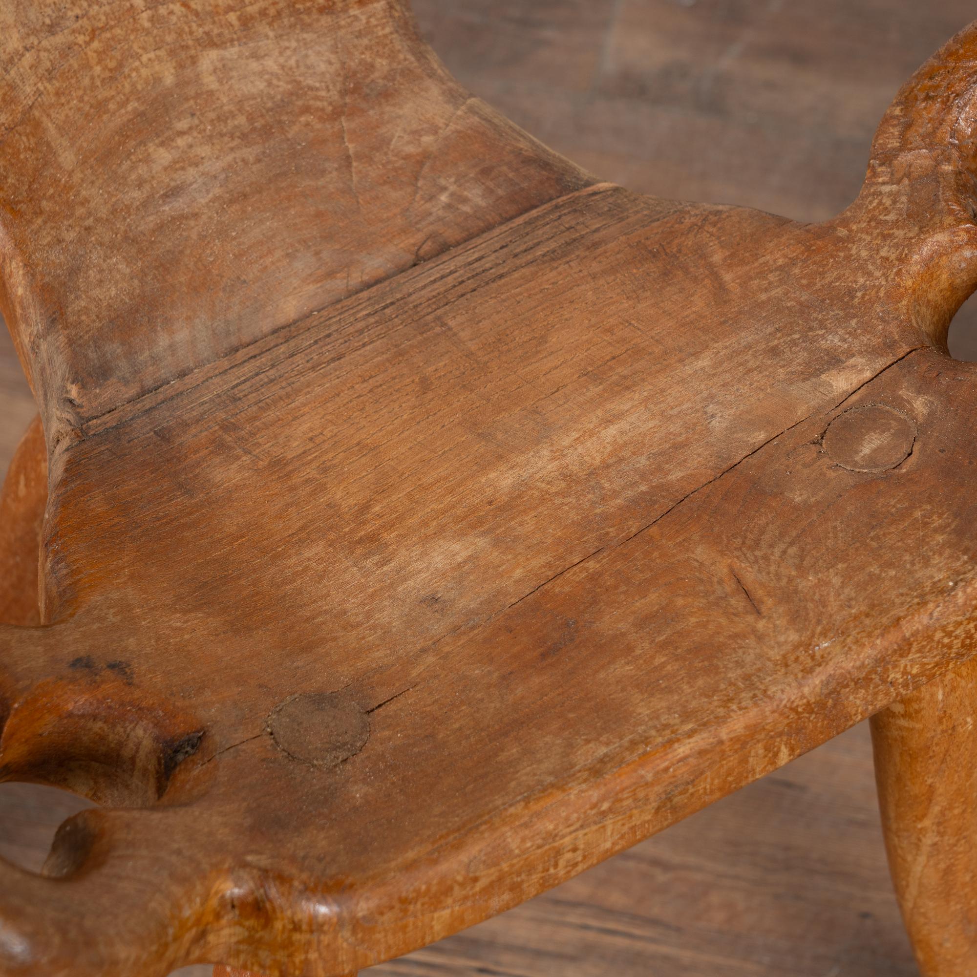 20th-century set of four Italian brutalist-style birthing chairs carved from solid hardwood. These sculptural chairs feature integrated handholds on each side, originally intended to assist with breathing and support during the birthing process. The curved seat and back are formed as a continuous sculptural shape, supported by four legs built directly into the design.