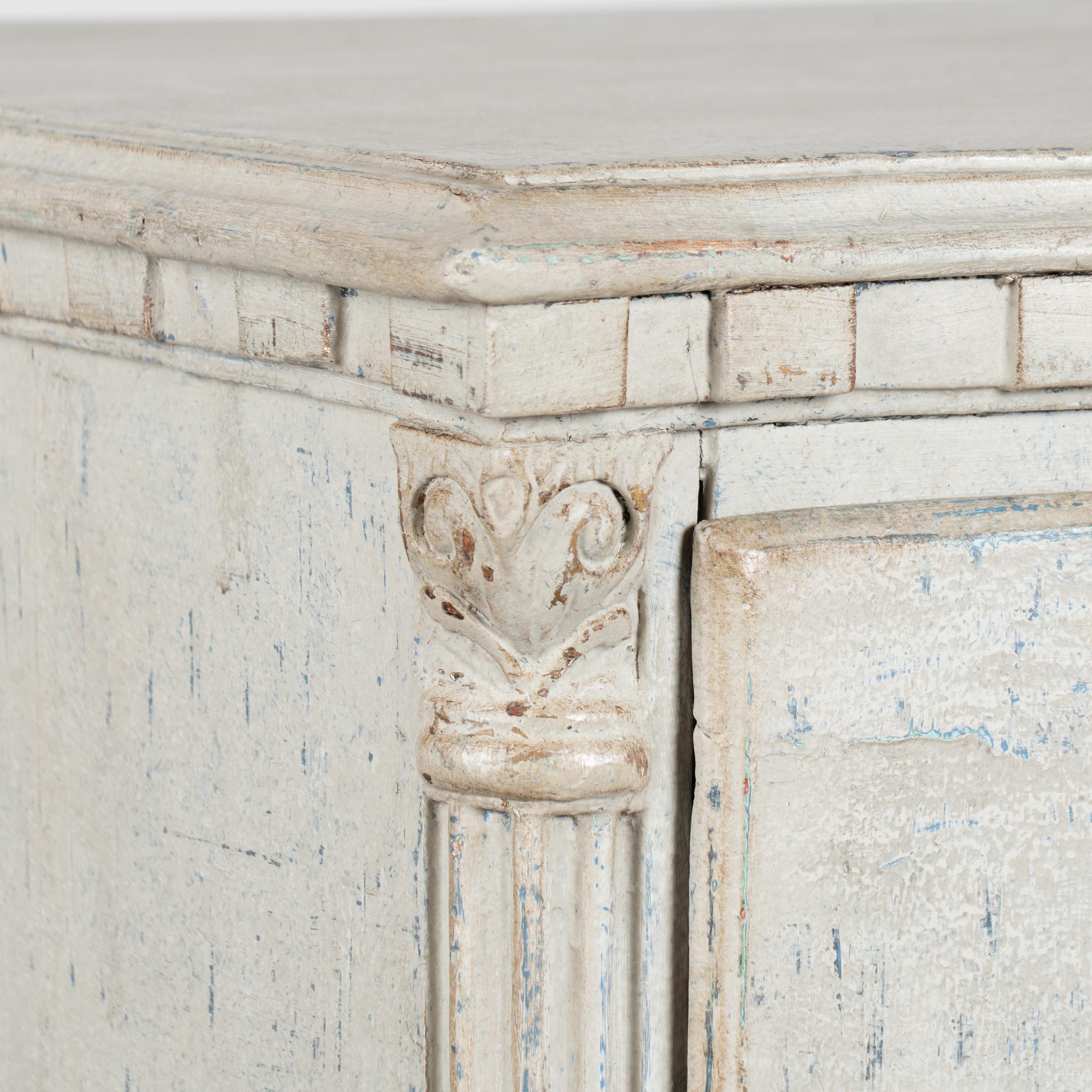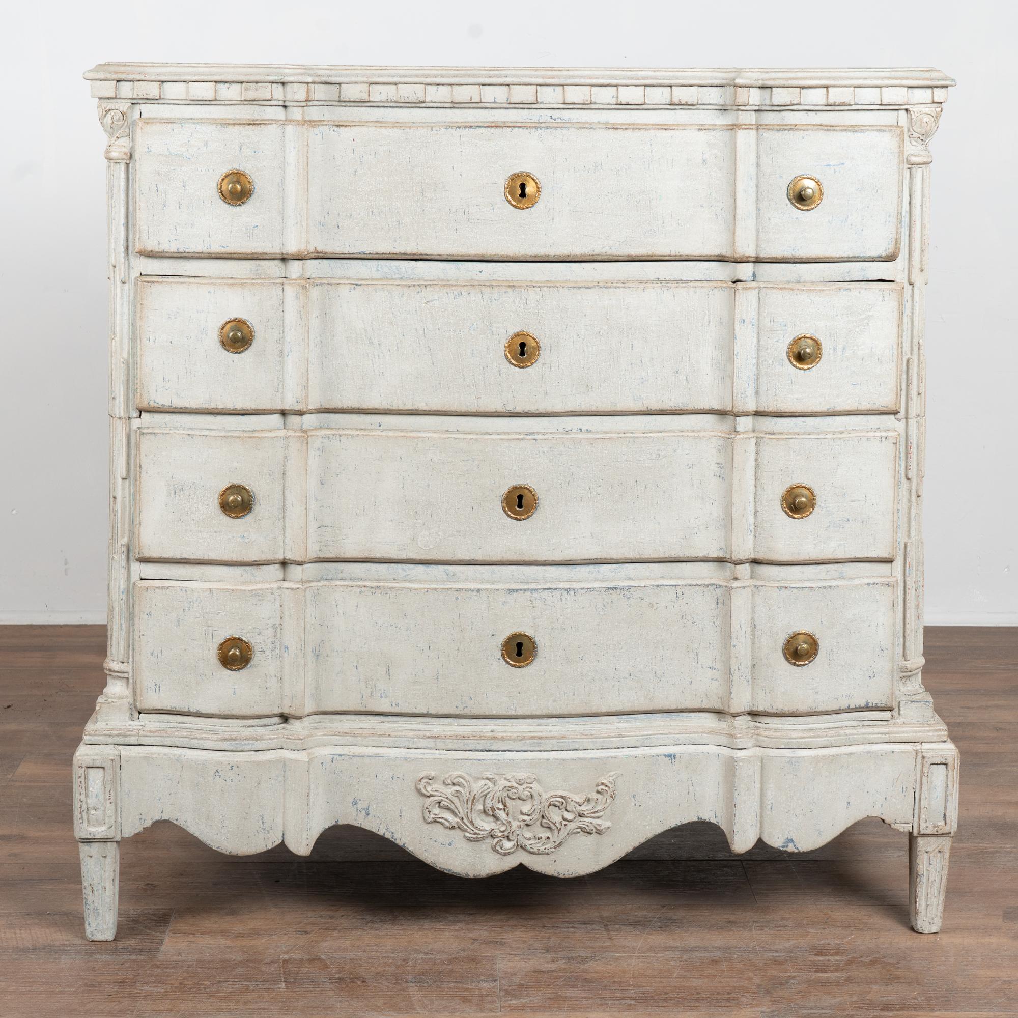 A newer professionally applied layered painted finish presents an overall antique white or light gray appearance with subtle blue undertones, chosen to complement the age, class, and form of the piece. Each drawer opens with two brass pulls; there are no locks or keys.