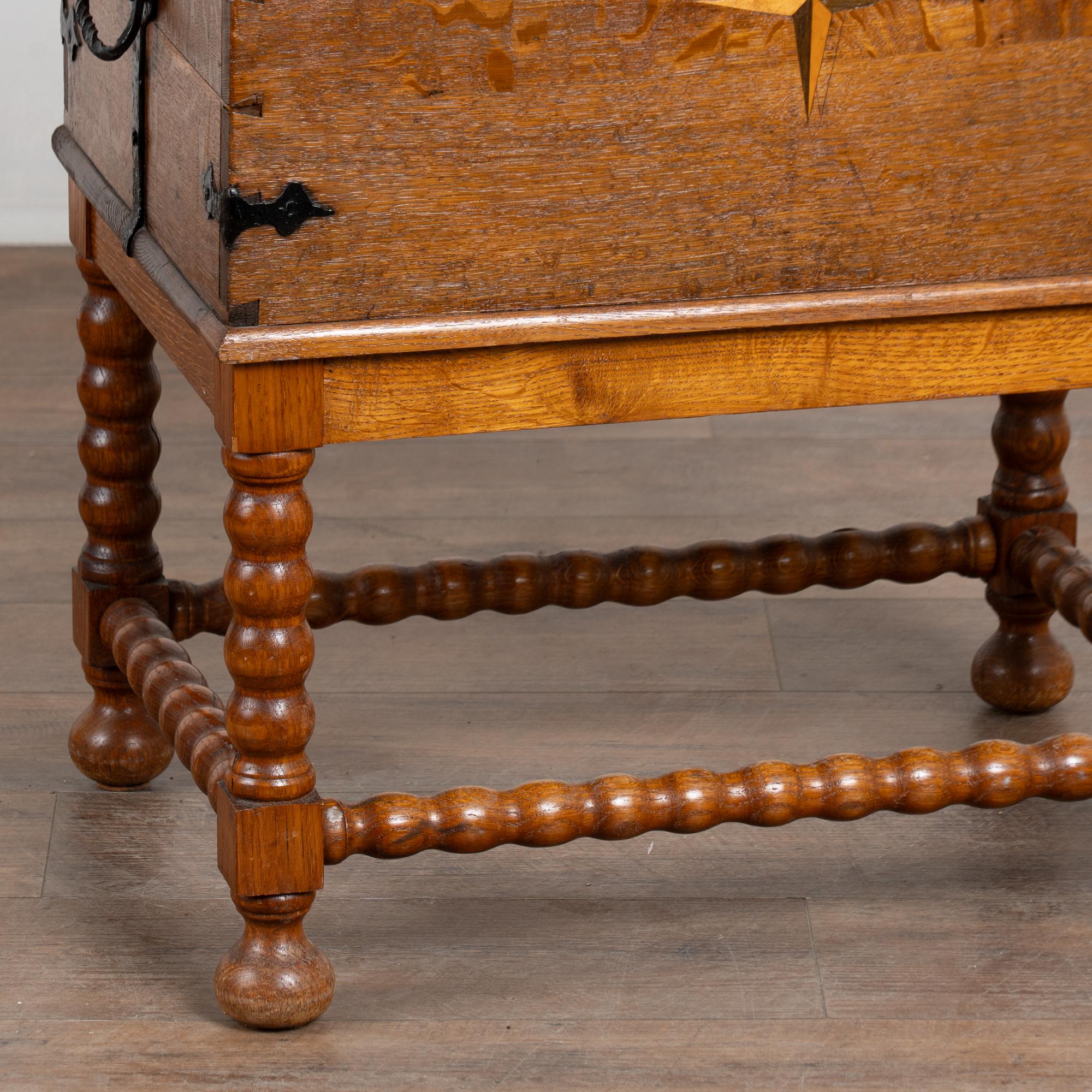 Early 19th-century oak trunk set on a later stand, now serving as a distinctive side table. The trunk features inlaid oak star motifs on both the top and front, complemented by hand-wrought iron corner brackets, side handles, and long iron hinges. The lock and key remain functional.
