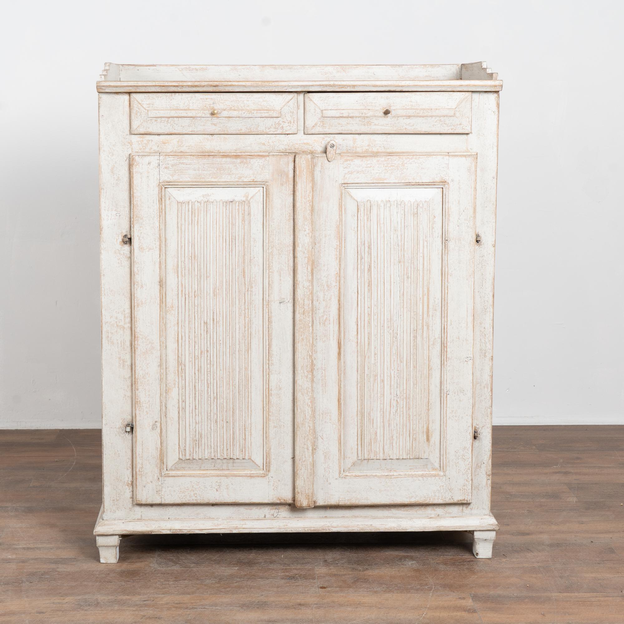 Swedish pine sideboard with fluted panel doors, painted finish in light gray with antique white undertones. The surface has been scraped and distressed, revealing the warm natural pine beneath and enhancing the piece’s aged character. The painted finish is old, but likely not original to the construction from the mid-1800's.