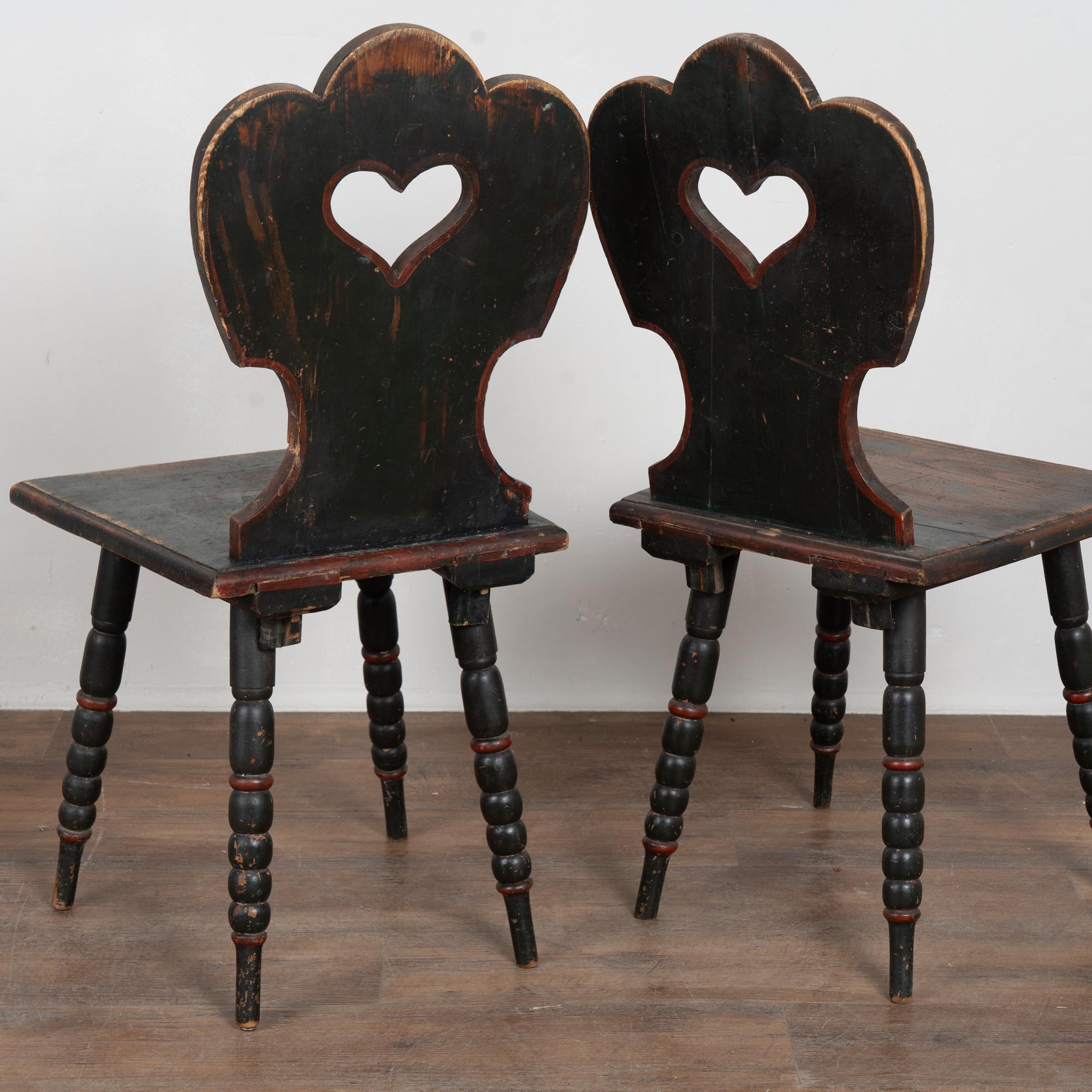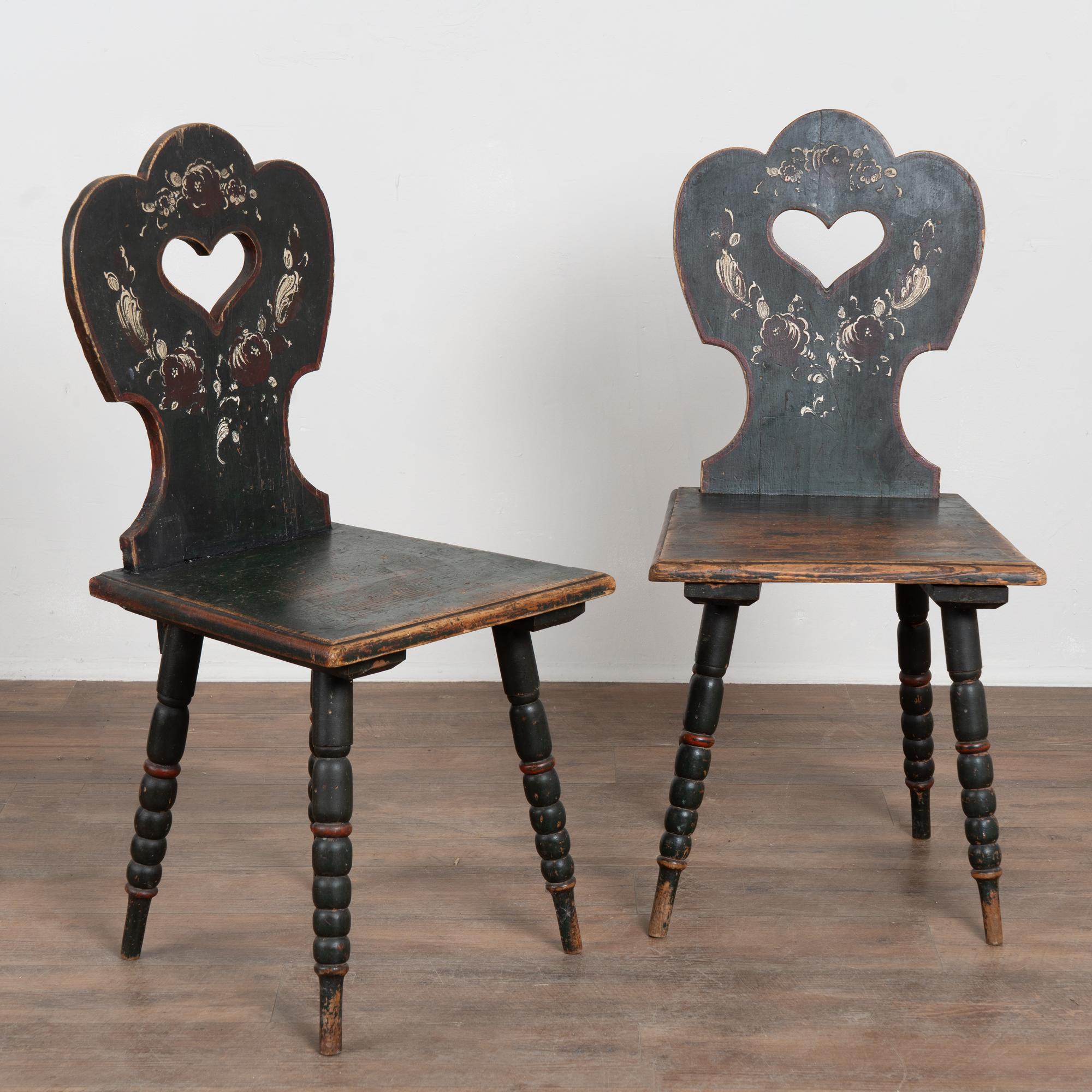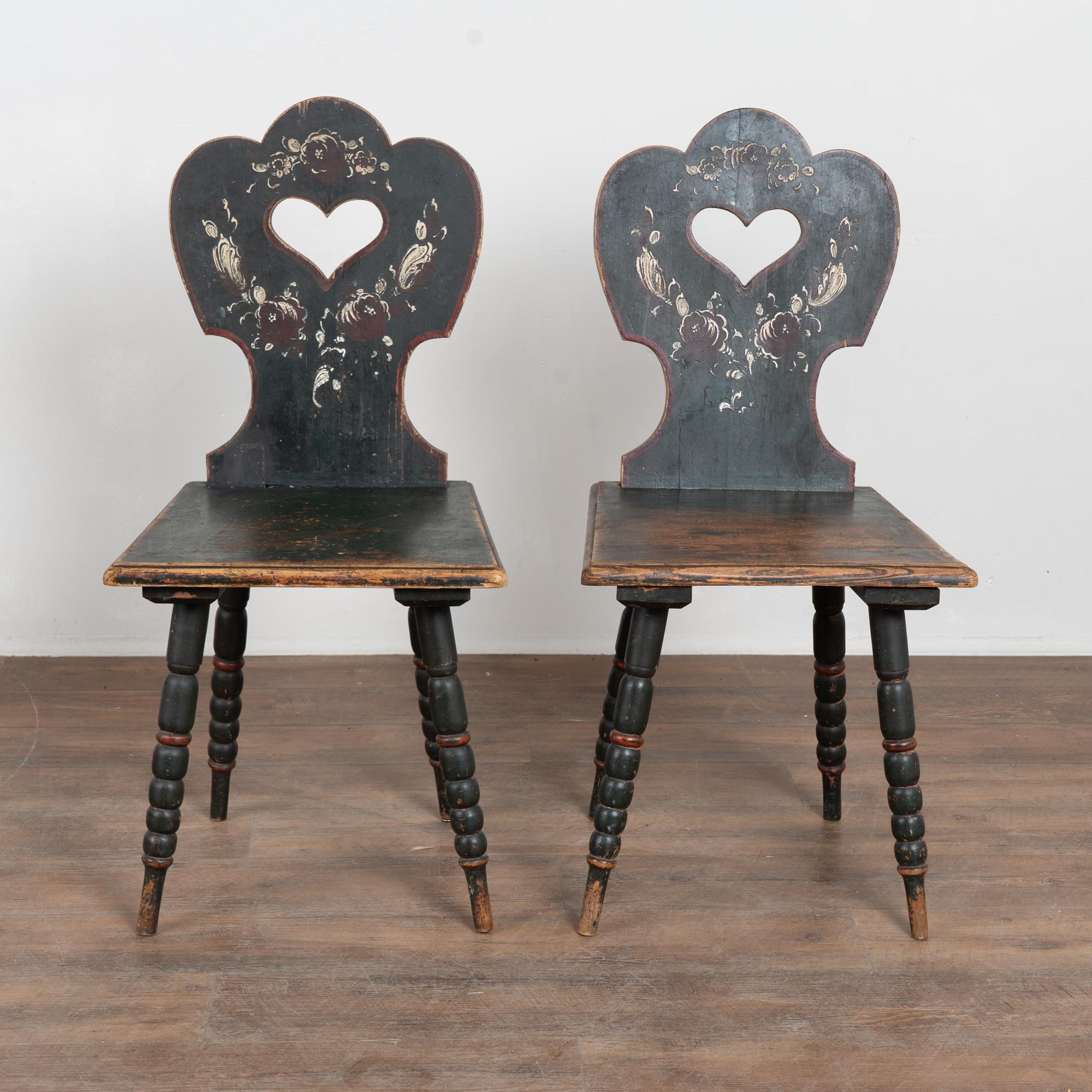 Pair of 19th-century hand-crafted folk art chairs made of pine with traditional turned legs and heart-shaped cutout backs. They retain their original painted finishes in dark forest green and are accented with deep burgundy red trim and red-and-white floral motifs.