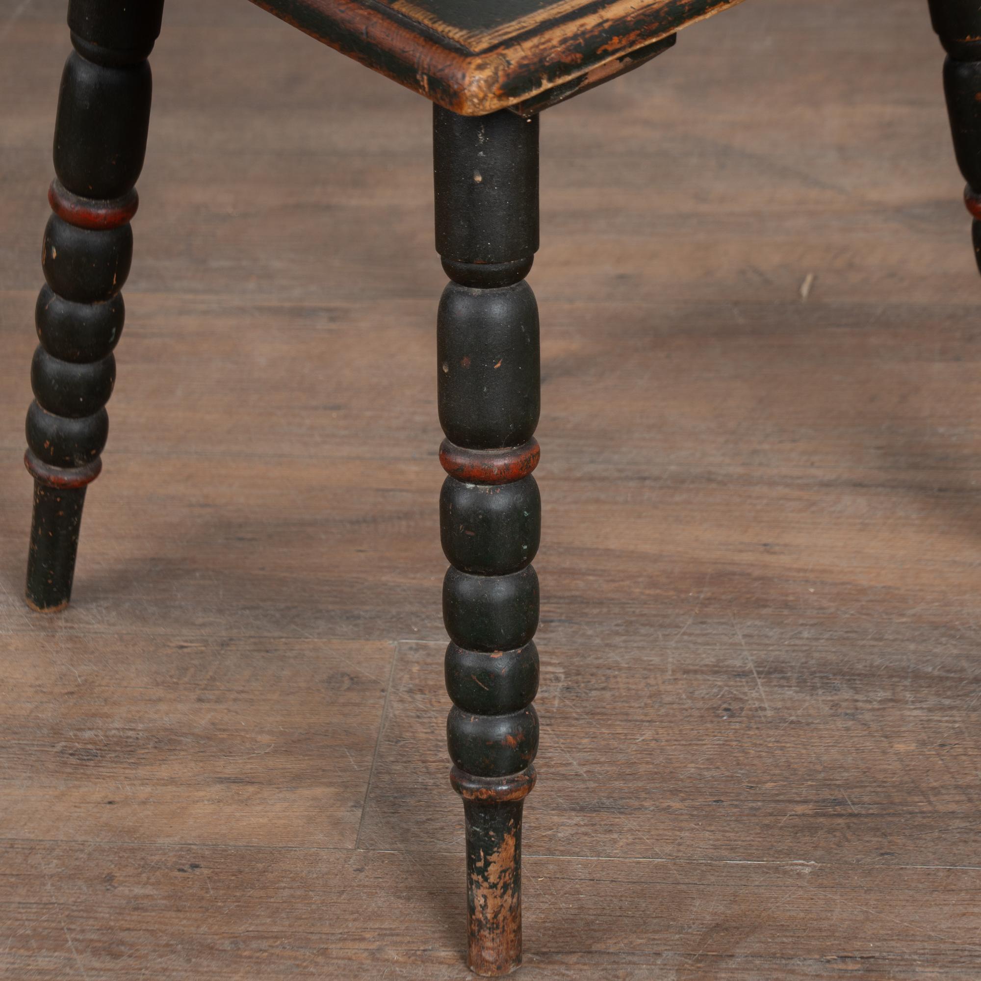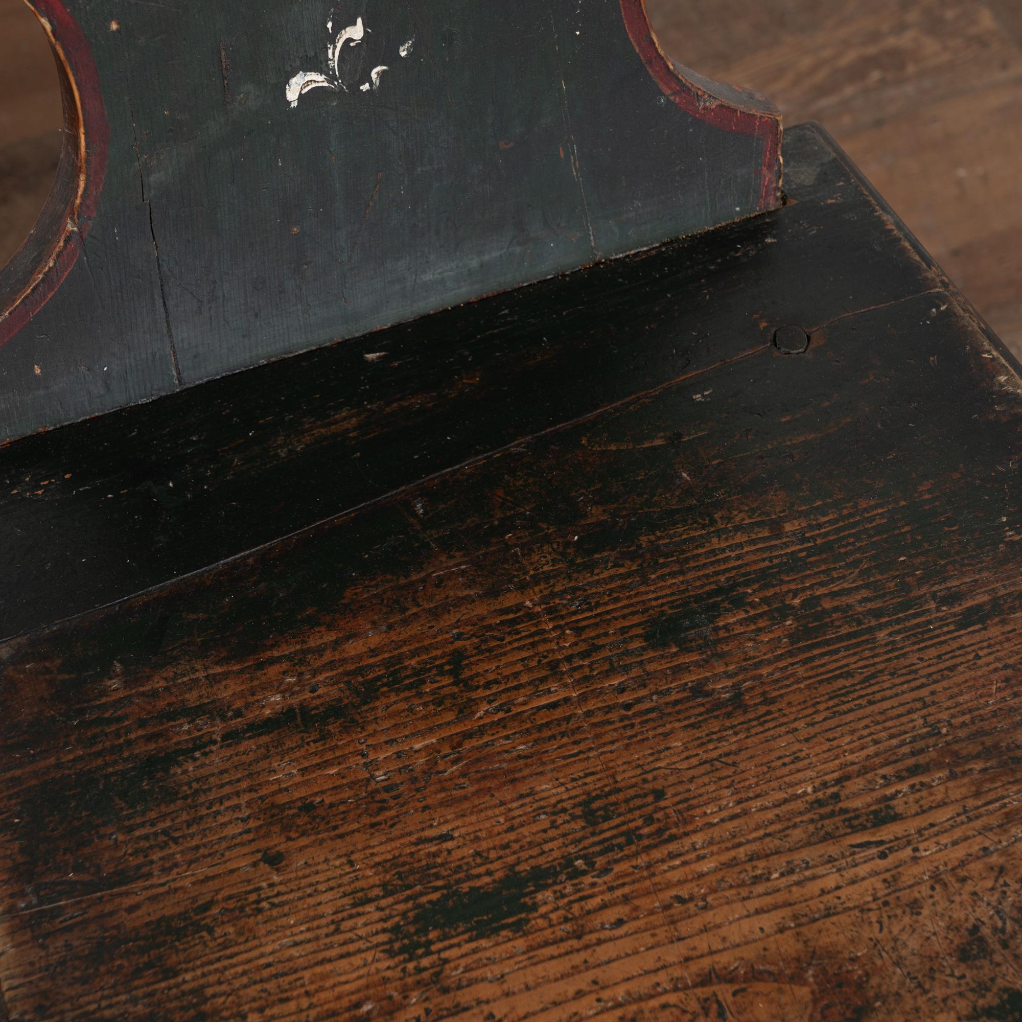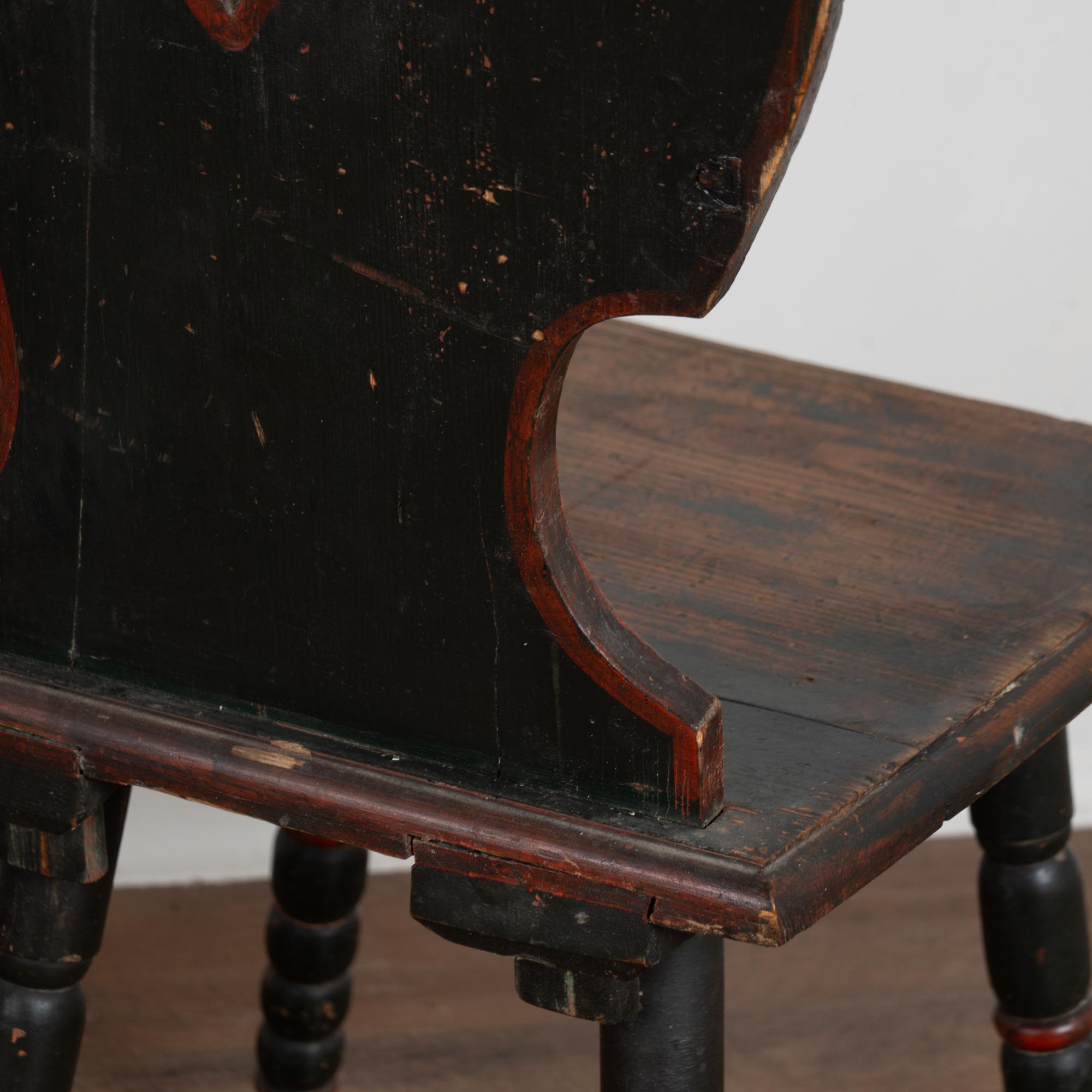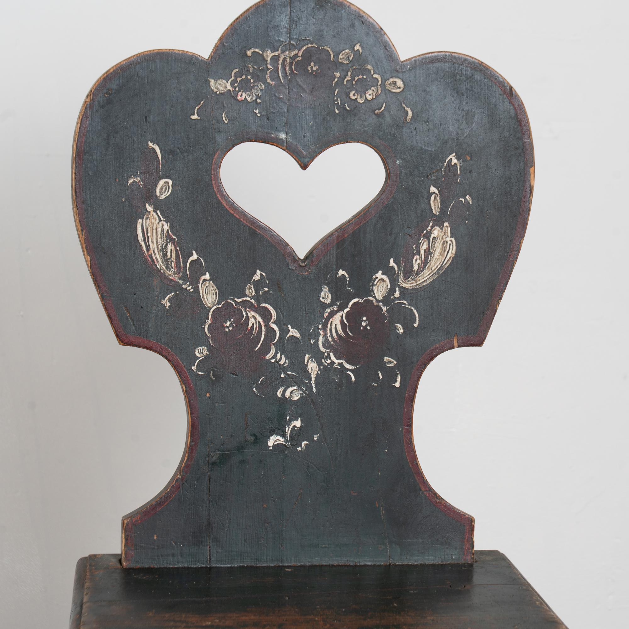 Pair of 19th-century hand-crafted folk art chairs made of pine with traditional turned legs and heart-shaped cutout backs. They retain their original painted finishes in dark forest green and are accented with deep burgundy red trim and red-and-white floral motifs.