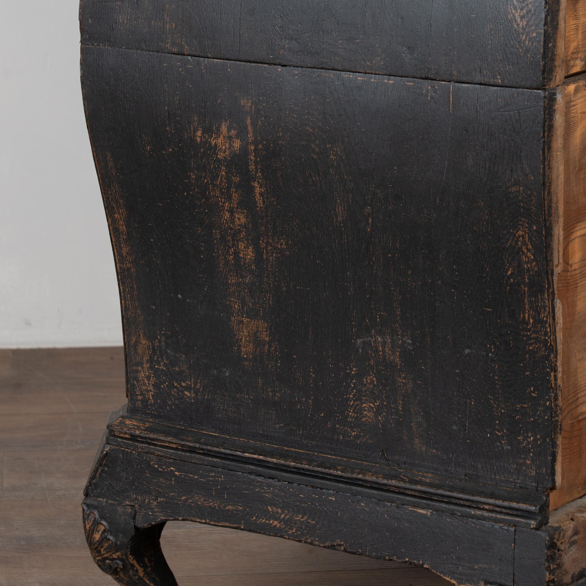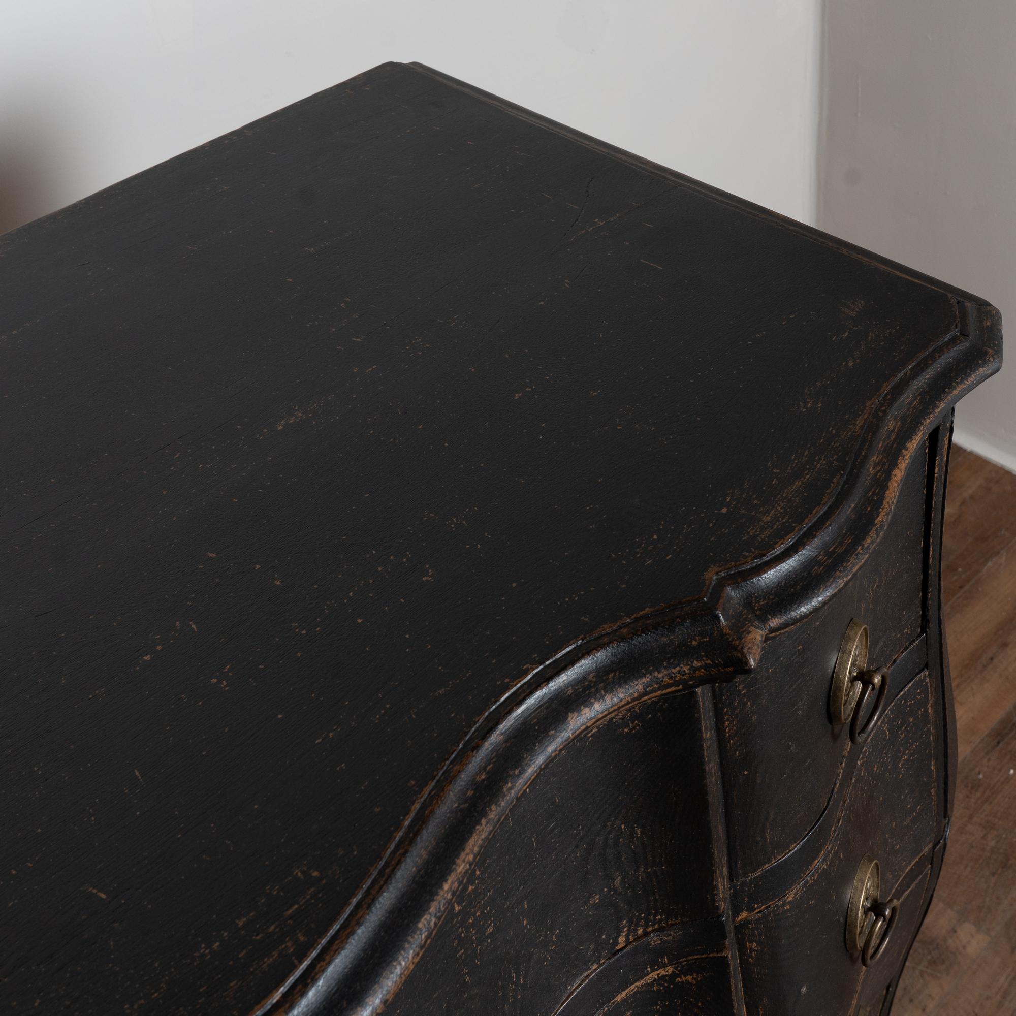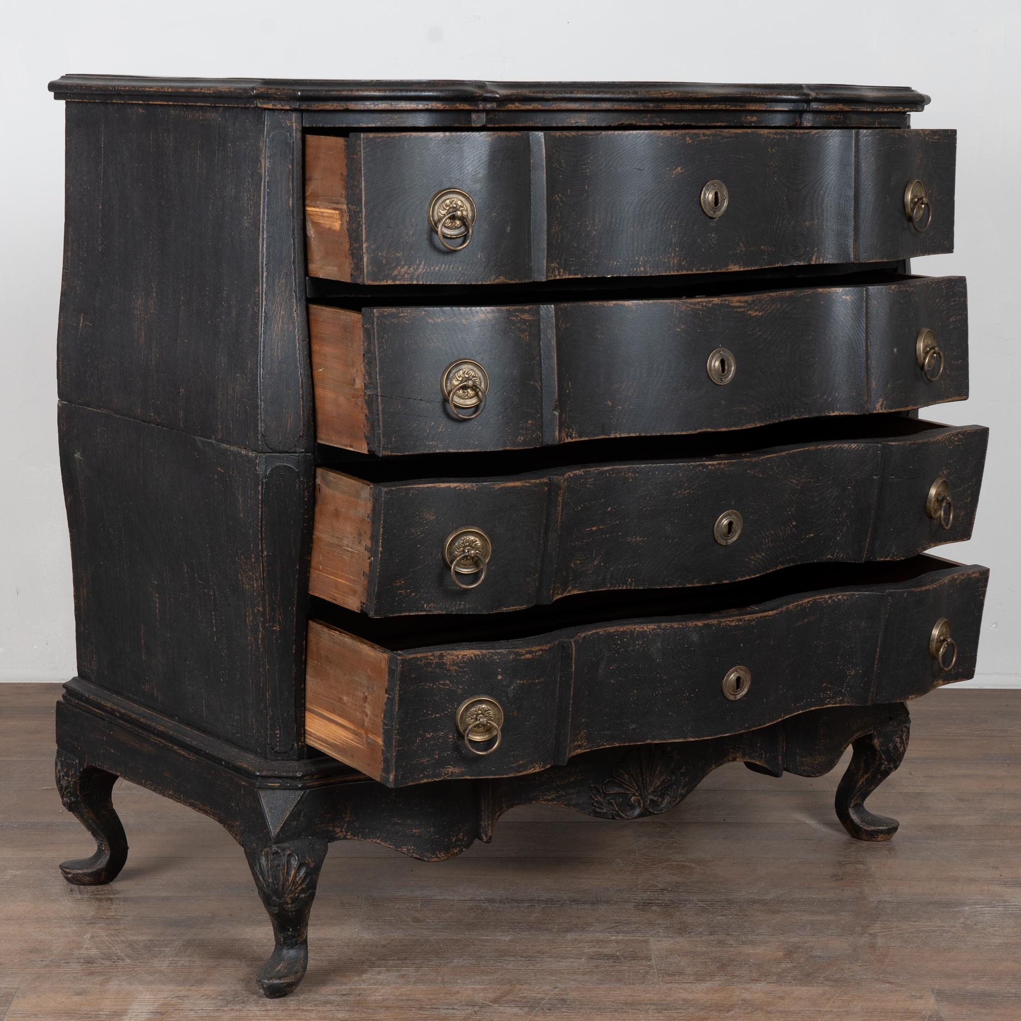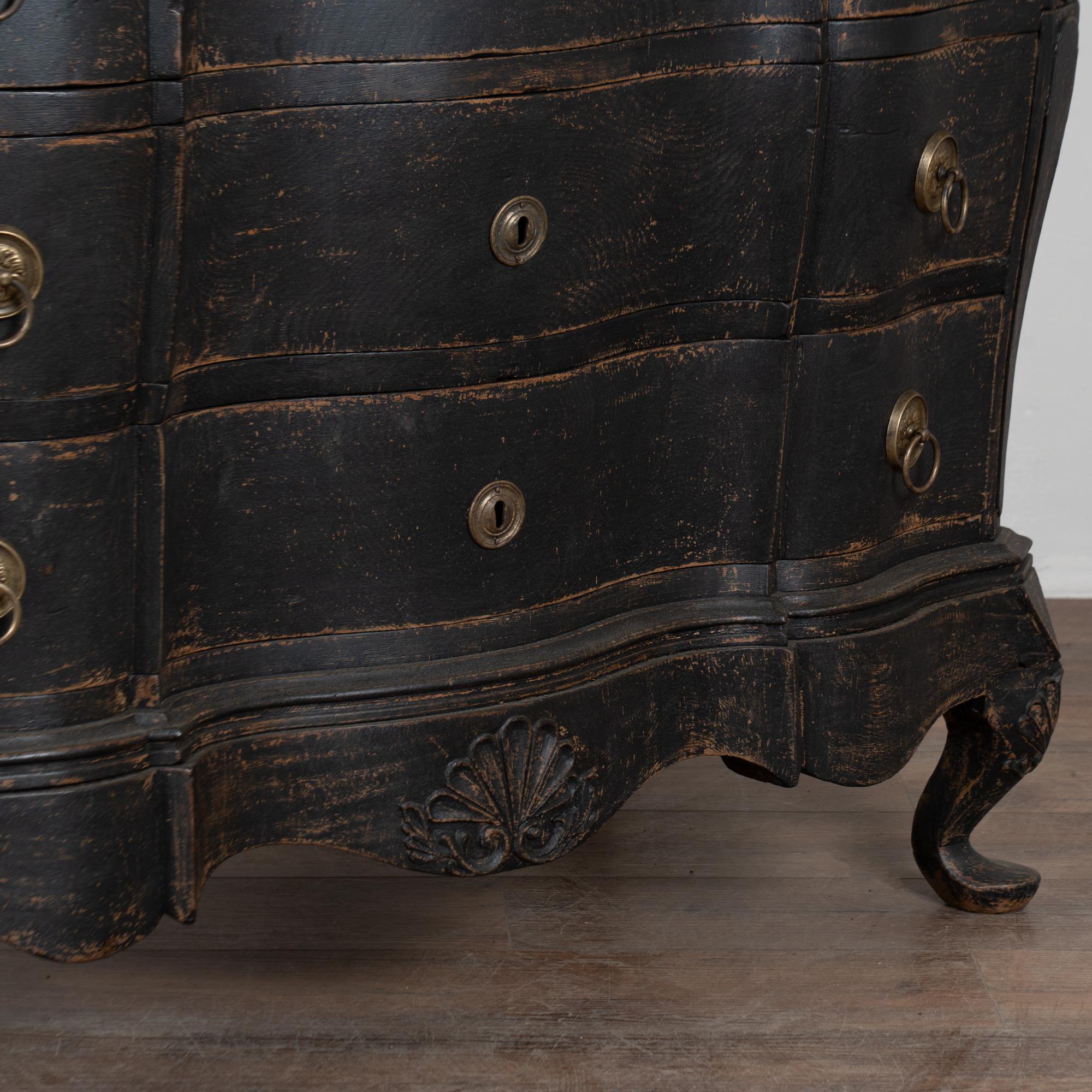 Large 18th-century Danish oak chest of drawers featuring a dramatic rococo serpentine front and substantial proportions. The chest has a newer professionally applied layered black painted finish, lightly distressed to reveal natural oak beneath and suit the aged character of this early piece. It rests on a carved scalloped skirt with curvaceous feet, adding strong visual presence.