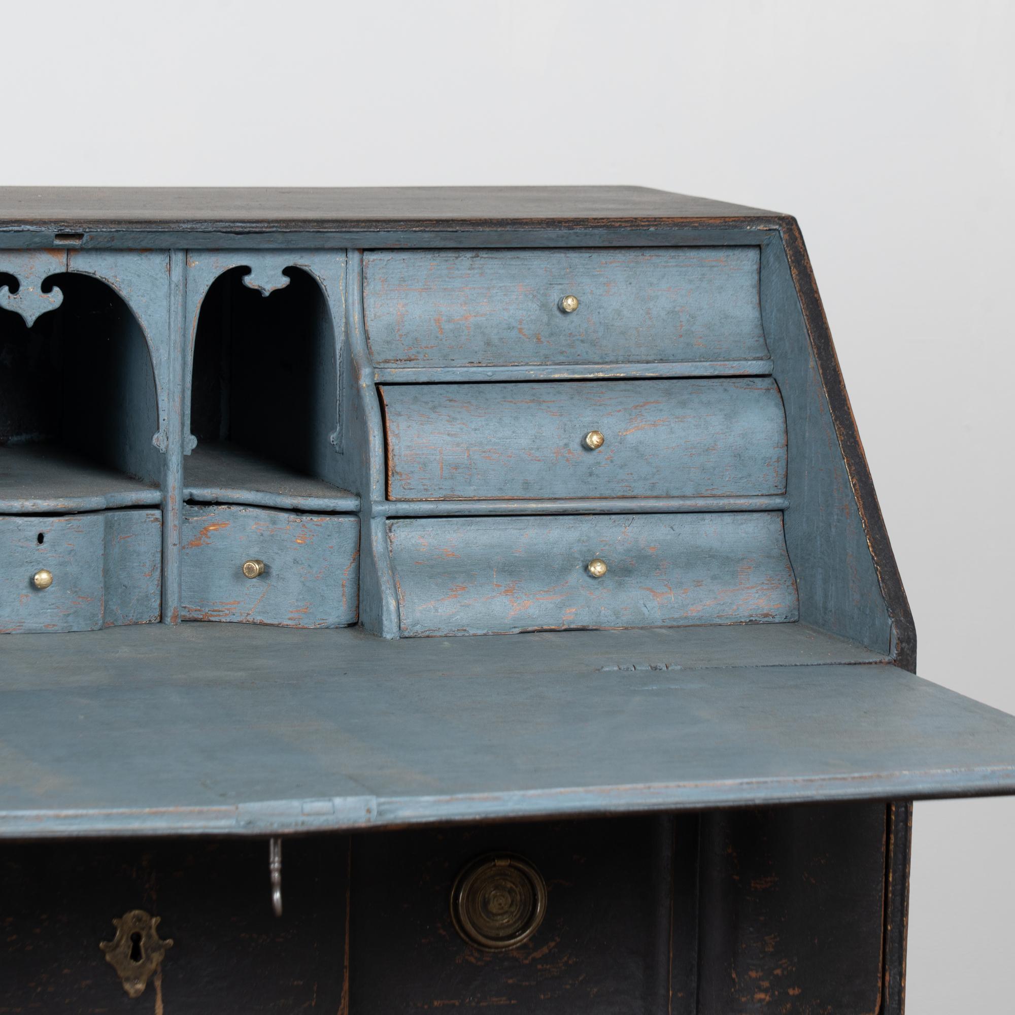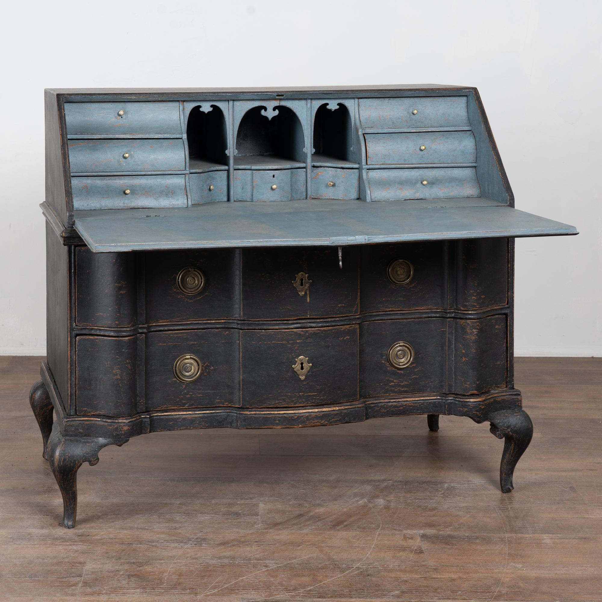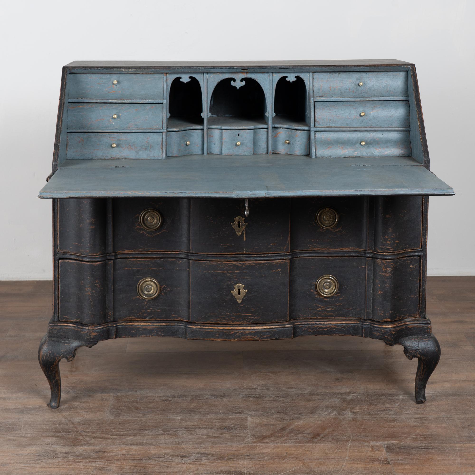 Early 19th-century Danish pine secretary bureau with a newer professionally applied layered black painted finish, selected to suit the age and style of the piece. The lower drawers feature a serpentine front that adds a graceful, romantic profile, with the lowest drawer divided into three interior sections. Drawer bottoms show typical age-related cracks and separation.
