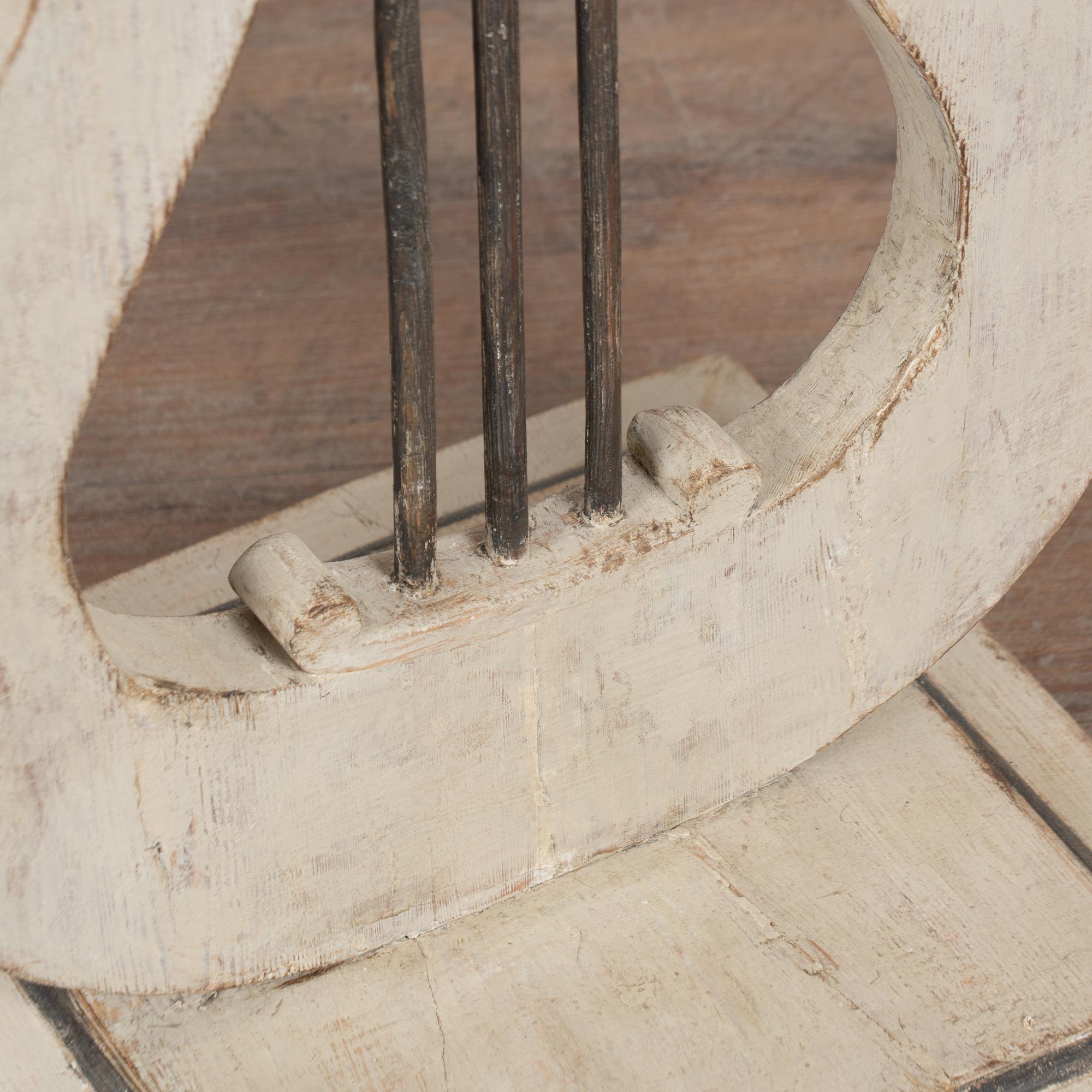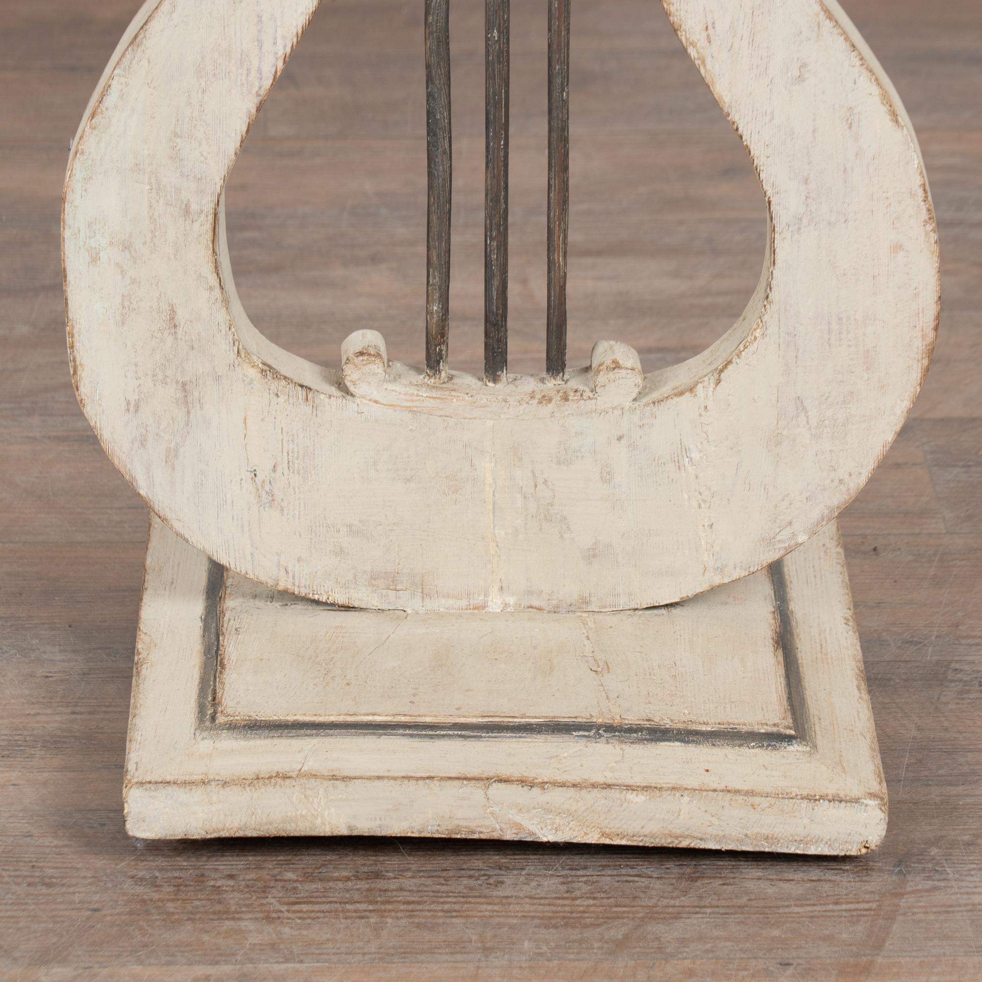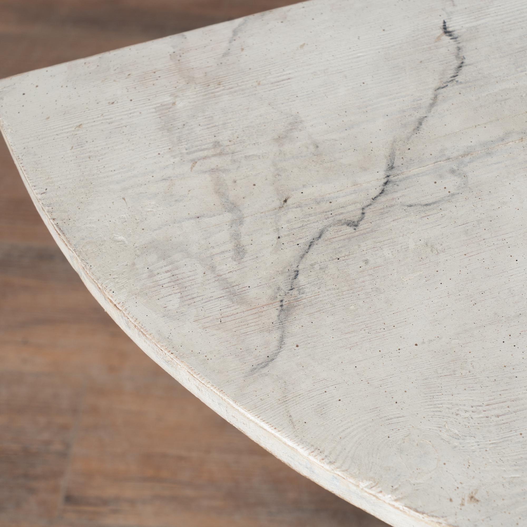 19th-century Swedish pine console table in a demilune, or half-circle form with a harp-shaped base. The table retains an antique white painted finish (while old, not original to the piece) with a contrasting traditional painted faux marble top, together presenting an overall soft gray tone. The base is accented with faded black trim, adding contrast to the painted surface.