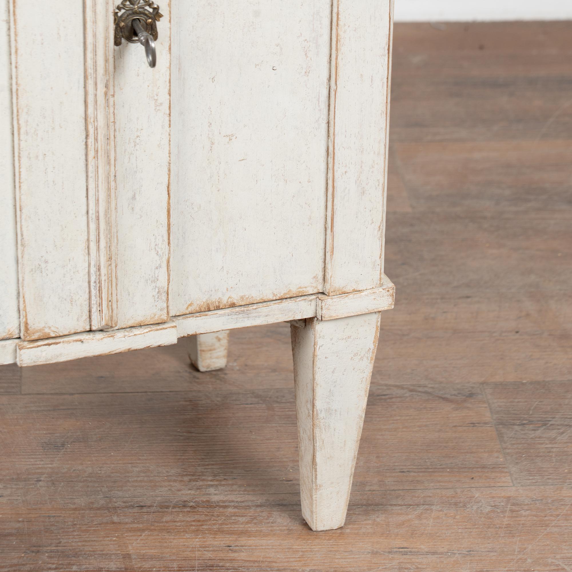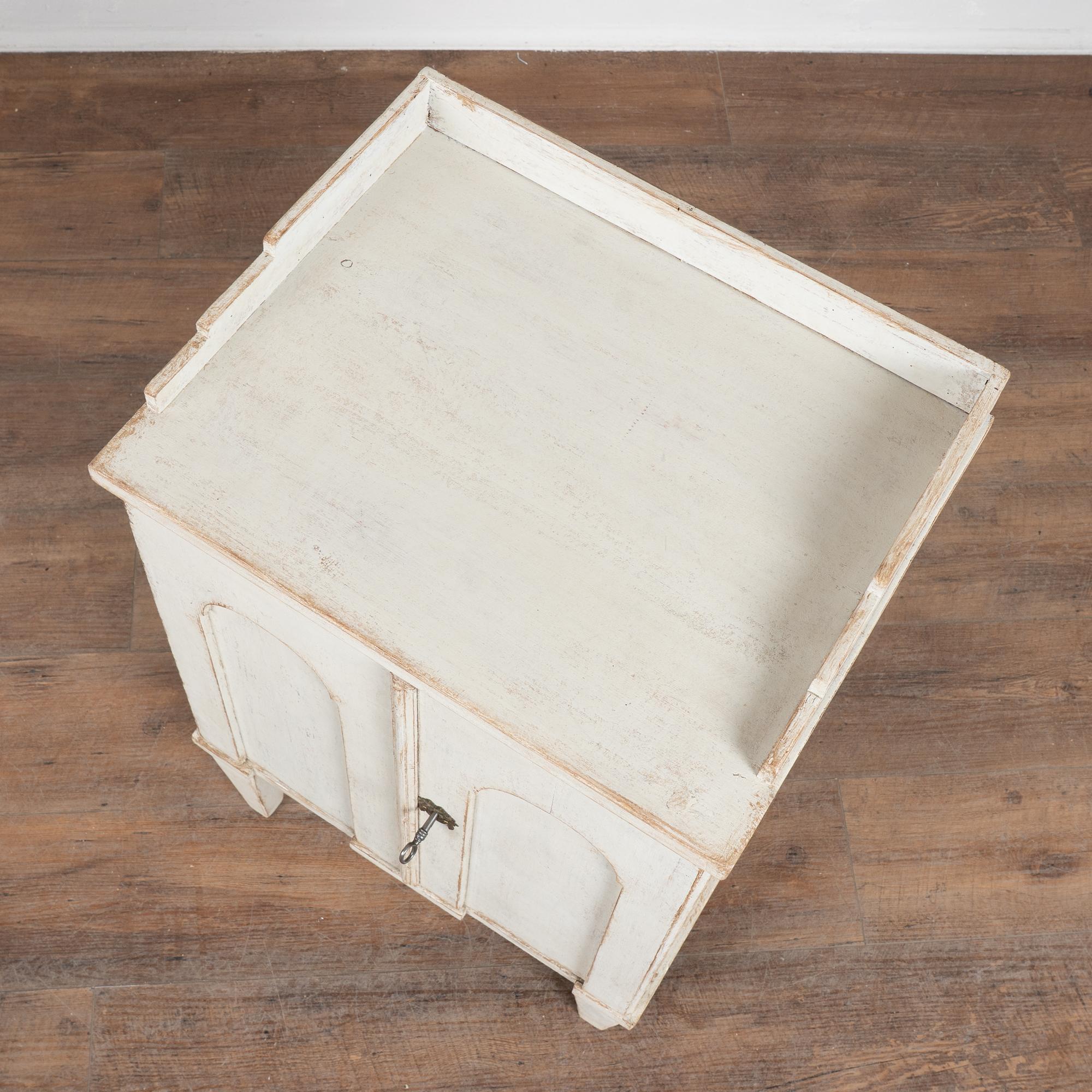 19th-century Swedish pine nightstand with a newer professionally applied antique white painted finish, lightly distressed to complement the age and character of the piece. The cabinet interior contains one shelf and a lower divided drawer, offering practical storage. Simple arched panel doors and understated trim along the sides and back contribute to its simple country profile.