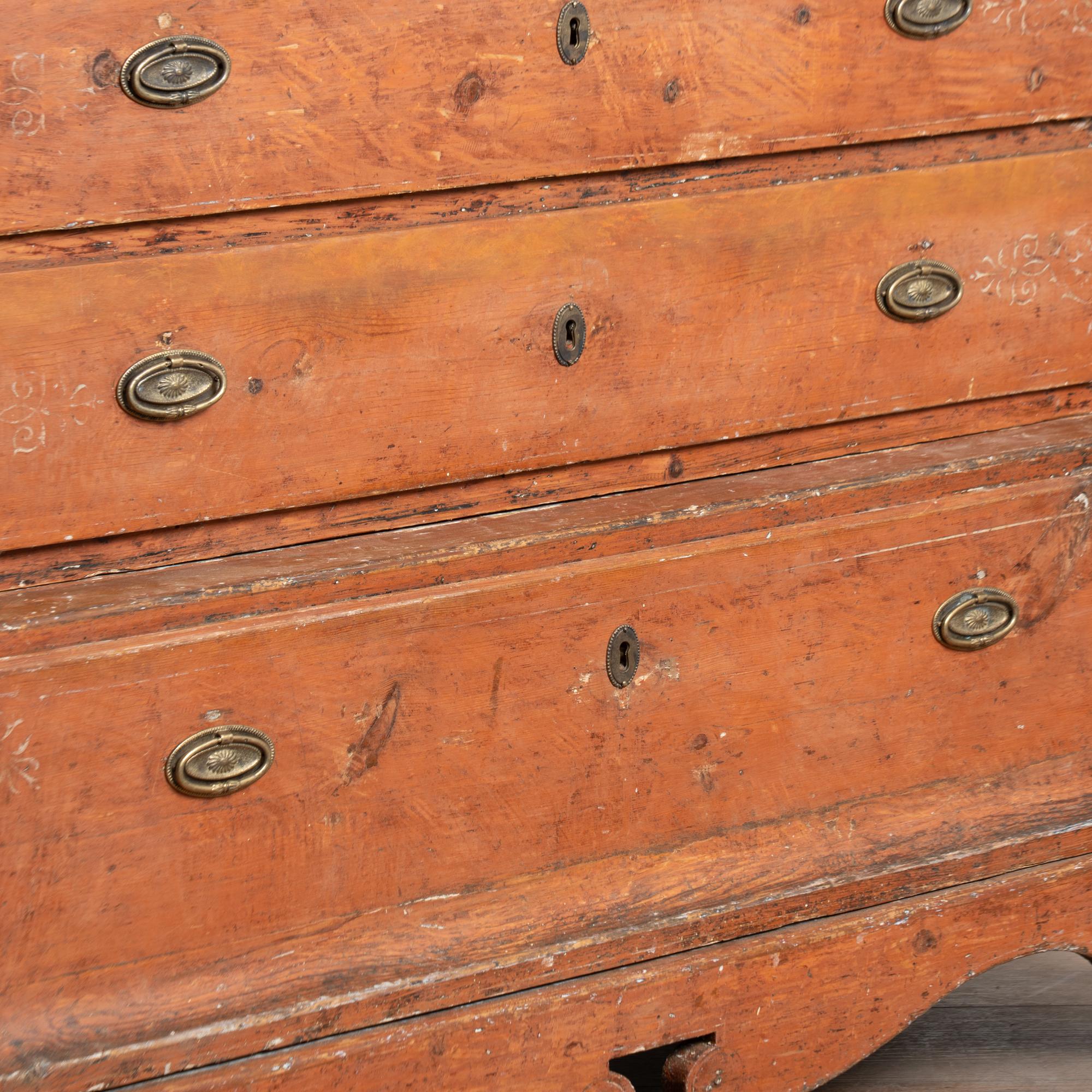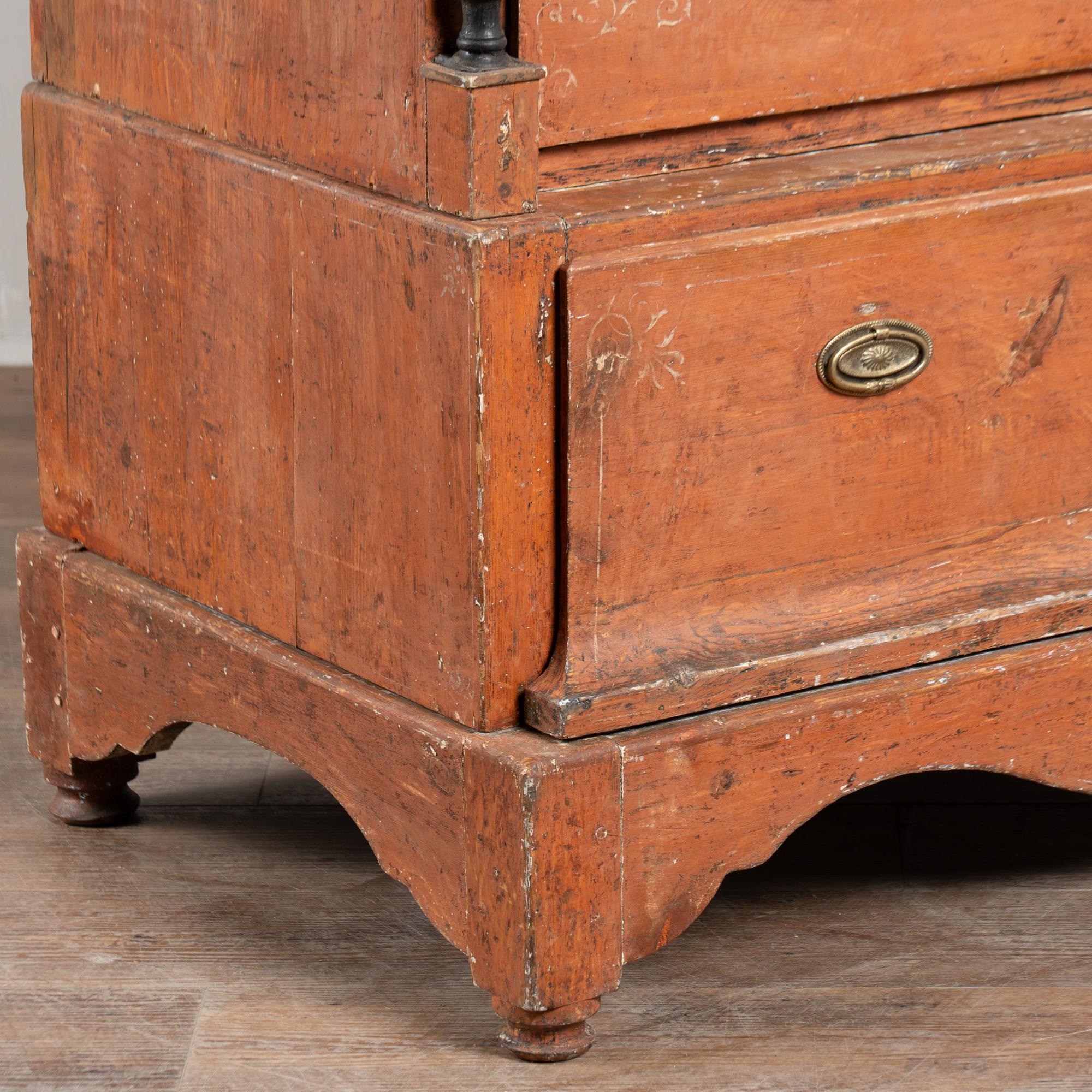 Early 19th-century Danish pine chest of five drawers retaining its original brick red painted finish. The chest is constructed in two sections and features turned black painted columns, a scalloped skirt, and black beaded detailing along the crown, all characteristic of country Biedermeier design. While Biedermeier furniture is often associated with glossy yellow and black finishes, this pine example reflects a rural interpretation of the style.